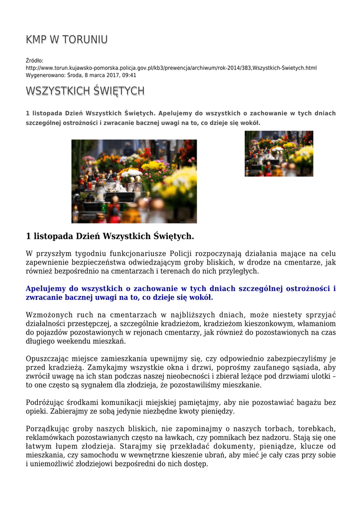 KMP W TORUNIU Źródło: http://www.torun.kujawsko-pomorska.policja.gov.pl/kb3/prewencja/archiwum/rok-2014/383,Wszystkich-Swietych.html Wygenerowano: Środa, 8 marca 2017, 09:41 WSZYSTKICH ŚWIĘTYCH 1 listopada Dzień Wszystkich Świętych. Apelujemy do wszystkich o zachowanie w tych dniach szczególnej ostrożności i zwracanie bacznej uwagi na to, co dzieje się wokół. 1 listopada Dzień Wszystkich Świętych. W przyszłym tygodniu funkcjonariusze Policji rozpoczynają działania mające na celu zapewnienie bezpieczeństwa odwiedzającym groby bliskich, w drodze na cmentarze, jak również bezpośrednio na cmentarzach i terenach do nich przyległych. Apelujemy do wszystkich o zachowanie w tych dniach szczególnej ostrożności i zwracanie bacznej uwagi na to, co dzieje się wokół. Wzmożonych ruch na cmentarzach w najbliższych dniach, może niestety sprzyjać działalności przestępczej, a szczególnie kradzieżom, kradzieżom kieszonkowym, włamaniom do pojazdów pozostawionych w rejonach cmentarzy, jak również do pozostawionych na czas długiego weekendu mieszkań. Opuszczając miejsce zamieszkania upewnijmy się, czy odpowiednio zabezpieczyliśmy je przed kradzieżą. Zamykajmy wszystkie okna i drzwi, poprośmy zaufanego sąsiada, aby zwrócił uwagę na ich stan podczas naszej nieobecności i zbierał leżące pod drzwiami ulotki – to one często są sygnałem dla złodzieja, że pozostawiliśmy mieszkanie. Podróżując środkami komunikacji miejskiej pamiętajmy, aby nie pozostawiać bagażu bez opieki. Zabierajmy ze sobą jedynie niezbędne kwoty pieniędzy. Porządkując groby naszych bliskich, nie zapominajmy o naszych torbach, torebkach, reklamówkach pozostawianych często na ławkach, czy pomnikach bez nadzoru. Stają się one łatwym łupem złodzieja. Starajmy się przekładać dokumenty, pieniądze, klucze od mieszkania, czy samochodu w wewnętrzne kieszenie ubrań, aby mieć je cały czas przy sobie i uniemożliwić złodziejowi bezpośredni do nich dostęp. Pojazdy, którymi przyjeżdżamy na cmentarze starannie zamykajmy i nie pozostawiajmy w nich wartościowych przedmiotów, szczególnie w widocznych miejscach, np. na siedzeniach. Pamiętajmy – OKAZJA CZYNI ZŁODZIEJA! Parkując swój samochód na parkingu, przy cmentarzu, starajmy się robić to w sposób umożliwiający korzystanie z tych miejsc innym kierującym, umożliwiając ruch zarówno im, jak również pieszym. Na cmentarzach i w ich okolicach będzie bardzo tłoczno. Wracając z cmentarzy po zmroku, pamiętajmy, aby unikać pustych, rzadko uczęszczanych miejsc, nieoświetlonych alejek, uliczek, ciemnych bram – w takich miejscach najłatwiej możemy stać się ofiarą przestępstwa. W miarę możliwości, starajmy się unikać w te dni samotnych wędrówek i szczególnie wieczorami wracajmy do domu w towarzystwie bliskiej osoby, znajomego, bądź sąsiada. Zabierajmy ze sobą elementy odblaskowe, które dadzą szansę kierowcom dostrzeżenie nas z większej odległości. To, że my widzimy nadjeżdżający pojazd nie znaczy, że kierujący tym pojazdem zauważy nas. Pamiętajmy, że nawet zwykła latarka, świecąca z daleka w ciemności, jest w stanie uratować nam życie. Pamiętajmy, że od 1 września br. każdy pieszy poruszający się po zmroku poza terenem zabudowanym ma obowiązek noszenia elementów odblaskowych. Apelujemy również do kierujących pojazdami, o zachowanie szczególnej ostrożności podczas podróży, dostosowanie prędkości do panujących na drogach warunków, oraz zwracanie uwagi na pieszych spieszących na groby bliskich. Autor: Publikacja: Ocena: 0/5 (0) Tweetnij