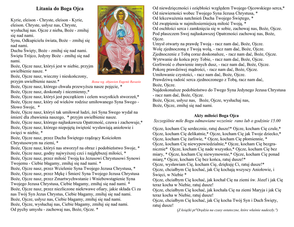 Litania do Boga Ojca Kyrie, eleison - Chryste, eleison - Kyrie, eleison. Chryste, usłysz nas, Chryste, wysłuchaj nas. Ojcze z nieba, Boże - zmiłuj się nad nami. Synu, Odkupicielu świata, Boże – zmiłuj się nad nami. Duchu Święty, Boże - zmiłuj się nad nami. Święta Trójco, Jedyny Boże - zmiłuj się nad nami. Boże, Ojcze nasz, któryś jest w niebie, przyjm uwielbienie nasze. * Boże, Ojcze nasz, wieczny i nieskończony, przyjm uwielbienie nasze.* Ikona wg. objawien Eugenii Ravasio Boże, Ojcze nasz, którego chwała przewyższa nasze pojęcie, * Boże, Ojcze nasz, doskonały i niezmienny,* Boże, Ojcze nasz, któryś jest początkiem i celem wszystkich stworzeń,* Boże, Ojcze nasz, który od wieków rodzisz umiłowanego Syna Swego Słowo Swoje, * Boże, Ojcze nasz, któryś tak umiłował ludzi, żeś Syna Swego wydał na śmierć dla zbawienia naszego, * przyjm uwielbienie nasze. Boże, Ojcze nasz, którego najłaskawsza Opatrzność, czuwa i zachowuje,* Boże, Ojcze nasz, którego niepojętą świętość wysławiają aniołowie i święci w niebie, * Boże, Ojcze nasz, przez Ducha Świętego rządzący Kościołem Chrystusowym na ziemi, * Boże, Ojcze nasz, któryś nas stworzył na obraz i podobieństwo Swoje, * Boże, Ojcze nasz, godny najwyższej czci i najgłębszej miłości, * Boże, Ojcze nasz, przez miłość Twoją ku Jezusowi Chrystusowi Synowi Twojemu - Ciebie błagamy, zmiłuj się nad nami. * Boże, Ojcze nasz, przez Wcielenie Syna Twojego Jezusa Chrystusa, * Boże, Ojcze nasz, przez Mękę i Śmierć Syna Twojego Jezusa Chrystusa Boże, Ojcze nasz, przez Zmartwychwstanie i Wniebowstąpienie Syna Twojego Jezusa Chrystusa, Ciebie błagamy, zmiłuj się nad nami. * Boże, Ojcze nasz, przez niezliczone niekrwawe ofiary, jakie składa Ci za nas Twój Syn Jezus Chrystus, Ciebie błagamy, zmiłuj się nad nami. Boże, Ojcze, usłysz nas, Ciebie błagamy, zmiłuj się nad nami. Boże, Ojcze, wysłuchaj nas, Ciebie błagamy, zmiłuj się nad nami. Od pychy umysłu - zachowaj nas, Boże, Ojcze. * Od niewdzięczności i oziębłości względem Twojego Ojcowskiego serca,* Od niewierności wobec Twojego Syna Jezusa Chrystusa, * Od lekceważenia natchnień Ducha Twojego Świętego, * Od zwątpienia w najmiłosierniejszą miłość Twoją, * Od oschłości serca i zamknięcia się w sobie, zachowaj nas, Boże, Ojcze. Pod płaszczem Swej najłaskawszej Opatrzności zachowaj nas, Boże, Ojcze. Umysł otwarty na prawdę Twoją - racz nam dać, Boże, Ojcze. Wolę zjednoczoną z Twoją wolą, - racz nam dać, Boże, Ojcze. Zjednoczenie z Tobą coraz doskonalsze, - racz nam dać, Boże, Ojcze. Wytrwanie do końca przy Tobie, - racz nam dać, Boże, Ojcze. Gorliwość o zbawienie innych dusz, - racz nam dać, Boże, Ojcze. Pokorę prawdziwej mądrości, - racz nam dać, Boże, Ojcze. Umiłowanie czystości, - racz nam dać, Boże, Ojcze. Prawdziwą radość serca zjednoczonego z Tobą, racz nam dać, Boże, Ojcze. Najdoskonalsze podobieństwo do Twego Syna Jedynego Jezusa Chrystusa - racz nam dać, Boże, Ojcze. Boże, Ojcze, usłysz nas, Boże, Ojcze, wysłuchaj nas, Boże, Ojcze, zmiłuj się nad nami. Akty miłości Boga Ojca Szczególnie miłe Bogu odmawiane wcześnie rano lub o godzinie 15.00 Ojcze, kocham Cię serdecznie, ratuj dusze!* Ojcze, kocham Cię czule,* Ojcze, kocham Cię delikatnie,* Ojcze, kocham Cię jak Twoje dziecko,* Ojcze, kocham Cię żarliwie, * Ojcze, kocham Cię płomiennie, * Ojcze, kocham Cię niewypowiedzialnie,* Ojcze, kocham Cię bezgranicznie* Ojcze, kocham Cię nade wszystko,* Ojcze, kocham Cię bez miary, * Ojcze, kocham Cię niewymownie,* Ojcze, kocham Cię ponad miarę,* Ojcze, kocham Cię bez końca, ratuj dusze!* Ojcze, wysławiam Cię, kocham Cię, dziękuję Ci, ratuj dusze!* Ojcze, chciałbym Cię kochać, jak Cię kochają wszyscy Aniołowie, i Święci, w Niebie * Ojcze, chciałbym Cię kochać, jak kochał Cię na ziemi św. Józef i jak Cię teraz kocha w Niebie, ratuj dusze! Ojcze, chciałbym Cię kochać, jak kochała Cię na ziemi Maryja i jak Cię teraz kocha w Niebie, ratuj dusze! Ojcze, chciałbym Cię kochać, jak Cię kocha Twój Syn i Duch Święty, ratuj dusze! (Z książki pt"Orędzia na czasy ostateczne, które właśnie nadeszły.")