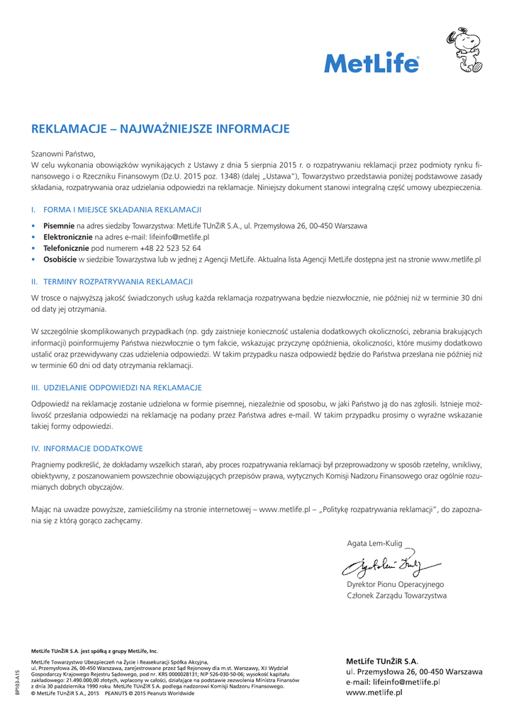 REKLAMACJE – NAJWAŻNIEJSZE INFORMACJE Szanowni Państwo, W celu wykonania obowiązków wynikających z Ustawy z dnia 5 sierpnia 2015 r. o rozpatrywaniu reklamacji przez podmioty rynku finansowego i o Rzeczniku Finansowym (Dz.U. 2015 poz. 1348) (dalej „Ustawa”), Towarzystwo przedstawia poniżej podstawowe zasady składania, rozpatrywania oraz udzielania odpowiedzi na reklamacje. Niniejszy dokument stanowi integralną część umowy ubezpieczenia. I. FORMA I MIEJSCE SKŁADANIA REKLAMACJI • • • • Pisemnie na adres siedziby Towarzystwa: MetLife TUnŻiR S.A., ul. Przemysłowa 26, 00-450 Warszawa Elektronicznie na adres e-mail: [email protected] Telefonicznie pod numerem +48 22 523 52 64 Osobiście w siedzibie Towarzystwa lub w jednej z Agencji MetLife. Aktualna lista Agencji MetLife dostępna jest na stronie www.metlife.pl II. TERMINY ROZPATRYWANIA REKLAMACJI W trosce o najwyższą jakość świadczonych usług każda reklamacja rozpatrywana będzie niezwłocznie, nie później niż w terminie 30 dni od daty jej otrzymania. W szczególnie skomplikowanych przypadkach (np. gdy zaistnieje konieczność ustalenia dodatkowych okoliczności, zebrania brakujących informacji) poinformujemy Państwa niezwłocznie o tym fakcie, wskazując przyczynę opóźnienia, okoliczności, które musimy dodatkowo ustalić oraz przewidywany czas udzielenia odpowiedzi. W takim przypadku nasza odpowiedź będzie do Państwa przesłana nie później niż w terminie 60 dni od daty otrzymania reklamacji. III. UDZIELANIE ODPOWIEDZI NA REKLAMACJE Odpowiedź na reklamację zostanie udzielona w formie pisemnej, niezależnie od sposobu, w jaki Państwo ją do nas zgłosili. Istnieje możliwość przesłania odpowiedzi na reklamację na podany przez Państwa adres e-mail. W takim przypadku prosimy o wyraźne wskazanie takiej formy odpowiedzi. IV. INFORMACJE DODATKOWE Pragniemy podkreślić, że dokładamy wszelkich starań, aby proces rozpatrywania reklamacji był przeprowadzony w sposób rzetelny, wnikliwy, obiektywny, z poszanowaniem powszechnie obowiązujących przepisów prawa, wytycznych Komisji Nadzoru Finansowego oraz ogólnie rozumianych dobrych obyczajów. Mając na uwadze powyższe, zamieściliśmy na stronie internetowej – www.metlife.pl – „Politykę rozpatrywania reklamacji”, do zapoznania się z którą gorąco zachęcamy. Agata Lem-Kulig BP103-A15 Dyrektor Pionu Operacyjnego Członek Zarządu Towarzystwa