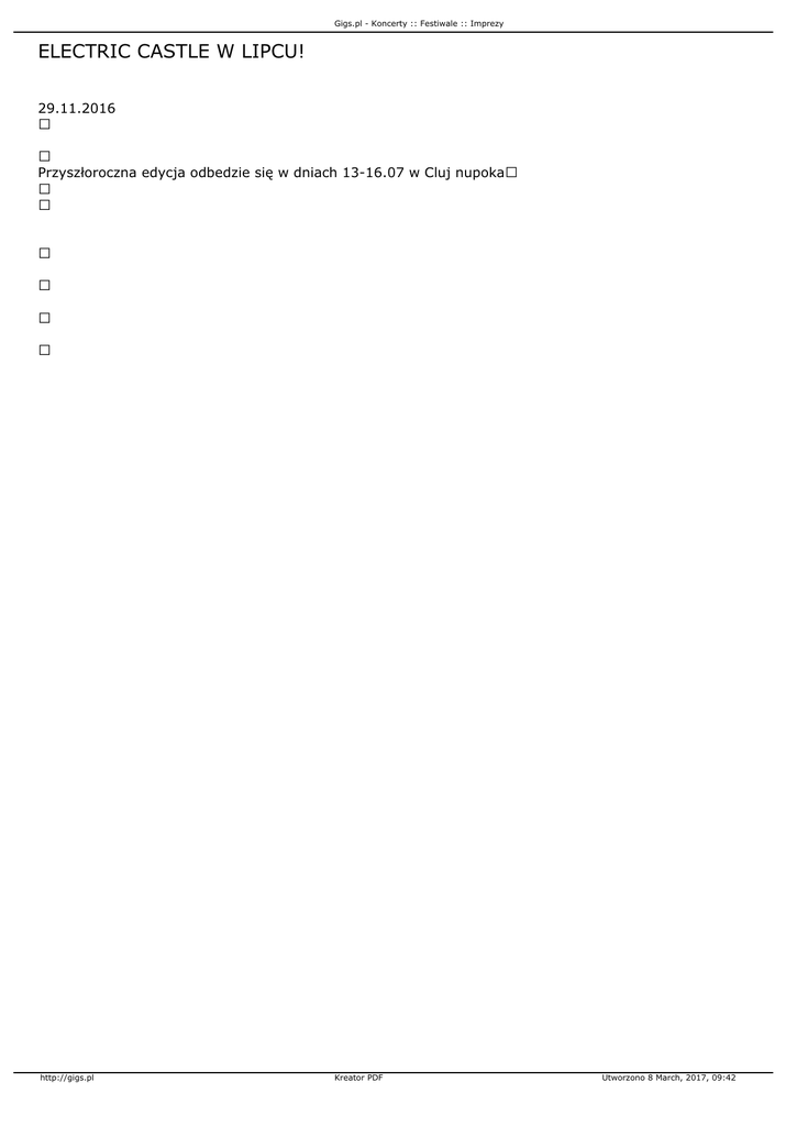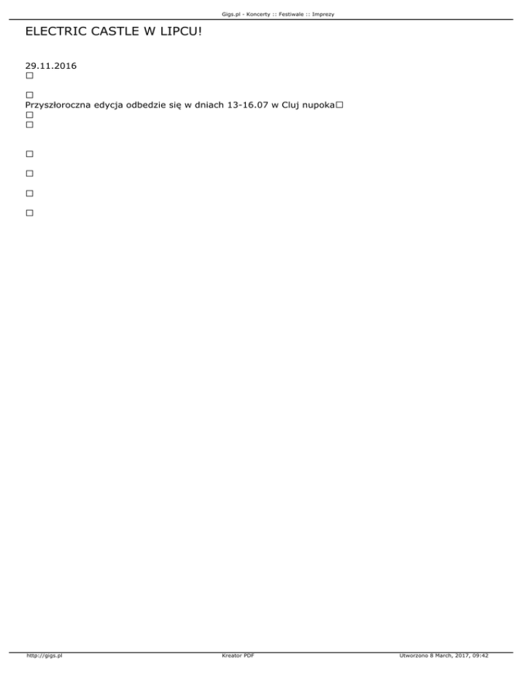 Gigs.pl - Koncerty :: Festiwale :: Imprezy ELECTRIC CASTLE W LIPCU! 29.11.2016 Przyszłoroczna edycja odbedzie się w dniach 13-16.07 w Cluj nupoka http://gigs.pl Kreator PDF Utworzono 8 March, 2017, 09:42