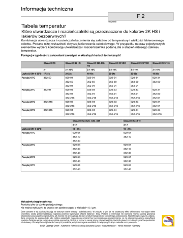 Informacja techniczna F2 10/2016 Tabela temperatur Które utwardzacze i rozcieńczalniki są przeznaczone do kolorów 2K HS i lakierów bezbarwnych? Kombinacja utwardzacza i rozcieńczalnika zmienia się zależnie od temperatury i wielkości lakierowanego obiektu. Podane niżej wskazówki dotyczą lakierowania całościowego. W przypadku napraw pojedynczych elementów wybierz kombinację utwardzacza i rozcieńczalnika podaną dla o stopień niższego zakresu temperatur. Postępuj w zgodności z zaleceniami zawartymi w aktualnych kartach technicznych! Glasurit® 55 Glasurit® 22 HS Glasurit® 923-MS / HS Glasurit® 22 VOC Glasurit® 923-VOC Glasurit® 923-135 2:1 2:1:10% 2:1:10% 2:1:10% 2:1:10% 2:1:10% Lepkość DIN 4/ 20°C 17-21s 20-22s 16-18s 20-24s 20-22s 18-20s Powyżej 15°C 929-91 929-91 929-31 929-31 929-31 352-50 352-50 352-50 352-50 352-50 352-91 352-91 352-91 352-91 929-93 929-93 929-33 929-33 929-31 352-91 352-91 352-91 352-91 352-50 352-216 352-216 352-216 352-216 352-91 929-93 929-94 929-33 929-33 929-31 352-216 352-216 352-216 352-216 352-91 929-94 929-94 929-34 929-34 929-33 352-216 352-216 352-216 352-216 352-216 352-50 Powyżej 20°C 352-91 Powyżej 25°C 352-216 Powyżej 30°C 352-345 Glasurit® 923-625, -630, -645 Glasurit® 923-610 3:1:1 3:1:1 Lepkość DIN 4/ 20°C 18 - 21 s 18 - 21 s Powyżej 15°C 929-61 929-61 352-10 352-10 352-30 Powyżej 20°C Powyżej 25°C Powyżej 30°C 929-63 929-61 352-30 352-10 352-40 352-30 929-63 929-61 352-40 352-30 929-64 929-63 352-40 352-40 Wskazówka bezpieczeństwa: Produkty tylko do użytku profesjonalnego. Nie można wykluczyć, że produkt ten zawiera cząstki o wielkości < 0,1 µm. Dane zawarte w tej publikacji bazują na obecnym stanie wiedzy i doświadczeniu. W związku z tym, że na ostateczny efekt lakierowania ma wpływ wiele czynników, osoba przeprowadzająca naprawę powinna wykonywać własne badania i testy. Podane tu informacje nie stanowią również żadnej gwarancji właściwości poszczególnych produktów, jak również nie przesądzają, że dany produkt nadaje się do konkretnego zastosowania. Wszelkie opisy, rysunki, zdjęcia, dane, proporcje itp. podano tylko jako ogólne wskazówki; mogą się one zmienić bez wcześniejszego powiadomienia, co nie stanowi naruszenia specyfikacji produktu.Ostatnia wersja zastępuje wszystkie poprzednie. Można ją pobrać z naszej strony internetowej http://techinfo.glasurit.com lub otrzymać bezpośrednio od dostawcy. Obowiązkiem użytkownika naszych produktów jest przestrzeganie wszelkich obowiązujących w tym zakresie norm prawnych. BASF Coatings GmbH - Automotive Refinish Coatings Solutions Europe - Glasuritstrasse 1 - 48165 Münster - Germany