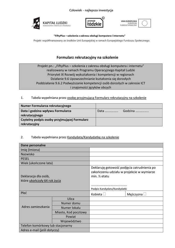 Formularz rekrutacyjny na szkolenie Projekt pn.: „FiftyPlus – szkolenia z zakresu obsługi komputera i internetu” realizowany w ramach Programu Operacyjnego Kapitał Ludzki Priorytet IX Rozwój wykształcenia i kompetencji w regionach Działanie 9.6 Upowszechnianie kształcenia się dorosłych Poddziałanie 9.6.2 Podwyższanie kompetencji osób dorosłych w zakresie ICT i znajomości języków obcych 1. Tabela wypełniana przez osobę przyjmującą Formularz rekrutacyjny na szkolenie Numer Formularza rekrutacyjnego Data i godzina wpływu Formularza rekrutacyjnego Czytelny podpis osoby przyjmującej Formularz rekrutacyjny 2. Data …..……….. Godzina …..……….. Tabela wypełniana przez Kandydata/Kandydatkę na szkolenie Dane personalne Imię (Imiona) Nazwisko PESEL Wiek (ukończone lata) Deklaracja dla osób, które ukończyły 64 rok życia Deklaruję gotowość podjęcia zatrudnienia po zakończeniu udziału w projekcie w wymiarze min. ½ etatu …………………………………….. Podpis Kandydata/Kandydatki Płeć Ulica Numer domu Adres zamieszkania Numer lokalu Miasto, Kod pocztowy Powiat Województwo Telefon komórkowy lub stacjonarny Adres e-mail (jeśli dotyczy) Kobieta Mężczyzna Informacje dodatkowe Sytuacja na rynku pracy pracujący bezrobotny/a zarejestrowany/a w Powiatowym Urzędzie Pracy nieaktywny/a zawodowo Preferowane godziny szkolenia Preferowane dni tygodnia na szkolenie przed południem poniedziałek po południu wtorek środa czwartek piątek Poziom umiejętności z zakresu obsługi komputera i internetu Ocena poziomu umiejętności (brak – nie Czynność posiadanie umiejętności, 5 – zaawansowany poziom umiejętności) Obsługa komputera brak 1 2 3 4 5 Obsługa programu MS Word brak 1 2 3 4 5 Obsługa programu MS Excel brak 1 2 3 4 5 Posługiwanie się internetem oraz komunikatorami internetowymi brak 1 2 3 4 5 (np.: Skype) Proszę uzasadnić w kilku zdaniach potrzebę nabycia kompetencji informatycznych w kontekście poszukiwanego stanowiska pracy ……………………………………………………………………………………………………………………………………………………… ……………………………………………………………………………………………………………………………………………………… ……………………………………………………………………………………………………………………………………………………… ……………………………………………………………………………………………………………………………………………………… ……………………………………………………………………………………………………………………………………………………… ……………………………………………………………………………………………………………………………………………………… ……………………………………………………………………………………………………………………………………………………… ……………………………………………………………………………………………………………………………………………………… ……………………………………………………………………………………………………………………………………………………… ……………………………………………………………………………………………………………………………………………………… ……………………………………………………………………………………………………………………………………………………… ……………………………………………………………………………………………………………………………………………………… Deklaruję dobrowolnie wolę udziału w szkoleniu, jeśli zostanę zakwalifikowany/a …………………………………….. Podpis Kandydata/Kandydatki Potwierdzam zgodność ze stanem faktycznym danych zawartych w Formularzu rekrutacyjnym na szkolenie …………………………………….. Podpis Kandydata/Kandydatki Wyrażam zgodę na przetwarzanie moich danych osobowych przez HRP Group Sp. z o.o. na potrzeby realizacji procesu rekrutacyjnego w ramach projektu „FiftyPlus – szkolenia z zakresu obsługi komputera i internetu”, zgodnie z Ustawą o Ochronie Danych Osobowych z dnia 29.08.1997, z późniejszymi zmianami. ………………………………………… Miejscowość i data …………………………………………….. Czytelny podpis Kandydata/Kandydatki