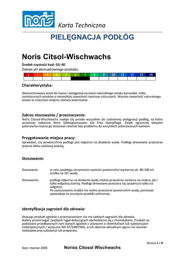 Karta Techniczna PIELĘGNACJA PODŁÓG Noris Citsol-Wischwachs Środek czystości kod: GU 40 Zakres pH skoncetrownego produktu: Charakterystyka: Skoncentrowany wosk do mycia i pielęgnacji na bazie naturalnego wosku karnauba i kilku syntetycznych wosków o niewielkiej zawartości tworzyw sztucznych. Wysoka zawartośd naturalnego wosku w znacznym stopniu ułatwia polerownie. Zakres stosowania / przeznaczenie: Noris Citosol-Wischwachs nadaje się przede wszystkim do codziennej pielęgnacji podłóg, na które wcześniej nałożono Noris Selbstglanzwachs lub Erka Steinpflege. Dzięki ogromnej łatwości polerownia można go stosowad również bez problemu do wszystkich polerowanych kamieni. Przygotowanie miejsca pracy: Sprawdzid, czy powierzchnia podłogi jest odporna na działanie wody. Podłogi drewniane przecierad jedynie lekko zwilżoną ścierką. Stosowanie: Dozowanie: w celu zwykłego utrzymania czystości powierzchni wystarczy ok. 80-100 ml środka na 10 l wody. Stosowanie: podłogi odporne na działanie wody można przecierad zarówna na mokro, jak i tylko wilgotną ścierką. Podłogi drewniane przeciera się zasadniczo tylko na wilgotno. Po zastosowaniu środka nie wolno przecierad powierzchni wodą, ponieważ spowoduje to usunięcie powłoki ochronnej. Identyfikacja zagrożeń dla zdrowia: Stosując produkt zgodnie z przeznaczeniem nie ma żadnych zagrożeo dla zdrowia. Należy przestrzegad zwykłych reguł dotyczących obchodzenia się z chemikaliami. Produkt na podstawie przedłożonych nam danych zgodnie z ustawami o chemikaliach lub substancjach niebezpiecznych / wytyczne WE 67/548/EWG, w ich obecnie aktualnym ujęciu nie stanowi niebezpiecznej substancji lub preparatu. Strona 1 z 4 Stan: marzec 2005 Noriss Citosol Wischwachs Karta Techniczna Skład: Wosk karnauba, woski syntetyczne, dyspersje akrylowe, substancje powierzchniowo czynne, substancje pielęgnujące, zapachowe i pomocnicze. Środki zapobiegawcze: W miejscu pracy nie należy przechowywać żadnych artykułów spożywczych, ani jeść, pić, zażywać tabaki czy palić! Unikać kontaktu z oczami, skórą i ubraniem! Po zakończeniu pracy i przed pójściem na przerwę należy dokładnie umyć ręce! Zabrudzone ubrania przebrać i wyczyścić! Ubrania robocze i wyjściowe trzymać oddzielnie. Techniczne i organizacyjne środki ochronne: Nie wolno mieszać z innymi produktami i chemikaliami. Przy przelewaniu do innych pojemników, uważać by nie pryskać środkiem. W miejscu pracy powinno się zapewnić możliwość umycia się. Mieć w pobliżu butelkę z wodą w razie konieczności przepłukania oczu. Środki ochrony osobistej: Ochrona oczu: unikać kontaktu z oczami Ochrona rąk: częsty kontakt, szczególnie po zaschnięciu może prowadzić do podrażnień skóry. Stosując skoncentrowany produkt zalecamy noszenie gumowych rękawic ochronnych. Zaleca się również stosowanie pod rękawice gumowe rękawic bawełnianych. Ochrona skóry: wszystkie niezakryte części ciała należy chronić stosując tłusty krem do ciała! Pierwsza pomoc: Udzielając pierwszej pomocy należy dbać o własne bezpieczeństwo (np. stosując ręwaiczki ochronne, czy ochronę górnych dróg oddechowych)! Po dostaniu się do oczu: przez 10 minut spłukiwać pod bieżącą woda przy otwartych powiekach lub zakropić środek do płukania oczu. W razie utrzymujących się dolegliwości skontaktować się z okulistą. Po kontakcie ze skórą: zdjąć zabrudzone ubranie. Wyczyścić dużą ilością wody i mydła. Nie stosowac rozcieńczalników itp. W razie połknięcia: Nie wywoływać wymiotów (zagrożenie aspiracji) Pić małymi łykami dużo wody. Udać się do lekarza. W żadnym razie nie należy podawać domowych środków mleka lub alkoholu itp.! Dane techniczne: Wygląd: Zapach: Gęstość: Wartość pH: Rozpuszczalność w wodzie: płynny, mleczno-biały (zabarwiony również czarny lub czerwonobrązowy) słaby ~1,0 ~6,5 dowolnie rozpuszczalny (mieszany) Strona 2 z 4 Stan: marzec 2005 Noriss Citosol Wischwachs Karta Techniczna Transport substancji niebezpiecznych: Produkt nie stanowi substancji niebezpiecznej w rozumieniu Rozporządzenia o substancjach niebezpiecznych i nie podlega ADR/RID 2005. Usuwanie odpadów: Woski i polimery zawarte w produkcie po dostaniu się do ścieków wytrącają płatki i nie powodują żadnego zauważalnego zużycia tlenu. Zawarte w produkcie substancje powierzchniowo czynne są zgodnie z VwVwS (przepisy dotyczące substancji stanowiących zagrożenie dla wody) z dnia 17.05.99 biodegradowalne. UBA 0389 005 Nie dopuścić by nierozcieńczony środek dostał się do kanalizacji! Nie mieszać odpadów! By była możliwa zgodna z przepisami ich utylizacja bądź pozyskanie, należy składować je oddzielnie w wytrzymałych, zamykanych i oznakowanych pojemnikach. Pozostałości środka należy dostarczyć zgodnie z miejscowymi przepisami do miejsca utylizacji odpadów. Mogące mieć zastosowanie przepisy EAK: 07 06 99 20 01 30 Odpady z produkcji, przygotowania, obrotu i stosowania tłuszczów, natłustek, mydeł, detergentów, środków dezynfekujących i kosmetyków i in. nie wymienione Odpady komunalne segregowane i gromadzone selektywnie i inne niż wymienione w 200129 Składowanie: Po przelaniu do innych pojemników niż oryginalne należy oznakować je tak jak oryginalne. Jak wszystkie detergenty należy przechowywać je z dala od dzieci. Obsługa: nie są konieczne żadne szczególne środki. Wskazówki dotyczące ochrony przeciwpożarowej i ochrony przed eksplozją: nie są konieczne żadne szczególne środki Składowanie: Wymagania co do powierzchni magazynowych i pojemników: nie są konieczne żadne szczególne środki Wskazówki dotyczące składowania z innymi substancjami: nie są konieczne żadne szczególne środki Klasa zagrożenia VbF: nie dotyczy Trwałość: w oryginalnych nieotwieranych pojemnikach przynajmniej 24 miesiące Klasa magazynowania: 12 – nie palne płyny Warunki skład