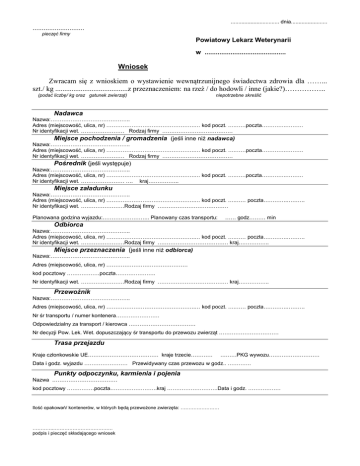 ................................ dnia........................ ............................ pieczęć firmy Powiatowy Lekarz Weterynarii w ............................................ Wniosek Zwracam się z wnioskiem o wystawienie wewnątrzunijnego świadectwa zdrowia dla ……... szt./ kg ........................................z przeznaczeniem: na rzeź / do hodowli / inne (jakie?)…………….. (podać liczbę/ kg oraz gatunek zwierząt) niepotrzebne skreślić Nadawca Nazwa:…………………………………….. Adres (miejscowość, ulica, nr) ………………………………………….… kod poczt. ….……poczta………….………. Nr identyfikacji wet. …………………… Rodzaj firmy ………………………………… Miejsce pochodzenia / gromadzenia (jeśli inne niż nadawca) Nazwa:…………………………………….. Adres (miejscowość, ulica, nr) ………………………………………….… kod poczt. ….……poczta………….………. Nr identyfikacji wet. …………………… Rodzaj firmy ………………………………… Pośrednik (jeśli występuje) Nazwa:…………………………………….. Adres (miejscowość, ulica, nr) ………………………………………….… kod poczt. ….……poczta………….………. Nr identyfikacji wet. …………………… …. kraj…………….. Miejsce załadunku Nazwa:…………………………………….. Adres (miejscowość, ulica, nr) ………………………………………….… kod poczt. ….…… poczta………….………. Nr identyfikacji wet. ……………………Rodzaj firmy ………………………………… Planowana godzina wyjazdu:…………………….. Planowany czas transportu: …… godz……… min Odbiorca Nazwa:…………………………………….. Adres (miejscowość, ulica, nr) ………………………………………….… kod poczt. ….…… poczta………….………. Nr identyfikacji wet. ……………………Rodzaj firmy ………………………………… kraj…………….. Miejsce przeznaczenia (jeśli inne niż odbiorca) Nazwa:…………………………………….. Adres (miejscowość, ulica, nr) ……………………………………… kod pocztowy ………………poczta…………………. Nr identyfikacji wet. ……………………Rodzaj firmy ………………………………… kraj…………….. Przewoźnik Nazwa:…………………………………….. Adres (miejscowość, ulica, nr) ………………………………………….… kod poczt. ….…… poczta………….………. Nr śr transportu / numer kontenera…………………… Odpowiedzialny za transport / kierowca ………………………………. Nr decyzji Pow. Lek. Wet. dopuszczający śr transportu do przewozu zwierząt …………………………… Trasa przejazdu Kraje członkowskie UE………………………………… kraje trzecie………… ………PKG wywozu………………………. Data i godz. wyjazdu …………………… Przewidywany czas przewozu w godz.. …………. Punkty odpoczynku, karmienia i pojenia Nazwa ……………………………… kod pocztowy ……………poczta……….…………….kraj ……………………….Data i godz. ……………… Ilość opakowań/ kontenerów, w których będą przewożone zwierzęta: …………………… ………….………………………………. podpis i pieczęć składającego wniosek
