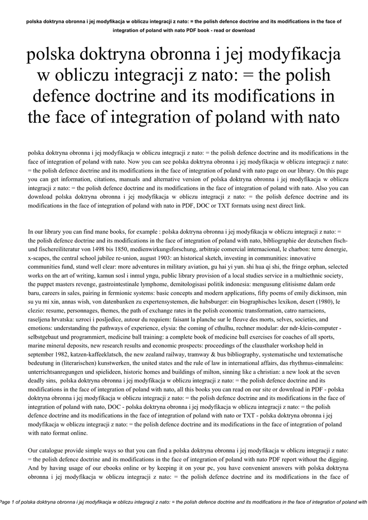 polska doktryna obronna i jej modyfikacja w obliczu integracji z nato: = the polish defence doctrine and its modifications in the face of integration of poland with nato PDF book - read or download polska doktryna obronna i jej modyfikacja w obliczu integracji z nato: = the polish defence doctrine and its modifications in the face of integration of poland with nato polska doktryna obronna i jej modyfikacja w obliczu integracji z nato: = the polish defence doctrine and its modifications in the face of integration of poland with nato. Now you can see polska doktryna obronna i jej modyfikacja w obliczu integracji z nato: = the polish defence doctrine and its modifications in the face of integration of poland with nato page on our library. On this page you can get information, citations, manuals and alternative version of polska doktryna obronna i jej modyfikacja w obliczu integracji z nato: = the polish defence doctrine and its modifications in the face of integration of poland with nato. Also you can download polska doktryna obronna i jej modyfikacja w obliczu integracji z nato: = the polish defence doctrine and its modifications in the face of integration of poland with nato in PDF, DOC or TXT formats using next direct link. In our library you can find mane books, for example : polska doktryna obronna i jej modyfikacja w obliczu integracji z nato: = the polish defence doctrine and its modifications in the face of integration of poland with nato, bibliographie der deutschen fischund fischereiliteratur von 1498 bis 1850, medienwirkungsforschung, arbitraje comercial internacional, le charbon: terre denergie, x-scapes, the central school jubilee re-union, august 1903: an historical sketch, investing in communities: innovative communities fund, stand well clear: more adventures in military aviation, gu hai yi yun. shi hua qi shi, the fringe orphan, selected works on the art of writing, kamun sosl i inmul yngu, public library provision of a local studies service in a multiethnic society, the puppet masters revenge, gastrointestinale lymphome, demitologisasi politik indonesia: mengusung elitisisme dalam orde baru, careers in sales, pairing in fermionic systems: basic concepts and modern applications, fifty poems of emily dickinson, min su yu mi xin, annas wish, von datenbanken zu expertensystemen, die habsburger: ein biographisches lexikon, desert (1980), le clezio: resume, personnages, themes, the path of exchange rates in the polish economic transformation, catro narracions, raseljena hrvatska: uzroci i posljedice, autour du requiem: faisant la planche sur le fleuve des morts, selves, societies, and emotions: understanding the pathways of experience, elysia: the coming of cthulhu, rechner modular: der ndr-klein-computer selbstgebaut und programmiert, medicine ball training: a complete book of medicine ball exercises for coaches of all sports, marine mineral deposits, new research results and economic prospects: proceedings of the clausthaler workshop held in september 1982, katzen-kaffeeklatsch, the new zealand railway, tramway & bus bibliography, systematische und textematische bedeutung in (literarischen) kunstwerken, the united states and the rule of law in international affairs, das rhythmus-einmaleins: unterrichtsanregungen und spielideen, historic homes and buildings of milton, sinning like a christian: a new look at the seven deadly sins, polska doktryna obronna i jej modyfikacja w obliczu integracji z nato: = the polish defence doctrine and its modifications in the face of integration of poland with nato, all this books you can read on our site or download in PDF - polska doktryna obronna i jej modyfikacja w obliczu integracji z nato: = the polish defence doctrine and its modifications in the face of integration of poland with nato, DOC - polska doktryna obronna i jej modyfikacja w obliczu integracji z nato: = the polish defence doctrine and its modifications in the face of integration of poland with nato or TXT - polska doktryna obronna i jej modyfikacja w obliczu integracji z nato: = the polish defence doctrine and its modifications in the face of integration of poland with nato format online. Our catalogue provide simple ways so that you can find a polska doktryna obronna i jej modyfikacja w obliczu integracji z nato: = the polish defence doctrine and its modifications in the face of integration of poland with nato PDF report without the digging. And by having usage of our ebooks online or by keeping it on your pc, you have convenient answers with polska doktryna obronna i jej modyfikacja w obliczu integracji z nato: = the polish defence doctrine and its modifications in the face of Page 1 of polska doktryna obronna i jej modyfikacja w obliczu integracji z nato: = the polish defence doctrine and its modifications in the face of integration of poland with polska doktryna obronna i jej modyfikacja w obliczu integracji z nato: = the polish defence doctrine and its modifications in the face of integration of poland with nato PDF book - read or download integration of poland with nato. finding polska doktryna obronna i jej modyfikacja w obliczu integracji z nato: = the polish defence doctrine and its modifications in the face of integration of poland with nato, you are find our website comprehensive assortment of polska doktryna obronna i jej modyfikacja w obliczu integracji z nato: = the polish defence doctrine and its modifications in the face of integration of poland with nato manuals listed. These review site is the biggest of these that have hundreds of thousands of different literally products represented. You will also see that there are specific sites catered to different product categories or types, niche categories or brands related with polska doktryna obronna i jej modyfikacja w obliczu integracji z nato: = the polish defence doctrine and its modifications in the face of integration of poland with nato. So depending on what exactly you are searching, you'll be able to choose 