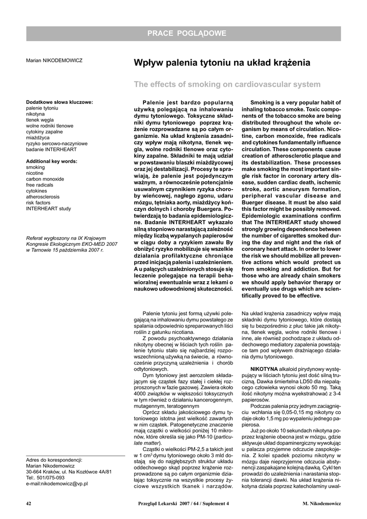 PRACE POGL¥DOWE Marian NIKODEMOWICZ Wp³yw palenia tytoniu na uk³ad kr¹¿enia The effects of smoking on cardiovascular system Dodatkowe s³owa kluczowe: palenie tytoniu nikotyna tlenek wêgla wolne rodniki tlenowe cytokiny zapalne mia¿d¿yca ryzyko sercowo-naczyniowe badanie INTERHEART Additional key words: smoking nicotine carbon monoxide free radicals cytokines atherosclerosis risk factors INTERHEART study Referat wyg³oszony na IX Krajowym Kongresie Ekologicznym EKO-MED 2007 w Tarnowie 15 padziernika 2007 r. Adres do korespondencji: Marian Nikodemowicz 30-664 Kraków, ul. Na Koz³ówce 4A/81 Tel:. 501/075-093 e-mail:[email protected] 42 Palenie jest bardzo popularn¹ u¿ywk¹ polegaj¹c¹ na inhalowaniu dymu tytoniowego. Toksyczne sk³adniki dymu tytoniowego poprzez kr¹¿enie rozprowadzane s¹ po ca³ym organizmie. Na uk³ad kr¹¿enia zasadniczy wp³yw maj¹ nikotyna, tlenek wêgla, wolne rodniki tlenowe oraz cytokiny zapalne. Sk³adniki te maj¹ udzia³ w powstawaniu blaszki mia¿d¿ycowej oraz jej destabilizacji. Procesy te sprawiaj¹, ¿e palenie jest pojedynczym wa¿nym, a równoczenie potencjalnie usuwalnym czynnikiem ryzyka choroby wieñcowej, nag³ego zgonu, udaru mózgu, têtniaka aorty, mia¿d¿ycy koñczyn dolnych i choroby Buergera. Potwierdzaj¹ to badania epidemiologiczne. Badanie INTERHEART wykaza³o siln¹ stopniowo narastaj¹c¹ zale¿noæ miêdzy liczb¹ wypalanych papierosów w ci¹gu doby a ryzykiem zawa³u By obni¿yæ ryzyko mobilizuje siê wszelkie dzia³ania profilaktyczne chroni¹ce przed inicjacj¹ palenia i uzale¿nieniem. A u pal¹cych uzale¿nionych stosuje siê leczenie polegaj¹ce na terapii behawioralnej ewentualnie wraz z lekami o naukowo udowodnionej skutecznoci. Smoking is a very popular habit of inhaling tobacco smoke. Toxic components of the tobacco smoke are being distributed throughout the whole organism by means of circulation. Nicotine, carbon monoxide, free radicals and cytokines fundamentally influence circulation. These components cause creation of atherosclerotic plaque and its destabilization. These processes make smoking the most important single risk factor in coronary artery disease, sudden cardiac death, ischemic stroke, aortic aneurysm formation, peripheral vascular disease and Buerger disease. It must be also said this factor might be possibly removed. Epidemiologic examinations confirm that The INTERHEART study showed strongly growing dependence between the number of cigarettes smoked during the day and night and the risk of coronary heart attack. In order to lower the risk we should mobilize all preventive actions which would protect us from smoking and addiction. But for those who are already chain smokers we should apply behavior therapy or eventually use drugs which are scientifically proved to be effective. Palenie tytoniu jest form¹ u¿ywki polegaj¹c¹ na inhalowaniu dymu powsta³ego ze spalania odpowiednio spreparowanych lici rolin z gatunku nicotiana. Z powodu psychoaktywnego dzia³ania nikotyny obecnej w liciach tych rolin palenie tytoniu sta³o siê najbardziej rozpowszechnion¹ u¿ywk¹ na wiecie, a równoczenie przyczyn¹ uzale¿nienia i chorób odtytoniowych. Dym tytoniowy jest aerozolem sk³adaj¹cym siê cz¹stek fazy sta³ej i ciek³ej rozproszonych w fazie gazowej. Zawiera oko³o 4000 zwi¹zków w wiêkszoci toksycznych w tym równie¿ o dzia³aniu kancerogennym, mutagennym, teratogennym Oprócz sk³adu jakociowego dymu tytoniowego istotna jest wielkoæ zawartych w nim cz¹stek. Patogenetyczne znaczenie maj¹ cz¹stki o wielkoci poni¿ej 10 mikronów, które okrela siê jako PM-10 (particulate matter). Cz¹stki o wielkoci PM-2,5 a takich jest w 1 cm3 dymu tytoniowego oko³o 3 mld dostaj¹ siê do najg³êbszych struktur uk³adu oddechowego sk¹d poprzez kr¹¿enie rozprowadzone s¹ po ca³ym organizmie dzia³aj¹c toksycznie na wszystkie procesy ¿yciowe wszystkich tkanek i narz¹dów. Na uk³ad kr¹¿enia zasadniczy wp³yw maj¹ sk³adniki dymu tytoniowego, które dostaj¹ siê tu bezporednio z p³uc takie jak nikotyna, tlenek wêgla, wolne rodniki tlenowe i inne, ale równie¿ pochodz¹ce z uk³adu oddechowego mediatory zapalenia powstaj¹ce tam pod wp³ywem dra¿ni¹cego dzia³ania dymu tytoniowego. Przegl¹d Lekarski 2007 / 64 / Suplement 4 NIKOTYNA alkaloid pirydynowy wystêpuj¹cy w liciach tytoniu jest doæ siln¹ trucizn¹. Dawka miertelna LD50 dla niepal¹cego cz³owieka wynosi oko³o 50 mg. Tak¹ iloæ nikotyny mo¿na wyekstrahowaæ z 3-4 papierosów. Podczas palenia przy jednym zaci¹gniêciu wch³ania siê 0,05-0,15 mg nikotyny co daje oko³o 1,5 mg po wypaleniu jednego papierosa. Ju¿ po oko³o 10 sekundach nikotyna poprzez kr¹¿enie obecna jest w mózgu, gdzie aktywuje uk³ad dopaminergiczny wywo³uj¹c u palacza przyjemne odczucie zaspokojenia. Z kolei spadek poziomu nikotyny w mózgu daje nieprzyjemne odczucia abstynencji zaspakajane kolejn¹ dawk¹. Cykl ten prowadzi do uzale¿nienia i narastania stopnia tolerancji dawki. Na uk³ad kr¹¿enia nikotyna dzia³a poprzez katecholaminy uwalM. Nikodemowicz niane ze zwojów nerwowych jak i z nadnerczy. Po wypaleniu jednego papierosa poziom adrenaliny wzrasta o 150%, a noradrenaliny o 40%. Powoduje to przyspieszenie akcji serca o oko³o 14% i wzrost cinienia têtniczego o oko³o 6%. Równoczenie wzrasta o 21% opór naczyñ wieñcowych i obni¿a siê o 7% prêdkoæ przep³ywu wieñcowego. Wzrasta zapotrzebowanie serca na tlen. Obni¿a siê o 35% próg migotania komór, co jest powodem wystêpowania czêstszego u palaczy nag³ego zgonu sercowego. Nikotyna wp³ywa te¿ poprzez stymulacjê hormonaln¹ na wzrost poziomu glukozy oraz wzrost frakcji LDL cholesterolu co nasila progresjê mia¿d¿ycy. TLENEK WÊGLA ma 270 razy wiêksze powinowactwo do hemoglobiny ni¿ tlen i tworzy z ni¹ karboksyhemoglobinê. Karboksyhemoglobina w iloci do 1% jest obecna we krwi ludzi zw³aszcza zamieszka³ych w miastach. Natomiast u palaczy poziom karboksyhemoglobiny siêg