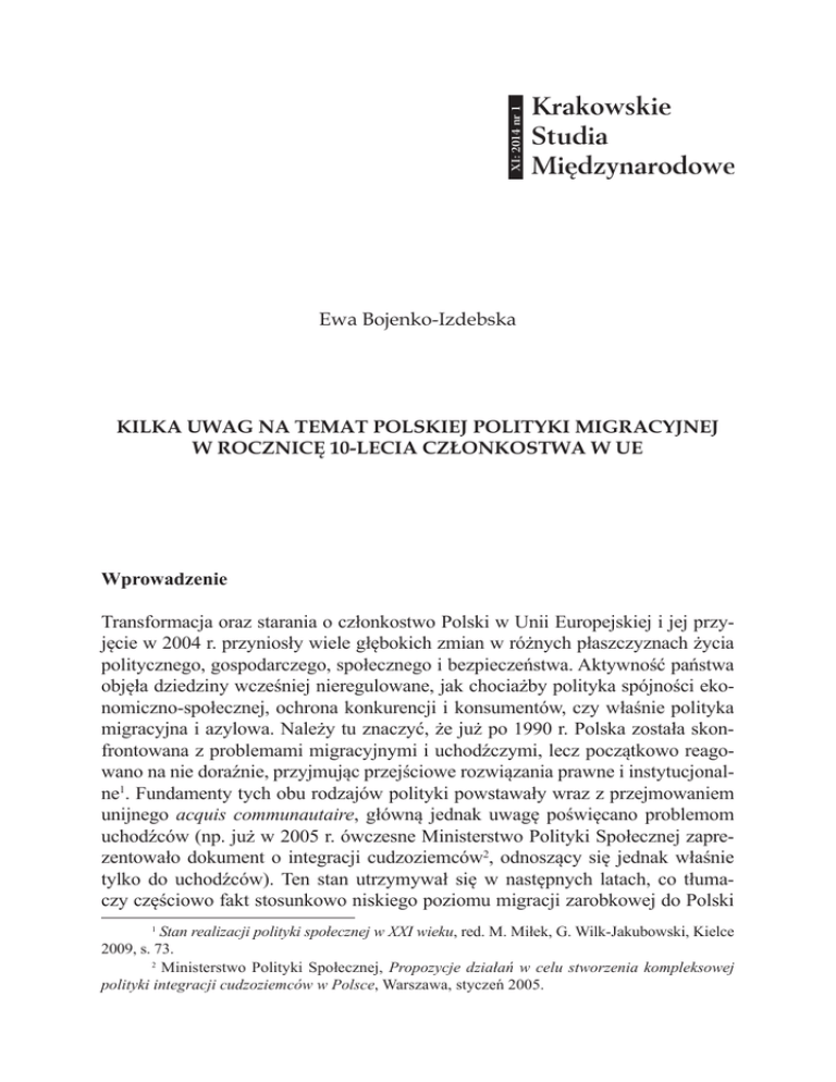 XI: 2014 nr 1 Ewa Bojenko-Izdebska KILKA UWAG NA TEMAT POLSKIEJ POLITYKI MIGRACYJNEJ W ROCZNICĘ 10-LECIA CZŁONKOSTWA W UE Wprowadzenie Transformacja oraz starania o członkostwo Polski w Unii Europejskiej i jej przyjęcie w 2004 r. przyniosły wiele głębokich zmian w różnych płaszczyznach życia politycznego, gospodarczego, społecznego i bezpieczeństwa. Aktywność państwa objęła dziedziny wcześniej nieregulowane, jak chociażby polityka spójności ekonomiczno-społecznej, ochrona konkurencji i konsumentów, czy właśnie polityka migracyjna i azylowa. Należy tu znaczyć, że już po 1990 r. Polska została skonfrontowana z problemami migracyjnymi i uchodźczymi, lecz początkowo reagowano na nie doraźnie, przyjmując przejściowe rozwiązania prawne i instytucjonalne1. Fundamenty tych obu rodzajów polityki powstawały wraz z przejmowaniem unijnego acquis communautaire, główną jednak uwagę poświęcano problemom uchodźców (np. już w 2005 r. ówczesne Ministerstwo Polityki Społecznej zaprezentowało dokument o integracji cudzoziemców2, odnoszący się jednak właśnie tylko do uchodźców). Ten stan utrzymywał się w następnych latach, co tłumaczy częściowo fakt stosunkowo niskiego poziomu migracji zarobkowej do Polski 1 Stan realizacji polityki społecznej w XXI wieku, red. M. Miłek, G. Wilk-Jakubowski, Kielce 2009, s. 73. 2 Ministerstwo Polityki Społecznej, Propozycje działań w celu stworzenia kompleksowej polityki integracji cudzoziemców w Polsce, Warszawa, styczeń 2005. 82 EWA BOJENKO-IZDEBSKA oraz braku (oprócz Wietnamczyków) większych skupisk cudzoziemców, jak jest to charakterystyczne dla Europy Zachodniej. Ostatecznie pierwszy strategiczny i kompleksowy dokument rządowy dotyczący różnych aspektów migracji został opublikowany dopiero w 2012 r.3 Polska pozostaje nadal państwem migracji netto, co powoduje m.in. problemy demograficzne, dla których rozwiązaniem oprócz polityki prorodzinnej mogą stać się przede wszystkim działania na rzecz kierowanej imigracji. Równocześnie migranci zarobkowi stanowią nowe zjawisko w polskim społeczeństwie, a własne decyzje migranckie i doświadczenia nie są automatycznie przenoszone na przybyszów, dlatego też warunkiem udanej integracji jest przełamanie pewnych stereotypów i uprzedzeń. Problematyka migracyjna stała się tymczasem przedmiotem licznych badań i opracowań, przy czym przeważają jednak te dotyczące polskich migrantów za granicą, ale w zakresie problemów migracyjnych w Polsce również istnieje szereg cennych opracowań, np. Instytutu Spraw Publicznych (ISP), który od 2009 r. realizował projekt „Polskie Forum Integracyjne” (druga edycja w latach 2010–2012)4, Ośrodka Badań nad Migracjami UW (publikacje i „Biuletyn Migracyjny”), prowadzone od lat badania migracyjne w Uniwersytecie Jagiellońskim oraz w wielu innych uniwersytetach i placówkach naukowych. Przedmiotem niniejszego artykułu będzie zarys aktualnej polityki migracyjnej, najnowsze zmiany w ustawodawstwie, a także zagadnienia integracji migrantów. W pierwszej części zostaną przedstawione najważniejsze etapy kształtowania się tej polityki w UE i jej prawnego oraz instytucjonalnego wdrażania w Polsce, następnie scharakteryzowana zostanie współczesna migracja zarobkowa i podjęte w ostatnim czasie działania, a w trzeciej części założenia integracji migrantów. Wybór ten podyktowany jest faktem, że w zakresie polityki azylowej, wizowej czy zwalczania nielegalnych migracji polska polityka jest zgodna ze standardami unijnymi, natomiast w obszarze migracji zarobkowych i integracji tego typu migrantów działania podejmowane są od niedawna. Polska polityka migracyjna i azylowa w okresie przedakcesyjnym i po przystąpieniu do Unii Europejskiej Na wstępie należy przypomnieć, że w Unii Europejskiej od Traktatu z Maastricht (Traktatu o Unii Europejskiej) z 1991 r. rodzaje tej polityki są traktowane oddzielnie. W Traktacie w artykułach 61–63, gdzie po raz pierwszy wymienione je jako Ministerstwo Spraw Wewnętrznych. Departament Polityki Migracyjnej, Polityka migracyjna Polski – stan obecny i postulowane działania, Dokument przyjęty przez Radę Ministrów 31 lipca 2012 r. 4 W poszukiwaniu nowych wzorów integracji cudzoziemców, red. J. Segeš Frelak, K. Grot, Warszawa 2013 www.isp.org.pl/uploads/pdf/893051843.pdf, s. 7. 3 KILKA UWAG NA TEMAT POLSKIEJ POLITYKI MIGRACYJNEJ... 83 „przedmiot wspólnego zainteresowania” wyodrębniono politykę azylową, politykę imigracyjną i politykę wobec obywateli krajów trzecich, zasady regulujące przekraczanie zewnętrznych granic państw członkowskich i sprawowanie kontroli nad tym ruchem5. Jednak wspólną polityką stały się one dopiero po wejściu w życie Traktatu amsterdamskiego w 1999 r., co związane było z włączenie acquis communautaire układu z Schengen do prawa unijnego, oraz wprowadzeniem Tytułu IV „Wizy, azyl, imigracja i inne polityki związane ze swobodnym przepływem osób”6. Kolejnym ważnym krokiem była konkluzja ze szczytu w Tampere (15–16 października 1999 r.), na którym przyjęto program w zakresie polityki imigracyjnej oraz zadecydowano o utworzeniu wspólnego systemu azylowego. Wzmocnieniu tych rodzajów polityki służył Program haski na lata 2005–2010, na przyjęcie którego wyrażono zgodę na posiedzeniu Rady Europejskiej w listopadzie 2004 r. i w jej konkluzjach zawarto podstawowe wytyczne w kwestii tych polityk7. W związku ze zwiększającą się nielegalną migracją z Afryki Północnej podczas nieformalnego posiedzenia Rady w Hampton Court w październiku 2005 r. podjęto kolejne istotne decyzje8. Rozwojowi tej polityki służył szereg rozporządzeń i dyrektyw. W Traktacie z Lizbony wprowadzono w art. 67 ważny zapis o rozwijaniu wspólnej polityki w dziedzinie azylu, imigracji i kontroli granic zewnętrznych, opartej na solidarności między państwami członkowskimi i sprawiedli