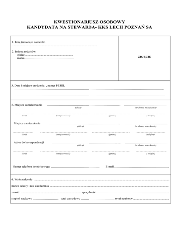 KWESTIONARIUSZ OSOBOWY KANDYDATA NA STEWARDA- KKS LECH POZNAŃ SA 1. Imię (imiona) i nazwisko ................................................................................................................. 2. Imiona rodziców: ojciec ............................................................... matka ………………………………………… ZDJĘCIE 3. Data i miejsce urodzenia , numer PESEL ………………………………………………………………………………………………………………………………….. …………………………………………………………………………………………………………………………………… 5. Miejsce zameldowania ……………………………………………………………….. …………………………………… (ulica) …………………… (kod) ……………………………………….. …… …… ( miejscowość) Miejsce zamieszkania (nr domu, mieszkania) ………………………. …………….. (gmina) …………………………………………………………….. ……………………………………. (ulica) …………………… (kod) ……………………………………….. …… …… ( miejscowość) Adres do korespondencji (nr domu, mieszkania) ………………………. …………….. .. (gmina) ………………………………………………………........ ……………………………………….. …… …… ( miejscowość) ………………………………. ( telefon) …………………………………… (ulica) …………………… (kod) … ….……………………….. ( telefon) (nr domu, mieszkania) ………………………. ……………… (gmina) Numer telefonu komórkowego …………………………………………. ……………………………….. ( telefon) E-mail………………………………………………. 6. Wykształcenie .................................................................................................................................................................................... nazwa szkoły i rok ukończenia .............................................................................................................................................................. zawód ................................................................................ specjalność …………………………………………………………….... stopień naukowy …………………….. tytuł zawodowy ……………………………. tytuł naukowy ............................................... 7. Wykształcenie uzupełniające ………………………………………………………………………………………………………. kursy........................................................................................................................................................................................................ studia podyplomowe............................................................................................................................................................................... (podać datę ukończenia lub rozpoczęcia nauki w przypadku jej trwania) 8. Przebieg dotychczasowego zatrudnienia Okres od Nazwa pracodawcy Stanowisko do 9. Dodatkowe uprawnienia, umiejętności, zainteresowania ……………….………………………………………………………… ............................................................................................................................................................................................................ ............................................................................................................................................................................................................ ........................................................................................................................................................................................................... (np. stopień znajomości języków obcych, prawo jazdy,, posiadane zaświadczenia zawodowe , licencje np. pracownika ochrony, odbyte kursy szkoleniowe) 10. Doświadczenie w pracy podczas imprez masowych ( mecze, koncerty, festyny, zloty itp. ): …………………………………………………………………........................................................................................................ .................................................................................. ....................................................................................................................... …………………………………....................................................................................................................................................... .............................................................................................................................................................................................................. Zgodnie z ustawą z dn. 29.08.97 r. o Ochronie danych Osobowych Dz. Ust. nr 133 poz. 883, wyraŜam zgodę na przetwarzanie moich danych osobowych dla potrzeb niezbędnych do realizacji procesu rekrutacji i selekcji. I hereby authorize you to process my personal data included in my application for the needs of the recruitment process (in accordance to the Personal Data Protection Act 29.08.1997 no 133 position 883). .................................................. (miejscowość i data) ................................................................... (podpis kandydata na stewarda)