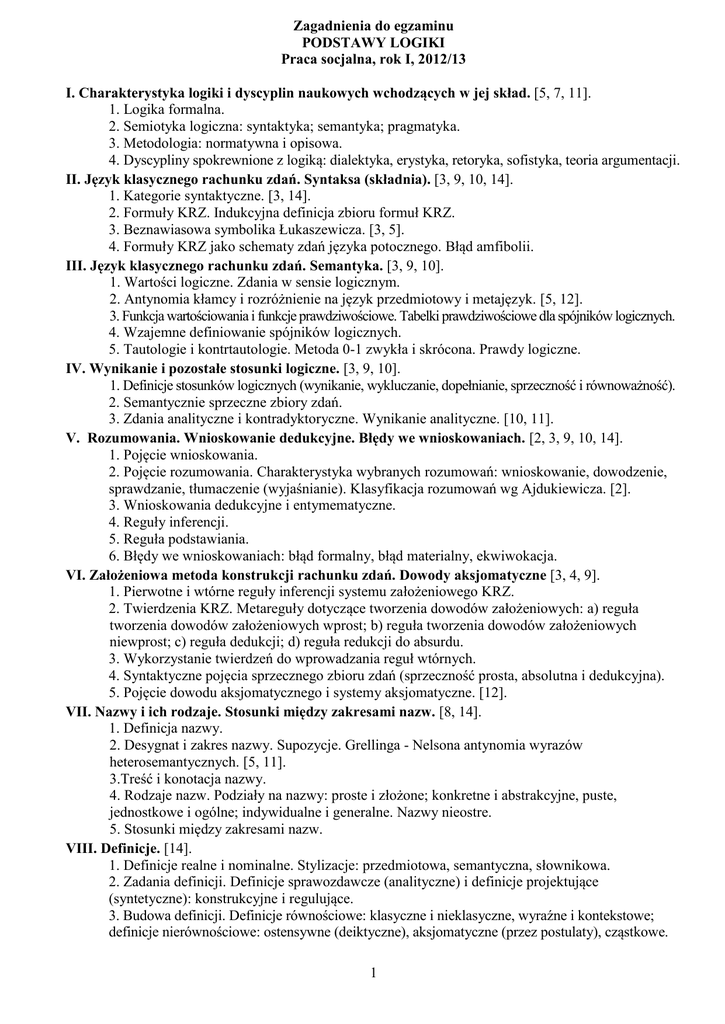 Zagadnienia do egzaminu PODSTAWY LOGIKI Praca socjalna, rok I, 2012/13 I. Charakterystyka logiki i dyscyplin naukowych wchodzących w jej skład. [5, 7, 11]. 1. Logika formalna. 2. Semiotyka logiczna: syntaktyka; semantyka; pragmatyka. 3. Metodologia: normatywna i opisowa. 4. Dyscypliny spokrewnione z logiką: dialektyka, erystyka, retoryka, sofistyka, teoria argumentacji. II. Język klasycznego rachunku zdań. Syntaksa (składnia). [3, 9, 10, 14]. 1. Kategorie syntaktyczne. [3, 14]. 2. Formuły KRZ. Indukcyjna definicja zbioru formuł KRZ. 3. Beznawiasowa symbolika Łukaszewicza. [3, 5]. 4. Formuły KRZ jako schematy zdań języka potocznego. Błąd amfibolii. III. Język klasycznego rachunku zdań. Semantyka. [3, 9, 10]. 1. Wartości logiczne. Zdania w sensie logicznym. 2. Antynomia kłamcy i rozróżnienie na język przedmiotowy i metajęzyk. [5, 12]. 3. Funkcja wartościowania i funkcje prawdziwościowe. Tabelki prawdziwościowe dla spójników logicznych. 4. Wzajemne definiowanie spójników logicznych. 5. Tautologie i kontrtautologie. Metoda 0-1 zwykła i skrócona. Prawdy logiczne. IV. Wynikanie i pozostałe stosunki logiczne. [3, 9, 10]. 1. Definicje stosunków logicznych (wynikanie, wykluczanie, dopełnianie, sprzeczność i równoważność). 2. Semantycznie sprzeczne zbiory zdań. 3. Zdania analityczne i kontradyktoryczne. Wynikanie analityczne. [10, 11]. V. Rozumowania. Wnioskowanie dedukcyjne. Błędy we wnioskowaniach. [2, 3, 9, 10, 14]. 1. Pojęcie wnioskowania. 2. Pojęcie rozumowania. Charakterystyka wybranych rozumowań: wnioskowanie, dowodzenie, sprawdzanie, tłumaczenie (wyjaśnianie). Klasyfikacja rozumowań wg Ajdukiewicza. [2]. 3. Wnioskowania dedukcyjne i entymematyczne. 4. Reguły inferencji. 5. Reguła podstawiania. 6. Błędy we wnioskowaniach: błąd formalny, błąd materialny, ekwiwokacja. VI. Założeniowa metoda konstrukcji rachunku zdań. Dowody aksjomatyczne [3, 4, 9]. 1. Pierwotne i wtórne reguły inferencji systemu założeniowego KRZ. 2. Twierdzenia KRZ. Metareguły dotyczące tworzenia dowodów założeniowych: a) reguła tworzenia dowodów założeniowych wprost; b) reguła tworzenia dowodów założeniowych niewprost; c) reguła dedukcji; d) reguła redukcji do absurdu. 3. Wykorzystanie twierdzeń do wprowadzania reguł wtórnych. 4. Syntaktyczne pojęcia sprzecznego zbioru zdań (sprzeczność prosta, absolutna i dedukcyjna). 5. Pojęcie dowodu aksjomatycznego i systemy aksjomatyczne. [12]. VII. Nazwy i ich rodzaje. Stosunki między zakresami nazw. [8, 14]. 1. Definicja nazwy. 2. Desygnat i zakres nazwy. Supozycje. Grellinga - Nelsona antynomia wyrazów heterosemantycznych. [5, 11]. 3.Treść i konotacja nazwy. 4. Rodzaje nazw. Podziały na nazwy: proste i złożone; konkretne i abstrakcyjne, puste, jednostkowe i ogólne; indywidualne i generalne. Nazwy nieostre. 5. Stosunki między zakresami nazw. VIII. Definicje. [14]. 1. Definicje realne i nominalne. Stylizacje: przedmiotowa, semantyczna, słownikowa. 2. Zadania definicji. Definicje sprawozdawcze (analityczne) i definicje projektujące (syntetyczne): konstrukcyjne i regulujące. 3. Budowa definicji. Definicje równościowe: klasyczne i nieklasyczne, wyraźne i kontekstowe; definicje nierównościowe: ostensywne (deiktyczne), aksjomatyczne (przez postulaty), cząstkowe. 1 4. Warunki poprawności definicji: a) błędy formalne: sprzeczność definicji; błędne koło bezpośrednie i pośrednie; b) błędy merytoryczne: definicje za wąskie, za szerokie, przesunięcie kategorialne. IX. Prawa logiki nazw. [8, 14]. 1. Rodzaje zdań podmiotowo-orzecznikowych: zdania identycznościowe, atomiczne i subsumpcyjne. 2. Klasyczne zdania kategoryczne i ich podział ze względu na ilość i jakość. 3. Ekstensjonalna interpretacja zdań kategorycznych. 4. Prawa kwadratu logicznego. Prawa konwersji, obwersji i kontrapozycji. 5. Wnioskowania sylogistyczne. Pięć reguł niezawodności trybu sylogistycznego i metoda diagramów Venna. X. Kwantyfikatory i modalności. [3, 8, 9, 14]. 1. Kwantyfikatory. a) język rachunku kwantyfikatorów (tj. klasycznego rachunku logicznego — KRL): formuły atomowe, zdania i funkcje zdaniowe; b) interpretacja zdań KRL, uniwersum i dziedzina (model) interpretacji; c) prawa rachunku kwantyfikatorów (tautologie KRL). 2. Modalności logiczne (ontyczne). Prawa logiki modalnej. [3, 14] 3. Modalności normatywne (deontyczne). Prawa logiki deontycznej. [14]. XI. Zdania pytajne. [11, 14]. 1. Założenia pytań, presupozycje. Pytania otwarte i zamknięte. 2. Budowa pytania. Pytania rozstrzygnięcia i dopełnienia. Niewiadoma pytania. 3. Pytania sugestywne i podchwytliwe. Rodzaje odpowiedzi. XII. Elementy pragmatyki logicznej i teorii argumentacji. [1, 7, 9, 10, 13] 1. Implikatura i maksymy konwersacyjne Grice’a. 2. Wiedza a przekonanie. Własności racjonalnych przekonań. 3. Logiczne aspekty definicji kłamstwa. Lektury obowiązkowe: 1. A. Tarski – Prawda i dowód. (Poz. [12] poniżej.) 2. K. Popper – Przedmowa do wydania angielskiego oraz Wprowadzenie do: Nędza historycyzmu. (Poz. [6] poniżej.) Literatura: [1] Ajdukiewicz, K. – Okres warunkowy, a implikacja materialna, [w:] Język i poznanie, t. II, Wybór pism z lat 1945 — 1963, PWN, Warszawa 1985, s. 248- 265. [2] Ajdukiewicz, K. – Klasyfikacja rozumowań, [w:] Język i poznanie, t. II, Wybór pism z lat 1945 — 1963, PWN, Warszawa 1985, s. 206-225. [3] Borkowski, L. – Logika formalna, PWN, Warszawa 1977. [4] Borkowski, L., Słupecki, J. – Elementy logiki matematycznej i teorii mnogości, PWN, Warszawa 1966. [5] Marciszewski, W. (red.) – Mała encyklopedia logiki, Zakład Narodowy imienia Ossolińskich, Wydawnictwo, Wrocław – Warszawa – Kraków – Gdańsk - Łódź 1988. [6] Popper, K. – Nędza historycyzmu, Wydawnictwo Naukowe PWN, Warszawa 1999. [7] Schopenhauer, A. – Erystyka, czyli sztuka prowadzenia sporów, Oficyna Wydawnicza AlmaPress, Warszawa. [8] Selinger, M. – Tradycyjna logika nazw, [w:]