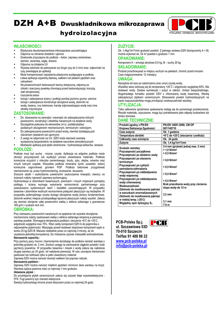 DZH A+B Dwuskładnikowa mikrozaprawa hydroizolacyjna WŁAŚCIWOŚCI: Elastyczna dwukomponentowa mikrozaprawa uszczelniająca Odporna na ciśnienie dodatnie i ujemne Doskonale przyczepna do podłoża – beton, zaprawy cementowe, kamień, ceramika, cegła, drewno Odporna na działanie UV Wysoka zdolność do pokrywania rys (kryje rysy do 3 mm) oraz odporność na rysy powstające po aplikacji Może kompensować naprężenia plastyczne występujące w podłożu Łatwa aplikacja szpachlą stalową, wałkiem lub płaskim pędzlem oraz natryskiem Na powierzchniach betonowych tworzy elastyczną, odporną na chlorki i siarczany powłokę chroniącą przed karbonatyzacją i korozją stali zbrojeniowej Uszczelnia beton Izoluje i zabezpiecza ściany i podłogi poniżej poziomu gruntu: piwnice Izoluje i zabezpiecza konstrukcje obciążone wodą, zbiorniki na wodę, baseny, rury betonowe, kanały odprowadzające wodę oraz inne obiekty inżynieryjne ZASTOSOWANIE: Do stosowania na zewnątrz i wewnątrz do zabezpieczania różnych powierzchni, konstrukcji i obiektów narażonych na działanie wody. Szczególnie polecana do elementów (m.in. prefabrykatów) poddanych obciążeniom mechanicznym, termicznym i wibracjom, Do zabezpieczania powierzchni przed wodą, również działającą pod ciśnieniem (dodatnim lub ujemnym) Z uwagi na odporność na UV, DZH może stanowić warstwę wystawioną bezpośrednio na działanie warunków atmosferycznych Możliwość aplikacji pod płytki ceramiczne : hydroizolacja balkonów, tarasów PODŁOŻE: Podłoże musi być suche , mocne, czyste. Aplikacja na wilgotne podłoże może obniżyć przyczepność lub wydłużyć proces utwardzania materiału. Podłoże koniecznie oczyścić z mleczka cementowego, brudu, pyłu, olejów, smarów oraz innych luźnych cząstek. Wszystkie podłoża mineralne (tynki, posadzki, beton) koniecznie zagruntować gruntem PGP. Podłoża betonowe przygotować mechanicznie np. przez hydromonitoring, śrutowanie, skuwanie. Znaczne ubytki i uszkodzenia powierzchni (wykruszenia krawędzi, otwory) na ścianach należy naprawić zaprawą wyrównującą. Hydroizolacja w zbiornikach basenowych, piwnicach i innych miejscach pomiędzy podłogą i ścianą wymaga wykonania wzmocnienia pachwinowego przy zastosowaniu systemowych taśm i kształtek uszczelniających. W przypadku basenów i zbiorników wodnych wzmocnienia połączeń płaszczyzn są niezbędne. W przypadku potencjalnego ryzyka dużego obciążenia wodą (ściany fundamentowe, zbiorniki wodne) miejsce prostopadłego łączenia płaszczyzn należy wyoblić. Zaleca się również zbrojenie całej powierzchni siatką z włókna szklanego o gramaturze 165 g/m2 i oczkach 4x4 mm. ZUŻYCIE: Ok. 1,4kg/1m2/1mm grubości powłoki. Z jednego zestawu DZH (komponenty A + B) można wykonać ok. 24 m2 powłoki o grubości 1 mm. OPAKOWANIE: Komponent A – emulsja akrylowa 8,5 kg, B – suchy 25 kg SKŁADOWANIE: Produkt przechowywać w miejscu suchym na paletach, chronić przed mrozem. Czas magazynowania: 12 miesięcy UWAGA: Narzędzia od razu po zakończeniu prac umyć czystą wodą. Wszelkie dane odnoszą się do temperatury +20C i wilgotności względnej 60%. Nie dodawać wody. Zestaw wymieszać i zużyć w całości. Unikać bezpośredniego, długotrwałego kontaktu powłoki DZH z chlorowaną wodą basenową. Nieckę zabezpieczyć płytkami ceramicznymi. Stosowanie powłok hydroizolacyjnych na bazie rozpuszczalników mogą zmniejszyć wodoszczelność warstwy. UTYLIZACJA: Tylko całkowicie opróżnione opakowania nadają się do ponownego przetworzenia. Resztki materiału, wysuszone, mogą być potraktowane jako odpady budowlane lub śmieci domowe. DANE TECHNICZNE: Produkt zgodny z PN-EN Krajowa Deklaracja Zgodności Czas zużycia Temperatura obróbki Całkowity czas schnięcia Zużycie Grubość warstwy Przyczepność początkowa Przyczepność po działaniu wody Przyczepność po starzeniu termicznym Przyczepność po cyklach zamrażania-odmrażania Przyczepność po oddziaływaniu wody wapiennej Przyczepność po oddziaływaniu wody chlorowanej Wodoszczelność Zdolność do mostkowania pęknięć w warunkach znormalizowanych Zdolność do mostkowania pęknięć w niskiej temp. (-20˚C) Względny opór dyfuzyjny Sd OBRÓBKA: Przy izolowaniu powierzchni narażonych na spękanie lub wysokie obciążenia mechaniczne należy zastosować siatkę z włókna szklanego wtopioną w pierwszą warstwę powłoki. Wymagana temperatura podłoża i otoczenia +8˚C do +35˚C, wilgotność względna max 75%. Wlać ciekły komponent DZH A do pojemnika o odpowiednie pojemności. Mieszając powoli dodawać stopniowo komponent sypki w worku 25 kg DZH B. Mieszać dokładnie przez co najmniej 3 minuty, aż do uzyskania jednolitej konsystencji. Do mieszania używać mieszadło wolnoobrotowe. Nanoszenie szpachlą : Przy pomocy pacy mocno i równomiernie dociskając do podłoża nanieść warstwę o jednolitej grubości ok. 2 mm. Zwrócić uwagę na zachowanie ciągłości powłoki i brak pęcherzy powietrza. W przypadku basenów i niecek z wodą zaleca się nałożenie drugiej warstwy po 24 godz. od nałożenia pierwszej. W celu usunięcia nierówności paskować lub szlifować tylko w pełni utwardzony materiał. Zaprawę DZH można nanosić również wałkiem lub poprzez natrysk. Nanoszenie pędzlem : Zaprawę DZH można nanosić miękkim pędzlem minimum dwie warstwy na krzyż. Warstwa spójna powinna mieć co najmniej 1 mm grubości. Układanie płytek : Do przyklejania płytek ceramicznych zaleca się używać kleje wysokoelastyczne FFK. Fugi powinny być również elastyczne. Świeżą hydroizolację chronić przed deszczem przez co najmniej 24 godz. PCB-Polska Sp.j. ul. Szczawiowa 53D 70-010 Szczecin Tel/fax 91 488 88 22 www.pcb-polska.pl [email protected] PN-EN 14891:2008, CM OP 067/140710 Ok. 1 godzina +8˚C do +25˚C (otoczenia i podłoża) Ok. 24 godz. Ok. 1,4 kg/1m2/1mm 3-4 mm (grubość jednej max. 2 mm) > 1,