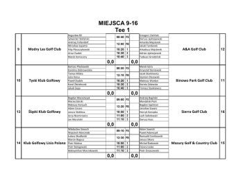 MIEJSCA 9-16 Tee 1 9 Modry Las Golf Club Bogusław Bil Sylwester Stefański Andrzej Follendorf Mirosław Łopatto Filip Płaszczykowski Artur Dudek Marek Konieczny 12:00 FB 10:20 1 10:30 2 10:40 3 0,0 10 Tyski Klub Golfowy Bartosz Plackowski Karolina Dobrowolska Tomas Milata Julia Korus Paweł Dudzik Karol Ździebczok Jakub Szyja Śląski Klub Golfowy 12:10 FB 10:20 1 10:30 2 10:40 3 Andrzej Bagiński Mondalski Piotr Bogdan Szpilman Jarosław Szwarc Henryk Konopka Lech Sokołowski Dariusz Koss 09:00 FS 12:20 FB 10:50 1 11:00 2 11:10 3 Władysław Szwoch Wojciech Marciniak Łukasz Skudlarski Marcin Bogusz Piotr Malesa Piotr Batogowski Maksymilian Marcinkowski Binowo Park Golf Club 11 Sierra Golf Club 16 0,0 Adam Sawicki Paweł Adamczyk Romuald Centkowski Janusz Sikora Michał Śladowski Cezary Łosko Piotr Ostaszewski 09:10 FS 12:30 FB 10:50 1 11:00 2 11:10 3 0,0 12 0,0 0,0 14 Klub Golfowy Lisia Polana Marek Góra Krzysztof Boniewski Jacek Stankiewicz Szymon Olszewski Mateusz Wardyn Dorota Zalewska Tomasz Stankiewicz 08:50 FS Bogdan Maciończyk Maciej Górski Mateusz Korzuch Adam Cesarz Janusz Stokłosa Jerzy Niemirowicz Jan Morański A&A Golf Club 0,0 0,0 13 Grzegorz Zieliński Dariusz Jędrzejewski Amanda Majsterek Jakub Tamborek Arkadiusz Majsterek Adrian Jędrzejewski Tadeusz Grodziński 08:40 FS 0,0 Mazury Golf & Country Club 15