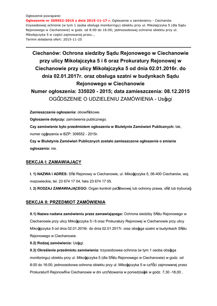Ogłoszenie powiązane: Ogłoszenie nr 309552-2015 z dnia 2015-11-17 r. Ogłoszenie o zamówieniu - Ciechanów trzyosobowej ochronie (w tym 1 osoba obsługa monitoringu) obiektu przy ul. Mikołajczyka 5 (dla Sądu Rejonowego w Ciechanowie) w godz. od 8:00 do 16:00; jednoosobowej ochronie obiektu przy ul. Mikołajczyka 5 w części zajmowanej przez... Termin składania ofert: 2015-11-25 Ciechanów: Ochrona siedziby Sądu Rejonowego w Ciechanowie przy ulicy Mikołajczyka 5 i 6 oraz Prokuratury Rejonowej w Ciechanowie przy ulicy Mikołajczyka 5 od dnia 02.01.2016r. do dnia 02.01.2017r. oraz obsługa szatni w budynkach Sądu Rejonowego w Ciechanowie Numer ogłoszenia: 335020 - 2015; data zamieszczenia: 08.12.2015 OGŁOSZENIE O UDZIELENIU ZAMÓWIENIA - Usługi Zamieszczanie ogłoszenia: obowiązkowe. Ogłoszenie dotyczy: zamówienia publicznego. Czy zamówienie było przedmiotem ogłoszenia w Biuletynie Zamówień Publicznych: tak, numer ogłoszenia w BZP: 309552 - 2015r. Czy w Biuletynie Zamówień Publicznych zostało zamieszczone ogłoszenie o zmianie ogłoszenia: nie. SEKCJA I: ZAMAWIAJĄCY I. 1) NAZWA I ADRES: Sąd Rejonowy w Ciechanowie, ul. Mikołajczyka 5, 06-400 Ciechanów, woj. mazowieckie, tel. 23 674 17 04, faks 23 674 17 05. I. 2) RODZAJ ZAMAWIAJĄCEGO: Organ kontroli państwowej lub ochrony prawa, sąd lub trybunał. SEKCJA II: PRZEDMIOT ZAMÓWIENIA II.1) Nazwa nadana zamówieniu przez zamawiającego: Ochrona siedziby Sądu Rejonowego w Ciechanowie przy ulicy Mikołajczyka 5 i 6 oraz Prokuratury Rejonowej w Ciechanowie przy ulicy Mikołajczyka 5 od dnia 02.01.2016r. do dnia 02.01.2017r. oraz obsługa szatni w budynkach Sądu Rejonowego w Ciechanowie. II.2) Rodzaj zamówienia: Usługi. II.3) Określenie przedmiotu zamówienia: trzyosobowea ochrona (w tym 1 osoba obsługa monitoringu) obiektu przy ul. Mikołajczyka 5 (dla Sądu Rejonowego w Ciechanowie) w godz. od 8:00 do 16:00; jednoosobowa ochrona obiektu przy ul. Mikołajczyka 5 w części zajmowanej przez Prokuraturę Rejonową w Ciechanowie w dni urzędowania w poniedziałek w godz. 7,30 -18,00 , wtorek-piątek w godz. od 7:30 do 15:30; jednoosobowa ochrona obiektu Sądu Rejonowego w Ciechanowie i Prokuratury Rejonowej w Ciechanowie w budynku przy ul. Mikołajczyka 5 w dni urzędowania w godz. od 16:00 do 8:00 dnia następnego; jednoosobowa ochrona, całodobowo w dni ustawowo i urzędowo wolne od pracy w budynku przy ul. Mikołajczyka 5, dla Sądu Rejonowego w Ciechanowie i Prokuratury Rejonowej w Ciechanowie, tj. cały obiekt; dwuosobowej ochronie obiektu przy ul. Mikołajczyka 6 w godz. od 8:00 do 16:00 i jednoosobowa w godz. od 16:00 do 8:00 następnego dnia oraz jednoosobowa, całodobowo w dni ustawowo i urzędowo wolne od pracy Sądu; kontroli pracy pracowników ochrony we wszystkich obiektach przynajmniej raz na dobę. Kontrole przeprowadzane będą przez osoby posiadające licencję pracownika ochrony fizycznej II stopnia. Obsługa szatni w budynkach Sądu przy ul. Mikołajczyka 5 i 6 w dniach urzędowania Sądu Rejonowego w Ciechanowie godzinach 8,00-16,00. W okresie od 02 stycznia do 30 kwietnia 2016 oraz od 17 października do 31 grudnia 2016r... II.4) Wspólny Słownik Zamówień (CPV): 79.71.00.00-4. SEKCJA III: PROCEDURA III.1) TRYB UDZIELENIA ZAMÓWIENIA: Przetarg nieograniczony III.2) INFORMACJE ADMINISTRACYJNE · Zamówienie dotyczy projektu/programu finansowanego ze środków Unii Europejskiej: nie SEKCJA IV: UDZIELENIE ZAMÓWIENIA IV.1) DATA UDZIELENIA ZAMÓWIENIA: 08.12.2015. IV.2) LICZBA OTRZYMANYCH OFERT: 4. IV.3) LICZBA ODRZUCONYCH OFERT: 0. IV.4) NAZWA I ADRES WYKONAWCY, KTÓREMU UDZIELONO ZAMÓWIENIA: · Biuro Ochrony Mienia i Osób Narodowski Władysław ALBATROS, ul. Reutta 1/15, 06-400 Ciechanów, kraj/woj. mazowieckie. IV.5) Szacunkowa wartość zamówienia (bez VAT): 336528,00 PLN. IV.6) INFORMACJA O CENIE WYBRANEJ OFERTY ORAZ O OFERTACH Z NAJNIŻSZĄ I NAJWYŻSZĄ CENĄ · Cena wybranej oferty: 250164,60 · Oferta z najniższą ceną: 250164,60 / Oferta z najwyższą ceną: 336814,40 · Waluta: PLN .