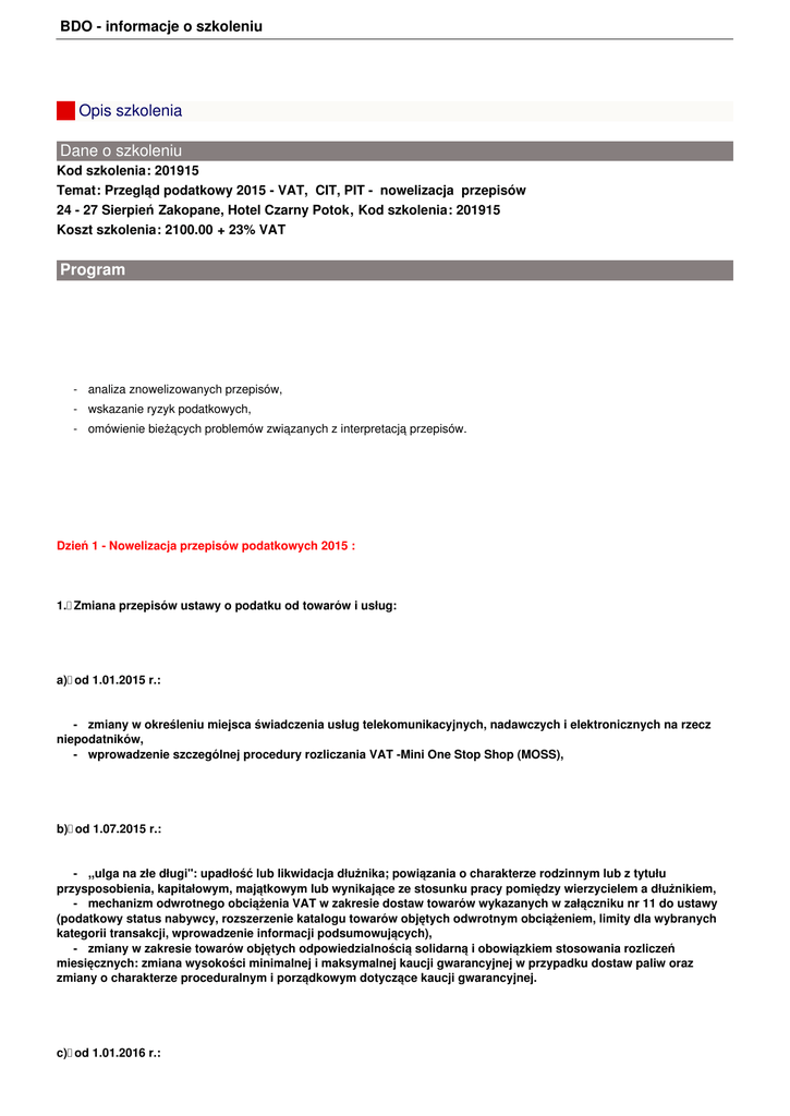 BDO - informacje o szkoleniu Opis szkolenia Dane o szkoleniu Kod szkolenia: 201915 Temat: Przegląd podatkowy 2015 - VAT, CIT, PIT - nowelizacja przepisów 24 - 27 Sierpień Zakopane, Hotel Czarny Potok, Kod szkolenia: 201915 Koszt szkolenia: 2100.00 + 23% VAT Program - analiza znowelizowanych przepisów, - wskazanie ryzyk podatkowych, - omówienie bieżących problemów związanych z interpretacją przepisów. Dzień 1 - Nowelizacja przepisów podatkowych 2015 : 1. Zmiana przepisów ustawy o podatku od towarów i usług: a) od 1.01.2015 r.: - zmiany w określeniu miejsca świadczenia usług telekomunikacyjnych, nadawczych i elektronicznych na rzecz niepodatników, - wprowadzenie szczególnej procedury rozliczania VAT -Mini One Stop Shop (MOSS), b) od 1.07.2015 r.: - ,,ulga na złe długi": upadłość lub likwidacja dłużnika; powiązania o charakterze rodzinnym lub z tytułu przysposobienia, kapitałowym, majątkowym lub wynikające ze stosunku pracy pomiędzy wierzycielem a dłużnikiem, - mechanizm odwrotnego obciążenia VAT w zakresie dostaw towarów wykazanych w załączniku nr 11 do ustawy (podatkowy status nabywcy, rozszerzenie katalogu towarów objętych odwrotnym obciążeniem, limity dla wybranych kategorii transakcji, wprowadzenie informacji podsumowujących), - zmiany w zakresie towarów objętych odpowiedzialnością solidarną i obowiązkiem stosowania rozliczeń miesięcznych: zmiana wysokości minimalnej i maksymalnej kaucji gwarancyjnej w przypadku dostaw paliw oraz zmiany o charakterze proceduralnym i porządkowym dotyczące kaucji gwarancyjnej. c) od 1.01.2016 r.: BDO - informacje o szkoleniu - zmiany w zakresie odliczania podatku naliczonego w odniesieniu do zakupionych towarów i usług wykorzystywanych do celów prowadzonej przez podatnika działalności gospodarczej, jak i do celów innych niż działalność gospodarcza: doprecyzowanie zasad postępowania w przypadku zmiany zakresu wykorzystywania zakupionych towarów i usług do działalności podlegającej VAT (korekta); określenia przykładowych sposobów obliczenia proporcji w celu odliczania tego podatku; 2. Nowelizacja przepisów ustaw o podatkach dochodowych: - wprowadzenie opodatkowania dochodów zagranicznych spółek kontrolowanych (Controlled Foreign Corporation -CFC), - zmiany przepisów dotyczące cienkiej kapitalizacji; zmiana współczynnika zadłużenia, rozciągnięcie stosowania przepisów do powiązań pośrednich, wprowadzenie nowej, alternatywnej w stosunku do istniejącej, metody zaliczania odsetek od pożyczek do kosztów uzyskania przychodów, - certyfikat rezydencji -okres ważności, - nowe przepisy dot. ustalania wartości przychodów i kosztów świadczeń w naturze, -instytucja ,,datio in solutum"- regulowanie zobowiązania świadczeniem rzeczowym, - nowy sposób ustalania wartości początkowej składników majątku, w które wyposażany jest zagraniczny zakład oraz sposób ustalania wartości początkowej w spółce europejskiej i spółdzielni europejskiej-w przypadku przeniesienie jej siedziby na terytorium RP, - doprecyzowanie przepisów dotyczących opodatkowania przychodów stanowiących wartość niepodzielonych zysków przekształcanej spółki - w razie przekształcenia spółki w spółkę niebędącą osobą prawną, - doprecyzowanie przepisów dot. zwolnienia z opodatkowania wypłacanych dywidend, - wyłączenie prawa do korzystania ze zwolnienia od podatku wypłat dywidend i innych dochodów tzw. pożyczek partycypacyjnych, - doprecyzowanie przepisów dot. wymiany udziałów, - odroczenie opodatkowania dochodu z tytułu objęcia udziałów w zamian za wkład niepieniężny w postaci komercjalizowanej wartości intelektualnej, - pochodne instrumenty finansowe-doprecyzowanie przepisów dot. momentu powstania przychodu oraz momentu ujęcia w kosztach podatkowych, - doprecyzowanie przepisów dotyczących cen transferowych i dokumentacji podatkowej z nimi związanej, wprowadzenie regulacji umożliwiającej dokonanie korekty krajowej oraz wyłączenia grup producentów rolnych i ich związków oraz producentów owoców i warzyw lub uznanej organizacji producentów owoców i warzyw z możliwości oszacowania dochodu przez organy podatkowe, - uproszczenie zasad poboru podatku w przypadku tzw. cashback, - odpłatne zbycie składnika majątku wykorzystywanego w działalności gospodarczej, - zmiany w przepisach dotyczących zwolnień z opodatkowania w podatku dochodowym od osób fizycznych, - nieodpłatne używanie samochodów służbowych do celów prywatnych. Dzień 2 - Wybrane zagadnienia z zakresu podatku od towarów i usług: - problematyka mixed supply oraz single composite supply; - zagadnienie refakturowania usług-praktyka i judykatura; - uszczegółowienie katalogu wyłączeń: rabaty, etc.-podstawa opodatkowania przy czynnościach pomocniczych; - zasady obniżania podstawy opodatkowania -rozliczanie faktur korygujących; - zasady pełnego odliczenia VAT od wydatków samochodowych: ryzyko, dokumentacja (VAT-26); - regulamin dotyczący wykorzystania samochodów służbowych (podmioty uprawnione,- przeznaczenie i zakres wykorzystywania, -obowiązki użytkowników,-zasady ponoszenia kosztów eksploatacyjnych,-zakres odpowiedzialności użytkownika- sankcje, - uregulowanie możliwości użycia samochodu służbowego do celów prywatnych); - przegląd wydatków nie objętym ograniczeniem częściowego (50%) odliczenia VAT dot. samochodów; - precyzyjne ustalenie momentu dostawy towarów i momentu wykonania usług a obowiązek podatkowy; - usługi rozliczane w okresach rozliczeniowych a tzw.: ,,sprzedaż ciągła" - moment nabycia prawa do odliczania -jak interpretować krajowe przepisy? - odliczanie podatku VAT w transakcjach wewnątrzwspólnotowych (zaliczka a faktura dokumentująca dostawę towarów); - rozliczenie faktury korygującej in minus u nabywcy (modyfikacja istniejącej zasady)-korekta VAT naliczonego bez faktury korygującej; - odliczanie częściowe, odlicza