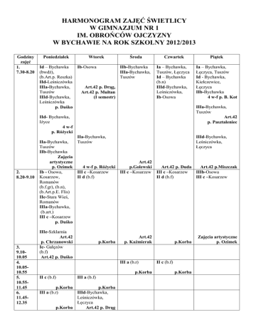 HARMONOGRAM ZAJĘĆ ŚWIETLICY W GIMNAZJUM NR 1 IM. OBROŃCÓW OJCZYZNY W BYCHAWIE NA ROK SZKOLNY 2012/2013 Godziny zajęć 1. 7.30-8.20 Poniedziałek Wtorek Środa Id – Bychawka Ib-Osowa IIb-Bychawka (bwdż), IIIa-Bychawka, (b.Art.p. Reszka) Tuszów IId-Leśniczówka IIIa-Bychawka, Art.42 p. Drąg, Tuszów Art.42 p. Multan IIId-Bychawka, (I semestr) Leśniczówka p. Daśko Czwartek Piątek Ia – Bychawka, Tuszów, Łęczyca Id – Bychawka (b.n) IIId-Bychawka, Leśniczówka, Ib-Osowa Ia – Bychawka, Łęczyca, Tuszów Id - Bychawka, Kiełczewice, Łęczyca IIb-Bychawka 4 w-f p. B. Kot IIIa-Bychawka, Tuszów Art.42 p. Pasztaleniec IId- Bychawka, Iżyce 4 w-f p. Różycki 2. 8.20-9.10 3. 9.1010.05 4. 10.0510.55 5. 10.5511.45 6. 11.4512.35 IIa-Bychawka, IIa-Bychawka, Tuszów Tuszów IIb-Bychawka Zajęcia artystyczne Art.42 p. Ozimek 4 w-f p. Różycki p.Golewski Art.42 p. Duda Ib - Osowa, III c –Kosarzew III c –Kosarzew III c –Kosarzew Kosarzew, II d (b.f) II d (b.f) Romanów (b.f.gr), (b.n), (b.Art.p.E. Flis) IIe-Stara Wieś, Romanów IIIa-Bychawka, (b.art.) III c –Kosarzew p. Daśko IIIe-Szklarnia Art.42 p. Chrzanowski Ic- Gałęzów (b.f) Art.42 p. Daśko p.Korba Art.42 p. Kaźmierak III a (b.r) p.Korba II c (b.f) III a (b.f) p.Korba p.Korba III a (b.r) IIId-Bychawka, Leśniczówka, Łęczyca p.Korba Art.42 p. Drąg p.Korba II c (b.f) p.Korba IIId-Bychawka, Leśniczówka, Łęczyca Art.42 p.Miszczak IIIb-Osowa III c –Kosarzew Zajęcia artystyczne p. Ozimek 7. 12.3513.20 8. 13.4014.30 Ia – Bychawka, Tuszów, Łęczyca Id – Bychawka (dz) Ia – Bychawka. Tuszów, Łęczyca (ch) IbOsowa,Skawinek, Kosarzew, Romanów (b.wdż) Id - Bychawka (b.f), (ch) IId- Bychawka, Leśniczówka, Iżyce (b.wdż) IIId-Bychawka, Leśniczówka (b.Art.p. Reszka) p. Daśko IIIa-Bychawka, Tuszów 4 w-f p. Różycki i p. Flis IIIb-Osowa Art.42 p.Miszczak Ia – Bychawka. Art.42 p. Korba Tuszów (dz) Art.42p.Ozimek Id - Bychawka (b.f), (dz) Art.42 p.Wieleba Art.42 p. Korba IIb-Osowa Ia - Łęczyca Ic-Gałęzów IIdLeśniczówka IIc IIIdGałęzów (b.wdż) Leśniczówka IIIc-Gałęzów p. Daśko Ia – Bychawka, Tuszów, Łęczyca (b.wdż) IIIa-Bychawka, Tuszów IIIe-Szklarnia Art.42 p.Kalicka IbOsowa,Skawinek, Kosarzew, Romanów III c –Kosarzew IIIe-Szklarnia 4 w-f p. Różycki i p. Flis p. Daśko 4 w-f p. Różycki Ic-Gałęzów (b.n) 4 w-f p. Różycki IIb-Osowa IIId-Bychawka, Leśniczówka, Zajęcia artystyczne p. Ozimek Ic-Gałęzów (b.wdż) IIdLeśniczówka IIIdLeśniczówka IIIe-Szklarnia IIIc-Gałęzów, Kosarzew ChórArt.42 p. Mendykowski p.Miszczak Ic-Gałęzów IIc-Gałęzów IIIc-Gałęzów IIc-Gałęzów p. Korba Id - Bychawka (dz) IIIa-Bychawka, Tuszów (b.wdż) IIIe-Szklarnia IIId-Bychawka, Leśniczówka II e – Stara Wieś, Romanów(b.wdż) IIId-Bychawka, Leśniczówka 4 w-f p. Flis Ib-Osowa 9. 14.3015.15 IbOsowa,Skawinek, Kosarzew (b.f gr) IIa-Bychawka, Tuszów (b.wdż) IIIa-Bychawka, Tuszów (b.art.) Id – Bychawka (ch) p. Daśko Art.42 p. B. Kot IId- Bychawka, Leśniczówka, Iżyce, Łęczyca IIIe-Szklarnia Zajęcia artystyczne p. Ozimek i p. Mendykowski Ia - Łęczyca IbOsowa,Skawinek, Kosarzew, Romanów IIIe-Szklarnia p. Daśko III c –Kosarzew Art.42 p. Kukiełka IIc-Gałęzów, Łęczyca II e – Stara Wieś,Skawinek, Romanów IIIc-Gałęzów Zajęcia artystyczne p. Ozimek i p. Mendykowski p. Daśko Ib-Osowa,Skawinek, Kosarzew, Romanów IId- Leśniczówka IIIc-Gałęzów, Kosarzew (b.wdż) IIId- Leśniczówka IIIe-Szklarnia p. Gajur Ib-Osowa IIIb – Osowa 4 w-f p. Flis Ic-Gałęzów Art.42 p. Duda – I semestr Art.42 p. Siek – II semestr IIc-Gałęzów IIIc-Gałęzów 4 w-f p. Flis (ch) – chłopcy (dz) – dziewczęta (b.f) – uczniowie nie uczęszczający na język francuski (b.f.gr) – uczniowie uczęszczający na język francuski w innej grupie (b.n) – uczniowie nie uczęszczający na język niemiecki (b.r) – uczniowie nie uczęszczający na religię (b.wdż) – uczniowie nie uczęszczający na wychowie do życia w rodzinie (klasy III i II w pierwszym semestrze, klasy I w drugim semestrze) (b.art) – uczniowie uczęszczający na zajęcia artystyczne w innej grupie (b.Art.p.Reszka) – uczniowie nie uczęszczający na zajęcia do p. Reszki (b.Art. p. E. Flis) – uczniowie nie uczęszczający na zajęcia do p. E. Flis