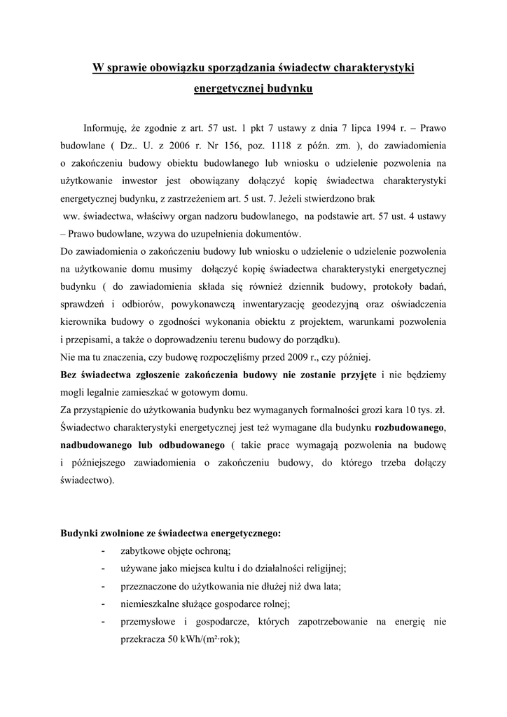 W sprawie obowiązku sporządzania świadectw charakterystyki energetycznej budynku Informuję, że zgodnie z art. 57 ust. 1 pkt 7 ustawy z dnia 7 lipca 1994 r. – Prawo budowlane ( Dz.. U. z 2006 r. Nr 156, poz. 1118 z późn. zm. ), do zawiadomienia o zakończeniu budowy obiektu budowlanego lub wniosku o udzielenie pozwolenia na użytkowanie inwestor jest obowiązany dołączyć kopię świadectwa charakterystyki energetycznej budynku, z zastrzeżeniem art. 5 ust. 7. Jeżeli stwierdzono brak ww. świadectwa, właściwy organ nadzoru budowlanego, na podstawie art. 57 ust. 4 ustawy – Prawo budowlane, wzywa do uzupełnienia dokumentów. Do zawiadomienia o zakończeniu budowy lub wniosku o udzielenie o udzielenie pozwolenia na użytkowanie domu musimy dołączyć kopię świadectwa charakterystyki energetycznej budynku ( do zawiadomienia składa się również dziennik budowy, protokoły badań, sprawdzeń i odbiorów, powykonawczą inwentaryzację geodezyjną oraz oświadczenia kierownika budowy o zgodności wykonania obiektu z projektem, warunkami pozwolenia i przepisami, a także o doprowadzeniu terenu budowy do porządku). Nie ma tu znaczenia, czy budowę rozpoczęliśmy przed 2009 r., czy później. Bez świadectwa zgłoszenie zakończenia budowy nie zostanie przyjęte i nie będziemy mogli legalnie zamieszkać w gotowym domu. Za przystąpienie do użytkowania budynku bez wymaganych formalności grozi kara 10 tys. zł. Świadectwo charakterystyki energetycznej jest też wymagane dla budynku rozbudowanego, nadbudowanego lub odbudowanego ( takie prace wymagają pozwolenia na budowę i późniejszego zawiadomienia o zakończeniu budowy, do którego trzeba dołączy świadectwo). Budynki zwolnione ze świadectwa energetycznego: - zabytkowe objęte ochroną; - używane jako miejsca kultu i do działalności religijnej; - przeznaczone do użytkowania nie dłużej niż dwa lata; - niemieszkalne służące gospodarce rolnej; - przemysłowe i gospodarcze, których zapotrzebowanie na energię nie przekracza 50 kWh/(m²·rok); - mieszkalne, ale przeznaczone do użytkowania nie dłużej niż cztery miesiące w roku; - wolno stojące o powierzchni użytkowej mniejszej niż 50 m² Powiatowy Inspektor Nadzoru Budowlanego w Ostrowie Wielkopolskim mgr inż. Adam Wolf