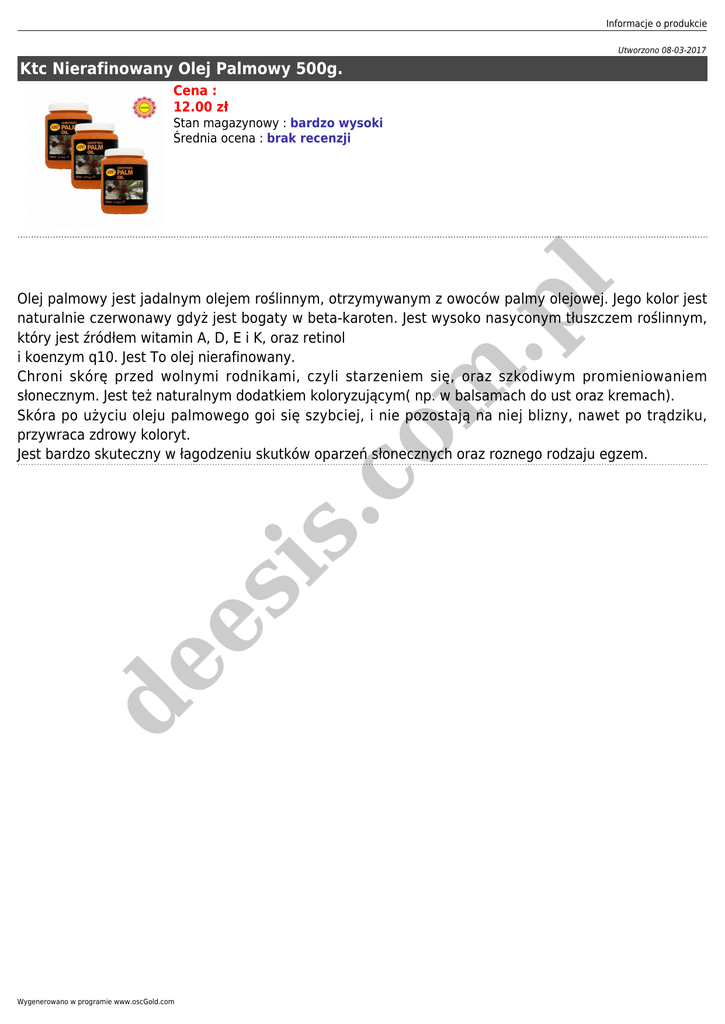 Informacje o produkcie Utworzono 08-03-2017 Ktc Nierafinowany Olej Palmowy 500g. Cena : 12.00 zł m .p l Stan magazynowy : bardzo wysoki Średnia ocena : brak recenzji de es is .c o Olej palmowy jest jadalnym olejem roślinnym, otrzymywanym z owoców palmy olejowej. Jego kolor jest naturalnie czerwonawy gdyż jest bogaty w beta-karoten. Jest wysoko nasyconym tłuszczem roślinnym, który jest źródłem witamin A, D, E i K, oraz retinol i koenzym q10. Jest To olej nierafinowany. Chroni skórę przed wolnymi rodnikami, czyli starzeniem się, oraz szkodiwym promieniowaniem słonecznym. Jest też naturalnym dodatkiem koloryzującym( np. w balsamach do ust oraz kremach). Skóra po użyciu oleju palmowego goi się szybciej, i nie pozostają na niej blizny, nawet po trądziku, przywraca zdrowy koloryt. Jest bardzo skuteczny w łagodzeniu skutków oparzeń słonecznych oraz roznego rodzaju egzem. Wygenerowano w programie www.oscGold.com