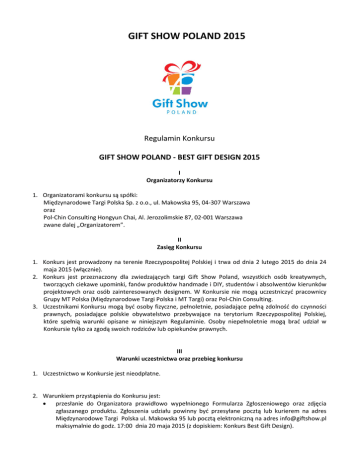 GIFT SHOW POLAND 2015 Regulamin Konkursu GIFT SHOW POLAND - BEST GIFT DESIGN 2015 I Organizatorzy Konkursu 1. Organizatorami konkursu są spółki: Międzynarodowe Targi Polska Sp. z o.o., ul. Makowska 95, 04-307 Warszawa oraz Pol-Chin Consulting Hongyun Chai, Al. Jerozolimskie 87, 02-001 Warszawa zwane dalej „Organizatorem”. II Zasięg Konkursu 1. Konkurs jest prowadzony na terenie Rzeczypospolitej Polskiej i trwa od dnia 2 lutego 2015 do dnia 24 maja 2015 (włącznie). 2. Konkurs jest przeznaczony dla zwiedzających targi Gift Show Poland, wszystkich osób kreatywnych, tworzących ciekawe upominki, fanów produktów handmade i DIY, studentów i absolwentów kierunków projektowych oraz osób zainteresowanych designem. W Konkursie nie mogą uczestniczyć pracownicy Grupy MT Polska (Międzynarodowe Targi Polska i MT Targi) oraz Pol-Chin Consulting. 3. Uczestnikami Konkursu mogą być osoby fizyczne, pełnoletnie, posiadające pełną zdolność do czynności prawnych, posiadające polskie obywatelstwo przebywające na terytorium Rzeczypospolitej Polskiej, które spełnią warunki opisane w niniejszym Regulaminie. Osoby niepełnoletnie mogą brać udział w Konkursie tylko za zgodą swoich rodziców lub opiekunów prawnych. III Warunki uczestnictwa oraz przebieg konkursu 1. Uczestnictwo w Konkursie jest nieodpłatne. 2. Warunkiem przystąpienia do Konkursu jest: przesłanie do Organizatora prawidłowo wypełnionego Formularza Zgłoszeniowego oraz zdjęcia zgłaszanego produktu. Zgłoszenia udziału powinny być przesyłane pocztą lub kurierem na adres Międzynarodowe Targi Polska ul. Makowska 95 lub pocztą elektroniczną na adres [email protected] maksymalnie do godz. 17:00 dnia 20 maja 2015 (z dopiskiem: Konkurs Best Gift Design). dostarczenie wzoru produkty do recepcji targowej w Centrum MT POLSKA ul. Marsa 56c w Warszawie w terminie 22 maja 2015 w godz.: 9:00 - 10:00, w celu rejestracji i ustawienia na ekspozycji. zgłoszenia można wyłącznie przesyłać na Formularzu Zgłoszeniowym Konkursu, dostępnym na stronie www.giftshow.pl. do Konkursu mogą być zgłaszane tylko produkty, które aktualnie nie są jeszcze dostępne w sprzedaży na rynku. każdy uprawniony do wzięcia udziału w konkursie może zgłosić dowolną liczbę produktów. każdy produkt powinien być zgłoszony na oddzielnym Formularzu Zgłoszeniowym na zgłoszonych do konkursu wzorach produktów nie może być widoczne logo firmy zarejestrowanie się jako odwiedzający targi (poprzez stronę internetową www.giftshow.pl lub na miejscu) 3. Do każdego zgłoszenia należy dołączyć: Opis produktu Sam wzór produktu (dostarczenie osobiście 22 maja 2015) kolorowe zdjęcia dobrej jakości obrazujące produkt, bez widocznego logo firmy Poprzez przesłanie każdego zdjęcia Uczestnik Konkursu oświadcza, że przesłane przez niego zdjęcie nie jest chronione prawem osób trzecich i Zgłaszający ponosi za nie pełną odpowiedzialność, jednocześnie wyraża zgodę na publikację ich na stronie www.giftshow.pl , w innych serwisach wydawanych przez Organizatora lub podmioty współpracujące z Organizatorem, podczas trwania targów Gift Show Poland oraz wielokrotnej publikacji w materiałach związanych z targami Gift Show Poland. 4. Zgłaszający wyraża zgodę na wykorzystanie wizerunku zgłaszanego produktu w celach związanych z Konkursem. 5. Wszystkie zgłoszone do Konkursu produkty zostaną opublikowane w specjalnej zakładce konkursowej na stronie targów www.giftshow.pl. 6. Uczestnictwa w Konkursie, jak i praw i obowiązków z nim związanych, w tym także prawa do żądania wydania nagrody, nie można przenosić na osoby trzecie. 7. Organizator nie ponosi odpowiedzialności za produkty nie odebrane osobiście przez Uczestnika z ekspozycji 24 maja 2015 po godz. 14:00 (po ogłoszeniu wyników). IV Jury konkursu 1. Oceny zgłoszony produktów dokona Jury Konkursu, składające sie z ekspertów branżowych oraz przedstawicieli Organizatora. 2. Spośród zgłoszonych produktów Jury wybierze zwycięzców Konkursu Gift Show Poland - Best Gift Design 2015. 3. Organizatorzy zastrzegają sobie prawo zmiany składu Jury. 4. Decyzja Jury jest ostateczna i niepodważalna. V Kryterium oceny 1. Ocena zgłoszeń konkursowych będzie odbywała się wg następujących kryteriów: -oryginalność -szczególne walory estetyczne -innowacyjność - brak dostępności produktu na rynku lub w sprzedaży -dbałość wykonania - złożenie formularza konkursowego do godz. 17:00 dnia 20 maja 2015 roku oraz dostarczenie produktu do godz. 10:00 22 maja 2015 roku. VI Nagrody 1. Jury Konkursu przyzna 6 nagród: I miejsce (1 nagroda) - 5000 zł netto II miejsce (2 nagrody) - 1000zł netto III miejsce (3 nagrody) - 500 zł netto Zapłacenie podatku leży po stronie Organizatora. 2. Jury zastrzega sobie prawo do nieprzyznania nagrody w zależności od poziomu zebranych zgłoszeń. VII Ogłoszenie wyników 1. Ogłoszenie wyników Konkursu nastąpi dnia 24 maja o godz. 14:00 2. Organizator zastrzega sobie prawo do publikowania informacji o zwycięzcach na stronie internetowej www.giftshow.pl, na profilu Gift Show Poland na portalu Facebook oraz w innych publikacjach Organizatora, na co Uczestnicy przystępujący do Konkursu wyrażają zgodę. VIII Zgoda na przetwarzanie danych 1. Akceptacja Regulaminu Konkursu jest równocześnie zgodą na przesyłanie przez Międzynarodowe Targi Polska sp. z o.o. oraz Pol-Chin Consulting informacji handlowych oraz przetwarzanie danych osobowych w celach marketingowych zgodnie z przepisami ustawy z dnia 29 sierpnia 1997 roku o ochronie danych osobowych (Dz. U. z 1997r., Nr 133, poz. 883 ze zm.). Podanie danych jest dobrowolne. Uczestnikowi przysługuje prawo do wglądu w udostępnione dane oraz zgłoszenie sprzeciwu co do ich przetwarzania. IX Postanowienia końcowe 1. W przypadku plagiatu całą odpowiedzialność oraz koszty sprawy sądowej ponosi Uczestnik. 2. Organizator zastrzega sobie możliwość zmi