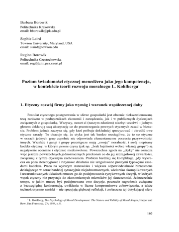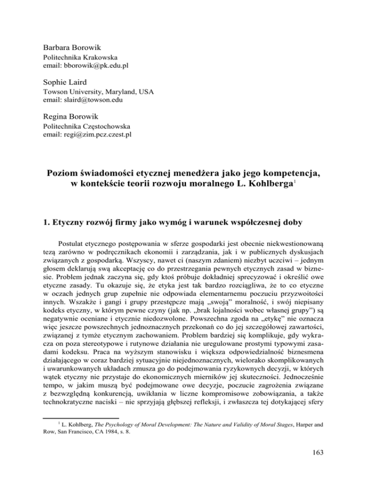 Barbara Borowik Politechnika Krakowska email: [email protected] Sophie Laird Towson University, Maryland, USA email: [email protected] Regina Borowik Politechnika Częstochowska email: [email protected] Poziom świadomości etycznej menedżera jako jego kompetencja, w kontekście teorii rozwoju moralnego L. Kohlberga1 1. Etyczny rozwój firmy jako wymóg i warunek współczesnej doby Postulat etycznego postępowania w sferze gospodarki jest obecnie niekwestionowaną tezą zarówno w podręcznikach ekonomii i zarządzania, jak i w publicznych dyskusjach związanych z gospodarką. Wszyscy, nawet ci (naszym zdaniem) niezbyt uczciwi – jednym głosem deklarują swą akceptację co do przestrzegania pewnych etycznych zasad w biznesie. Problem jednak zaczyna się, gdy ktoś próbuje dokładniej sprecyzować i określić owe etyczne zasady. Tu okazuje się, że etyka jest tak bardzo rozciągliwa, że to co etyczne w oczach jednych grup zupełnie nie odpowiada elementarnemu poczuciu przyzwoitości innych. Wszakże i gangi i grupy przestępcze mają „swoją” moralność, i swój niepisany kodeks etyczny, w którym pewne czyny (jak np. „brak lojalności wobec własnej grupy”) są negatywnie oceniane i etycznie niedozwolone. Powszechna zgoda na „etykę” nie oznacza więc jeszcze powszechnych jednoznacznych przekonań co do jej szczegółowej zawartości, związanej z tymże etycznym zachowaniem. Problem bardziej się komplikuje, gdy wykracza on poza stereotypowe i rutynowe działania nie uregulowane prostymi typowymi zasadami kodeksu. Praca na wyższym stanowisku i większa odpowiedzialność biznesmena działającego w coraz bardziej sytuacyjnie niejednoznacznych, wielorako skomplikowanych i uwarunkowanych układach zmusza go do podejmowania ryzykownych decyzji, w których wątek etyczny nie przystaje do ekonomicznych mierników jej skuteczności. Jednocześnie tempo, w jakim muszą być podejmowane owe decyzje, poczucie zagrożenia związane z bezwzględną konkurencją, uwikłania w liczne kompromisowe zobowiązania, a także technokratyczne naciski – nie sprzyjają głębszej refleksji, i zwłaszcza tej dotykającej sfery 1 L. Kohlberg, The Psychology of Moral Development: The Nature and Validity of Moral Stages, Harper and Row, San Francisco, CA 1984, s. 8. 163 aksjologicznej. Ta zresztą (zgodnie ze spostrzeżeniami wybitnych myślicieli obecnego wieku, jak np. E. Gidens, czy M. Castells) zależna jest od ogólnej samoświadomości i konstrukcji własnego „ja”, która to dla człowieka obecnej doby jest swoistą „piętą Achillesa”. Kłopoty z własną tożsamością uzależnione są z kolei od szerszych procesów i globalnych trendów, narzucających relatywizm kulturowy i oferujących pofragmentowane, wewnętrznie niespójne wzory kulturowe, które zaciemniają aksjologiczną percepcję. Zagubienie w świecie wartości i funkcjonowanie na obrzeżach „własnego ja” jest ściśle związane z sytuacją podejmowania wyborów pozornie niezwiązanych ze światem etyki, a dotyczących działań biznesowych. Obecna wzrastająca rola gospodarki, wynikająca m.in. z faktu nagromadzenia ekonomicznego kapitału i przejmowania coraz to cięższych „zasobów” władzy od innych dotychczasowych jej nosicieli (jak np. państw narodowych czy różnych kościelnych, politycznych, kulturowych i społecznych organizacji i instytucji) – zmienia jej role i zakres oddziaływań. Bowiem wraz ze wzrostem władzy rośnie siła jej społecznych, politycznych i kulturowych oddziaływań. Ta zwiększająca się „moc sprawcza” (widoczna jako awers biznesu) nie może być pozbawiana ściśle powiązanej z nią przeciwnej strony medalu, która w tym przypadku dotyczy powinności wynikłych z zawartego tu brzemienia społecznej odpowiedzialności za kreowane zmiany. Społeczna odpowiedzialność biznesu już jako nowy obowiązujący dziś termin powiązany ze sferą gospodarki (określany skrótowo jako „CRS”, tj. Corporate Social, Responsibility) – jest ściśle powiązany z ogólną moralną filozofią i z wymogiem dokonania szeregu koniecznych rozstrzygnięć w sferze aksjologicznej i kulturowej. Poziom świadomości menedżerów, szczególnie w tej aksjologicznej i kulturowej sferze będzie bezpośrednio odbijał się na jakości ich zaangażowania w problematykę CSR oraz na poziomie etycznego funkcjonowania, o których to w swej teorii rozwoju moralnego pisze Lawrence Kohlberg2. Podobnie uważa Andrzej Chmielecki pisząc, że ujmowanie własnego interesu w perspektywie interesu ogólnospołecznego czy wartości tzw. uniwersalnych wynika z pewnego poziomu aksjologicznej świadomości, która to w podejmowanych decyzjach i wyborach – stanowi układ odniesienia3. 2. Zachowania etyczne menedżerów, a ich osobowe i poza osobowe inklinacje Społeczna Odpowiedzialność Biznesu może być definiowana jako: „biznesowy obowiązek firmy, wybiegający poza wymagania stawiane przez prawo i ekonomię, a zmierzający do osiągania długoterminowych celów, które są dobre dla społeczności”4. Kotler i Lee wskazują tu na pewną zmianę podejścia w rozumieniu pojęcia Społeczna Odpowiedzialność Biznesu, które to miało miejsce na przełomie lat 90-tych ostatniego stulecia5. Do tej pory bowiem (czyli w latach 80-tych) podejście CSR oznaczało wykonywać dobrze by wyglądało Tamże, s. 8. A. Chmielecki, Rzeczy i wartości. Humanistyczne podstawy edukacji ekonomicznej, Wydawnictwo Naukowe PWN, Warszawa 1999, s. 8. 4 S.P. Robbins, Management, Prentice-Hall, New Jersey 1994, s. 23. 5 P. Kotler, N. Lee, Corporate Social Responsibility, Wiley, New Jersey 2005. 2 3 164 dobrze (doing good to look good), gdzie nacisk położony był na zewnętrzną stronę uzyskiwanego w ten sposób wizerunku, natomiast po roku 1990 (i obecnie) podejście CRS przyjmuje bardziej strategiczną postać, wyrażającą się w formule: wykonywać dobrze i wyglądać dobrze (doing well and looking good) – 