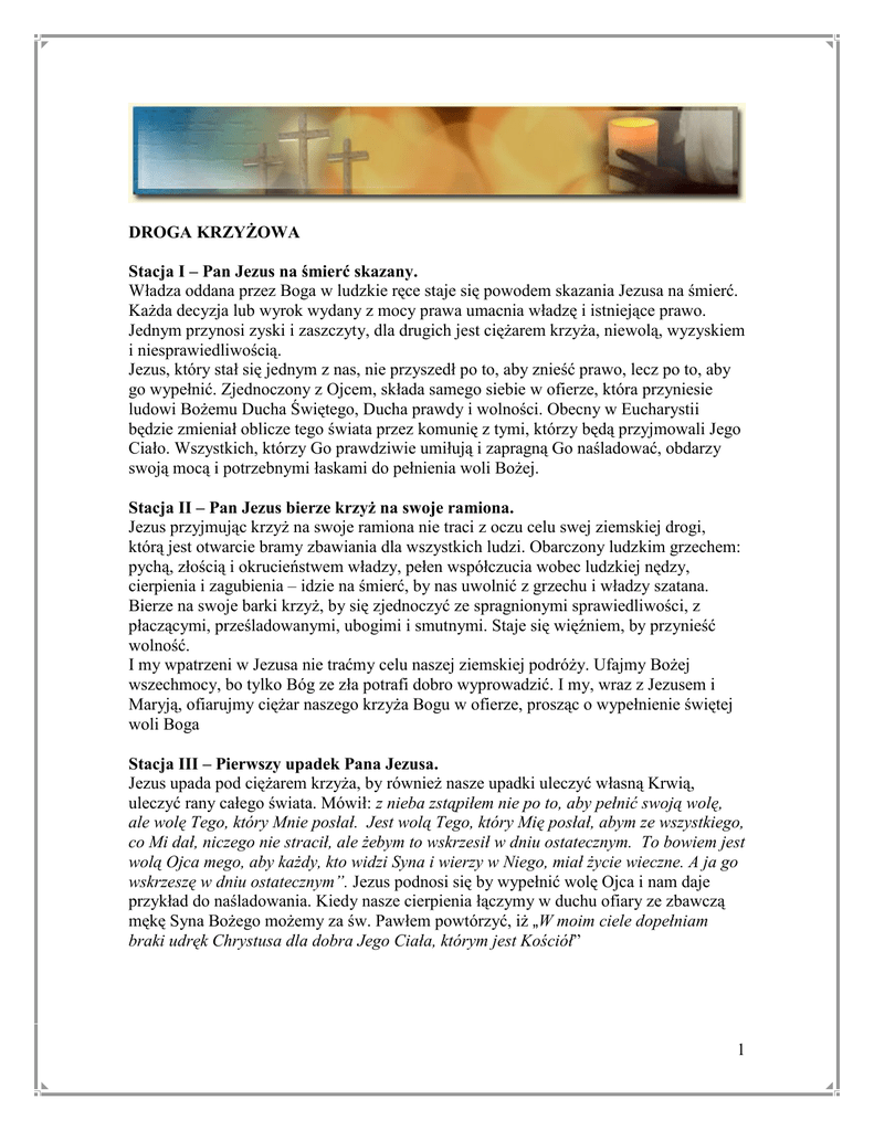 DROGA KRZYŻOWA Stacja I – Pan Jezus na śmierć skazany. Władza oddana przez Boga w ludzkie ręce staje się powodem skazania Jezusa na śmierć. Każda decyzja lub wyrok wydany z mocy prawa umacnia władzę i istniejące prawo. Jednym przynosi zyski i zaszczyty, dla drugich jest ciężarem krzyża, niewolą, wyzyskiem i niesprawiedliwością. Jezus, który stał się jednym z nas, nie przyszedł po to, aby znieść prawo, lecz po to, aby go wypełnić. Zjednoczony z Ojcem, składa samego siebie w ofierze, która przyniesie ludowi Bożemu Ducha Świętego, Ducha prawdy i wolności. Obecny w Eucharystii będzie zmieniał oblicze tego świata przez komunię z tymi, którzy będą przyjmowali Jego Ciało. Wszystkich, którzy Go prawdziwie umiłują i zapragną Go naśladować, obdarzy swoją mocą i potrzebnymi łaskami do pełnienia woli Bożej. Stacja II – Pan Jezus bierze krzyż na swoje ramiona. Jezus przyjmując krzyż na swoje ramiona nie traci z oczu celu swej ziemskiej drogi, którą jest otwarcie bramy zbawiania dla wszystkich ludzi. Obarczony ludzkim grzechem: pychą, złością i okrucieństwem władzy, pełen współczucia wobec ludzkiej nędzy, cierpienia i zagubienia – idzie na śmierć, by nas uwolnić z grzechu i władzy szatana. Bierze na swoje barki krzyż, by się zjednoczyć ze spragnionymi sprawiedliwości, z płaczącymi, prześladowanymi, ubogimi i smutnymi. Staje się więźniem, by przynieść wolność. I my wpatrzeni w Jezusa nie traćmy celu naszej ziemskiej podróży. Ufajmy Bożej wszechmocy, bo tylko Bóg ze zła potrafi dobro wyprowadzić. I my, wraz z Jezusem i Maryją, ofiarujmy ciężar naszego krzyża Bogu w ofierze, prosząc o wypełnienie świętej woli Boga Stacja III – Pierwszy upadek Pana Jezusa. Jezus upada pod ciężarem krzyża, by również nasze upadki uleczyć własną Krwią, uleczyć rany całego świata. Mówił: z nieba zstąpiłem nie po to, aby pełnić swoją wolę, ale wolę Tego, który Mnie posłał. Jest wolą Tego, który Mię posłał, abym ze wszystkiego, co Mi dał, niczego nie stracił, ale żebym to wskrzesił w dniu ostatecznym. To bowiem jest wolą Ojca mego, aby każdy, kto widzi Syna i wierzy w Niego, miał życie wieczne. A ja go wskrzeszę w dniu ostatecznym”. Jezus podnosi się by wypełnić wolę Ojca i nam daje przykład do naśladowania. Kiedy nasze cierpienia łączymy w duchu ofiary ze zbawczą mękę Syna Bożego możemy za św. Pawłem powtórzyć, iż „W moim ciele dopełniam braki udręk Chrystusa dla dobra Jego Ciała, którym jest Kościół” 1 Stacja IV – Pan Jezus spotyka Matkę swoją. Wielka to tajemnica, że wszechmogący Bóg w swoich planach przewidział pomoc słabej Niewiasty i oddanej Służebnicy, w dziele zbawienia świata! Droga krzyżowa Chrystusa staje się również drogą krzyżową Jego Matki. Prawo miłości nie uznaje podziałów. Ból jednoczy, cierpienie scala i utwierdza w miłości. Ona wraz z Synem Bożym dźwiga w swym sercu Jego krzyż, pragnie służyć Bogu, miłuje Jego miłością, i pragnie do końca wypełnić – tak jak Jej Syn – wolę Ojca. Zjednoczeni w tym pragnieniu, Syn i Matka przeżywają podobne boleści i cierpienia z równoczesnym pragnieniem Bożej miłości w ludzkich sercach. Maryja najdoskonalej ze wszystkich ludzi, z miłości do Syna i każdego człowieka, świadomie ofiaruje swoje cierpienia Bogu. Również i my, którzy wysławiamy Maryję i czcimy jako Królową Polski, ofiarujmy Jej nasze cierpienia. Stacja V – Szymon z Cyreny pomaga nieść krzyż Jezusowi. Boża Opatrzność dopuściła taki zbieg okoliczności, by człowiek odczuł przymus sytuacji. Szymon czuje się zniewolony do pomocy. Zmęczony pracą zmusza swe utrudzone ciało do kolejnego wysiłku. Kalkuluje zyski i straty i zmusza się do opanowania, by sprzeciwem nie narazić się żołnierzom i nie otrzymać sroższej kary. Chrystus przyjmuje pomoc z obdarzającą miłością. Do każdego mówi: potrzebuję twojej pomocy, aby Moja miłość w Duchu Świętym mogła być między wami. Każdy, kto pomaga dźwigać krzyż Jezusowi zostaje ogarnięty macierzyńską miłością Niepokalanej. Ona współcierpiąc ze swoim Synem, składa w ofierze przed tronem Bożym każdy ludzki wysiłek. Stacja VI – Weronika ociera twarz Panu Jezusowi. Wyczerpanemu Jezusowi każda pomoc wydaje się być niewystarczająca, bo On dźwiga grzechy całego świata. Tymczasem jakaś niewiasta wiedziona intensywnością Jezusowego cierpienia, postanawia przyjść z pomocą temu, któremu zawdzięcza głębsze rozumienie samej siebie, świata i prawdy o nieśmiertelnej miłości. Miłość wzywa do czynu, do konkretnego dobra wobec bliźniego. Z największą czułością i delikatnością przykłada chustę do zbroczonej krwią twarzy Jezusa… Jej odważna miłość nie pozostaje bez odpowiedzi. W naszych czasach pełnych niesprawiedliwości, kłamstw i wyzysku, pogardy wobec słabych i biednych, Pan Bóg oczekuje od swych wybranych świadectwa życia opartego na Ewangelii. Stacja VII – Pan Jezus upada po raz drugi. Zbawcze cierpienie Jezusa, Jego bezinteresowne i ofiarne oddanie się w ludzkie ręce, przynosi oczyszczenia z piętna grzechu pierworodnego i równocześnie obnaża pychę tego świata. Jezus podnosi się i ogarnia swą miłością cały Kościół, którego bramy piekielne nie przemogą. Odkrył przed uczniami tajemnice swego zjednoczenia z Ojcem i objawił im prawdę o Sobie. Mówił: „Ja jestem w Ojcu, a Ojciec we Mnie”. Wiedział jak trudno będzie im to pojąć. Obiecał posłać Ducha Pocieszyciela, który doprowadzi do pełnej prawdy. A teraz… gdzież oni są? Trwa niewidzialna dla oczu walka z duchami ciemności. Choć objawia się ona w ranach zadanych Jezusowi, to człowiek tej walki wciąż nie rozumie! Św. Paweł w liście do Efezjan poucza: „bój toczymy nie z krwią i z ciałem, lecz z nadziemskimi władzami, ze 2 zwierzchnościami, z władcami tego świata ci