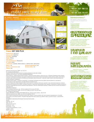 Zainteresowany? NR. OFERTY: 106220301 Zielona Góra, Lubuskie / Cena: 297 000 PLN / Mieszkanie: 82.30 m2 Żeby obejrzeć zadzwoń lub wyślij do nas swoje namiary skontaktujemy sie z Tobą. Dranczewski Bogdan +48503016400 +48683257007 [email protected] Są sytuacje, w których właściciel nieruchomości musi z różnych przyczyn szybko ją sprzedać. Proponujemy Swoim Klientom specjalny system, który pozwoli na szybkie znalezienie nabywcy. Cena: 297 000 PLN Powierzchnia: 82.30 m2 Cena za m2: 3 609 PLN Typ oferty: Sprzedaż Rynek: Wtórny Ilość pieter: 1 Typ nieruchomości: Mieszkanie Nr. piętra: parter Lokalizacja: Lubuskie, Zielona Góra m., Zielona Góra, Jędrzychów Balkon: nie Kuchnia umeblowana: nie Piwnica: nie KUPNO KROK PO KROKU WYNAJEM KROK PO KROKU SPRZEDAŻ KROK PO KROKU Kuchnia wyposażona: nie Kuchnia widna: nie Mieszkanie dwupoziomowe ( MDM) - pow. 82,3 m2 0% - Kupujący nie płaci prowizji. OSIEDLE PODWÓJNA NOWA INWESTYCJA DEWELOPERSKA W ZIELONEJ GÓRZE Apartament Nieruchomości - OFICJALNY PARTNER SPRZEDAŻY Nowa inwestycja - Osiedle Podwójna położone będzie w malowniczej okolicy dzielnicy Jędrzychów przy ul. Podwójnej. Największą zaletą niniejszej inwestycji niewątpliwie jest lokalizacja, która zapewnia doskonałe warunki dla osób chcących zamieszkać w pobliżu centrum miasta, a jednocześnie ceniących ciszę i spokój. Nowoczesna architektura oraz przemyślany układ pomieszczeń, a także plan całego osiedla to efekt długotrwałej pracy zespołu architektów i projektantów. Osiedle Podwójna oferuje 11 budynków mieszkalnych. W zamkniętym kompleksie dominować będzie zabudowa bliźniacza i wielorodzinna harmonizująca nie tylko spójnością brył, ale także detalami architektonicznymi. W ofercie znajdują dwa rodzaje budynków: będzie to pięć budynków w zabudowie bliźniaczej z ogrodami i cztery samodzielne segmenty z czterema dwupoziomowymi apartamentami (MDM)- wszystkie mieszkania w segmentach będą posiadały własny ogródek z indywidualnym miejscem postojowym. Na terenie osiedla będą wybudowane wewnętrzne drogi dojazdowe i cały teren osiedla będzie ogrodzony. Zostaną wykonane chodniki oraz podjazdy z kostki betonowej . DOSTĘPNE W OFERCIE: Dom w zabudowie bliźniaczej - pow. 155,8 m2, działka do 340 m2 cena 467 000 zł Apartament dwupoziomowy ( MDM) - pow. 82,3 m2, działka do 140 m2, cena 297 000 zł 0% - Kupujący nie płaci prowizji. WIĘCEJ INFORMACJI NA WWW.APARTAMENT.NET.PL, lub pod numerem telefonu - 503 016 400. Apartament dwupoziomowy ( MDM) - pow. 82,3 m2 z działką do 140 m2 Jest to unikalna propozycja dla mieszkańców Zielonej Góry. Budynki z czterema lokalami, jak i same mieszkania zaprojektowano z niezwykłą starannością w nowoczesnej stylistyce. Wszystkie lokale będą miały własne ogrody oraz oddzielne wejście z zewnątrz budynku, z bezpośrednim dojazdem. DO KAŻDEGO MIESZKANIA PRZYNALEŻY MIEJSCE POSTOJOWE! UKŁAD: PARTER: - 39,1 m2 Salon- 18,7 m2 Aneks Kuchenny 9,9 m2 Przedsionek - 2 m2 Komunikacja - 1,3 m2 Pomieszczenie gospodarcze - 3,4 m2 Łazienka - 3,8 m2 PIĘTRO - 43,0 m2 ... http://www.apartament.net.pl Piąta Pora Roku > GUMAR Marek Guner > Bachalski Development > Osiedle Mazurskie > AGENCJA APARTAMENT funkcjonuje na polskim rynku nieruchomości od 15 lat! Sprzedaliśmy i wynajęliśmy nieruchomości setkom Klientów, a podobnej liczbie pomogliśmy w kupnie wymarzonej nieruchomości.