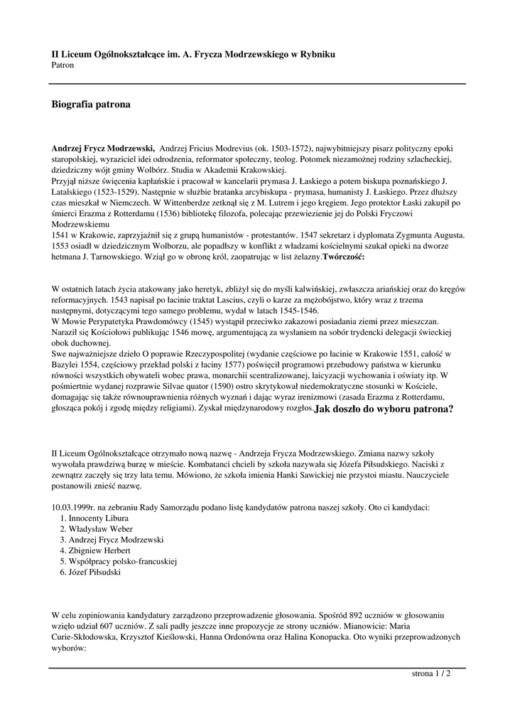 II Liceum Ogólnokształcące im. A. Frycza Modrzewskiego w Rybniku Patron Biografia patrona Andrzej Frycz Modrzewski, Andrzej Fricius Modrevius (ok. 1503-1572), najwybitniejszy pisarz polityczny epoki staropolskiej, wyraziciel idei odrodzenia, reformator społeczny, teolog. Potomek niezamożnej rodziny szlacheckiej, dziedziczny wójt gminy Wolbórz. Studia w Akademii Krakowskiej. Przyjął niższe święcenia kapłańskie i pracował w kancelarii prymasa J. Łaskiego a potem biskupa poznańskiego J. Latalskiego (1523-1529). Następnie w służbie bratanka arcybiskupa - prymasa, humanisty J. Łaskiego. Przez dłuższy czas mieszkał w Niemczech. W Wittenberdze zetknął się z M. Lutrem i jego kręgiem. Jego protektor Łaski zakupił po śmierci Erazma z Rotterdamu (1536) bibliotekę filozofa, polecając przewiezienie jej do Polski Fryczowi Modrzewskiemu 1541 w Krakowie, zaprzyjaźnił się z grupą humanistów - protestantów. 1547 sekretarz i dyplomata Zygmunta Augusta. 1553 osiadł w dziedzicznym Wolborzu, ale popadłszy w konflikt z władzami kościelnymi szukał opieki na dworze hetmana J. Tarnowskiego. Wziął go w obronę król, zaopatrując w list żelazny.Twórczość: W ostatnich latach życia atakowany jako heretyk, zbliżył się do myśli kalwińskiej, zwłaszcza ariańskiej oraz do kręgów reformacyjnych. 1543 napisał po łacinie traktat Lascius, czyli o karze za mężobójstwo, który wraz z trzema następnymi, dotyczącymi tego samego problemu, wydał w latach 1545-1546. W Mowie Perypatetyka Prawdomówcy (1545) wystąpił przeciwko zakazowi posiadania ziemi przez mieszczan. Naraził się Kościołowi publikując 1546 mowę, argumentującą za wysłaniem na sobór trydencki delegacji świeckiej obok duchownej. Swe najważniejsze dzieło O poprawie Rzeczypospolitej (wydanie częściowe po łacinie w Krakowie 1551, całość w Bazylei 1554, częściowy przekład polski z łaciny 1577) poświęcił programowi przebudowy państwa w kierunku równości wszystkich obywateli wobec prawa, monarchii scentralizowanej, laicyzacji wychowania i oświaty itp. W pośmiertnie wydanej rozprawie Silvae quator (1590) ostro skrytykował niedemokratyczne stosunki w Kościele, domagając się także równouprawnienia różnych wyznań i dając wyraz irenizmowi (zasada Erazma z Rotterdamu, głosząca pokój i zgodę między religiami). Zyskał międzynarodowy rozgłos.Jak doszło do wyboru patrona? II Liceum Ogólnokształcące otrzymało nową nazwę - Andrzeja Frycza Modrzewskiego. Zmiana nazwy szkoły wywołała prawdziwą burzę w mieście. Kombatanci chcieli by szkoła nazywała się Józefa Piłsudskiego. Naciski z zewnątrz zaczęły się trzy lata temu. Mówiono, że szkoła imienia Hanki Sawickiej nie przystoi miastu. Nauczyciele postanowili znieść nazwę. 10.03.1999r. na zebraniu Rady Samorządu podano listę kandydatów patrona naszej szkoły. Oto ci kandydaci: 1. Innocenty Libura 2. Władysław Weber 3. Andrzej Frycz Modrzewski 4. Zbigniew Herbert 5. Współpracy polsko-francuskiej 6. Józef Piłsudski W celu zopiniowania kandydatury zarządzono przeprowadzenie głosowania. Spośród 892 uczniów w głosowaniu wzięło udział 607 uczniów. Z sali padły jeszcze inne propozycje ze strony uczniów. Mianowicie: Maria Curie-Skłodowska, Krzysztof Kieślowski, Hanna Ordonówna oraz Halina Konopacka. Oto wyniki przeprowadzonych wyborów: strona 1 / 2 II Liceum Ogólnokształcące im. A. Frycza Modrzewskiego w Rybniku Patron 1. Hanna Ordonówna - 178 głosów 2. A.F. Modrzewski - 146 głosów 3. Krzysztof Kieślowski - 78 głosów 4. M. Curie-Skłodowska - 68 głosów 5. Innocenty Libura - 65 głosów 6. Władysław Weber - 22 głosy 7. Józef Piłsudski - 33 głosy 8. Zbigniew Herbert - 17 głosów Rada Samorządu podjęła uchwałę o przyjęciu propozycji nadania naszej szkole imienia Andrzeja Frycza Modrzewskiego. Uchwałę podjęto jednogłośnie, po konsultacji propozycji Rady Pedagogicznej. Andrzej Frycz Modrzewski to osobowość europejskiego formatu. Wszechstronnie wykształcony, erudyta i pragmatyk działający z równym powodzeniem w kraju, jak i poza jego granicami. Pisarz polityczny bezkompromisowo dążący do poprawy Rzeczypospolitej nie poprzez przedstawianie wizji utopijnych (tak popularnych w renesansie, choćby w twórczości Morusa), lecz poprzez popularyzację idei, które gdzie indziej miały się pojawić dopiero w przyszłości (koncepcja obrony wolności i godności jednostki, postulaty tolerancji i ekumenizmu). To człowiek dialogu, doceniający wagę dysputy, polemiki i perswazji, umiejący słuchać nie tylko sojuszników, ale także przeciwników politycznych. Postawa Andrzeja Frycza Modrzewskiego to przykład konsekwentnej realizacji etosu humanisty, to dowód jego niezwykłej przenikliwości i kultury politycznej oraz obywatelskiej. Pisarstwo stało się dla niego formą służenia ludziom, dochodzenie do prawdy - jego życiowym celem. Próba rozstrzygania sporów przed trybunałem rozumu poprzez dialog i mediację - to zasady jego postępowania. Andrzej Frycz Modrzewski to zwolennik irenizmu, wyznawca humanistycznego ideału jedności chrześcijaństwa. Koncepcja dotycząca konieczności wzajemnych ustępstw dogmatycznych w celu osiągnięcia zgody między wyznaniami była bardzo potrzebna ówczesnej Polsce, państwu wielonarodowemu i wielowyznaniowemu. Podziwiana przez cudzoziemców polska tolerancja - zdaniem J. Tazbira bardziej rozsławiła Polskę niż zwycięstwo pod Grunwaldem i unia lubelska. Gdy próbujemy ocenić poglądy (demokratyzm, irenizm, ekumenizm) i działalność Frycza z perspektywy współczesności - ten renesansowy humanista wydaje się nam niezwykle nowoczesny. Ważne staje się przede wszystkim jego przeświadczenie o zależności między moralnością społeczeństwa a losami państwa i jego pomyślnością. Warto podjąć tę myśl - zwłaszcza w szkole, w pracy z młodzieżą. strona 2 / 2