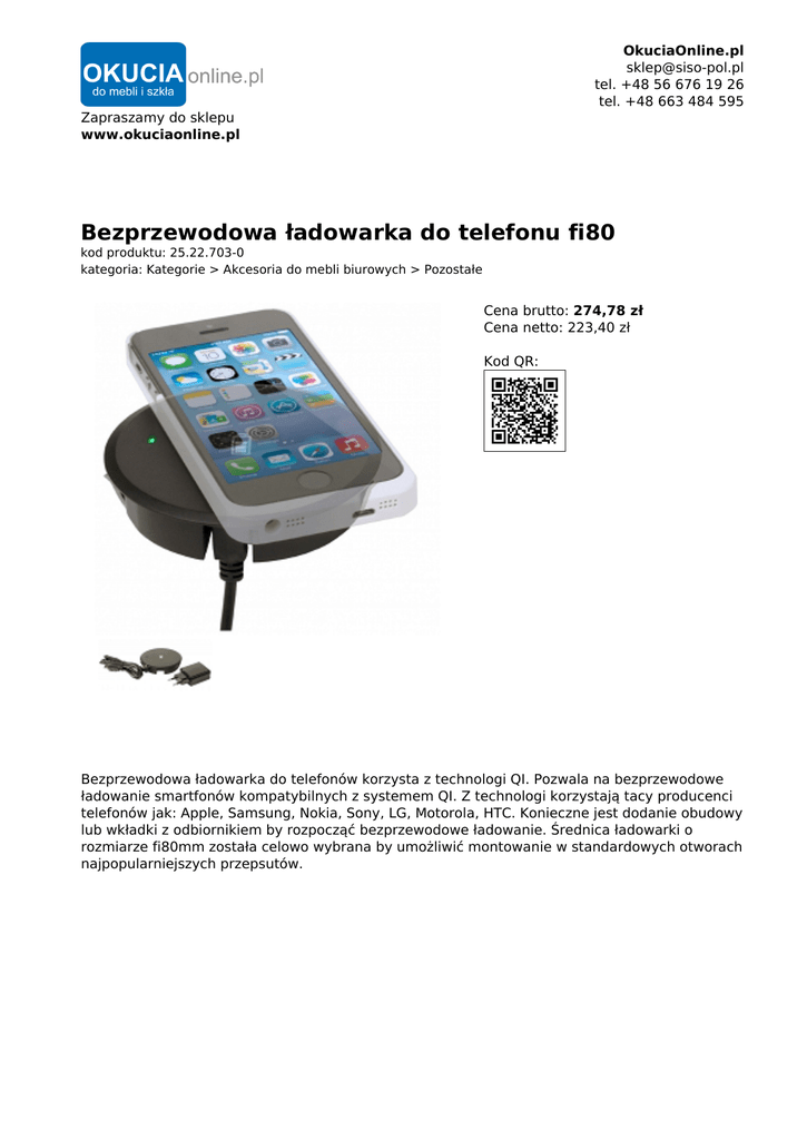 OkuciaOnline.pl [email protected] tel. +48 56 676 19 26 tel. +48 663 484 595 Zapraszamy do sklepu www.okuciaonline.pl Bezprzewodowa ładowarka do telefonu fi80 kod produktu: 25.22.703-0 kategoria: Kategorie > Akcesoria do mebli biurowych > Pozostałe Cena brutto: 274,78 zł Cena netto: 223,40 zł Kod QR: Bezprzewodowa ładowarka do telefonów korzysta z technologi QI. Pozwala na bezprzewodowe ładowanie smartfonów kompatybilnych z systemem QI. Z technologi korzystają tacy producenci telefonów jak: Apple, Samsung, Nokia, Sony, LG, Motorola, HTC. Konieczne jest dodanie obudowy lub wkładki z odbiornikiem by rozpocząć bezprzewodowe ładowanie. Średnica ładowarki o rozmiarze fi80mm została celowo wybrana by umożliwić montowanie w standardowych otworach najpopularniejszych przepsutów. Instrukcja montażu strona: 2/4 wydrukowano: 08-03-2017 http://www.okuciaonline.pl/bezprzewodowa-ladowarka-do-telefonu-fi80.html strona: 3/4 wydrukowano: 08-03-2017 http://www.okuciaonline.pl/bezprzewodowa-ladowarka-do-telefonu-fi80.html Wkładki oraz obudowy do kupienia osobno -> patrz akcesoria poniżej. strona: 4/4 wydrukowano: 08-03-2017 http://www.okuciaonline.pl/bezprzewodowa-ladowarka-do-telefonu-fi80.html