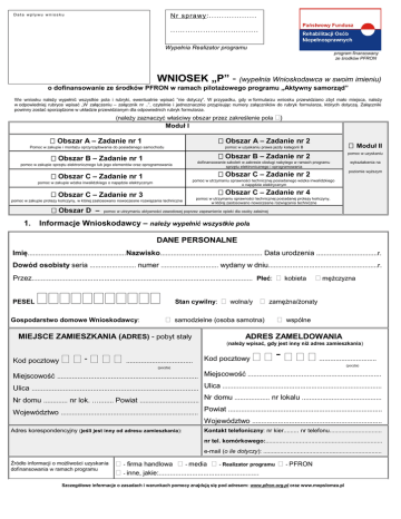 Nr sp ra wy :. .. .. . .. .. . .. .. . .. . Data wpływu wniosku .. .….. . .. .. . .. .. . .. .. . .. .. . .. .. . . Wypełnia Realizator programu program finansowany ze środków PFRON WNIOSEK „P” - (wypełnia Wnioskodawca w swoim imieniu) o dofinansowanie ze środków PFRON w ramach pilotażowego programu „Aktywny samorząd” We wniosku należy wypełnić wszystkie pola i rubryki, ewentualnie wpisać ”nie dotyczy”. W przypadku, gdy w formularzu wniosku przewidziano zbyt mało miejsca, należy w odpowiedniej rubryce wpisać „W załączeniu – załącznik nr ..”, czytelnie i jednoznacznie przypisując numery załączników do rubryk formularza, których dotyczą. Załączniki powinny zostać sporządzone w układzie przewidzianym dla odpowiednich rubryk formularza. (należy zaznaczyć właściwy obszar przez zakreślenie pola ) Moduł I Obszar A – Zadanie nr 1 Obszar A – Zadanie nr 2 Pomoc w zakupie i montażu oprzyrządowania do posiadanego samochodu pomoc w uzyskaniu prawa jazdy kategorii B Obszar B – Zadanie nr 1 pomoc w zakupie sprzętu elektronicznego lub jego elementów oraz oprogramowania Obszar C – Zadanie nr 1 wykształcenia na Obszar C – Zadanie nr 2 poziomie wyższym Obszar C – Zadanie nr 4 Obszar C – Zadanie nr 3 pomoc w zakupie protezy kończyny, w której zastosowano nowoczesne rozwiązania techniczne 1. Obszar B – Zadanie nr 2 dofinansowanie szkoleń w zakresie obsługi nabytego w ramach programu sprzętu elektronicznego i oprogramowania pomoc w utrzymaniu sprawności technicznej posiadanego wózka inwalidzkiego o napędzie elektrycznym pomoc w zakupie wózka inwalidzkiego o napędzie elektrycznym Obszar D – Moduł II pomoc w uzyskaniu pomoc w utrzymaniu sprawności technicznej posiadanej protezy kończyny, w której zastosowano nowoczesne rozwiązania techniczne pomoc w utrzymaniu aktywności zawodowej poprzez zapewnienie opieki dla osoby zależnej Informacje Wnioskodawcy – należy wypełnić wszystkie pola DANE PERSONALNE Imię..................................................... Nazwisko....................................................... Data urodzenia .................................r. Dowód osobisty seria ......................... numer ............................... wydany w dniu...........................................................r. Przez....................................................................................................................... Płeć: kobieta PESEL Gospodarstwo domowe Wnioskodawcy: Stan cywilny: wolna/y zamężna/żonaty samodzielne (osoba samotna) MIEJSCE ZAMIESZKANIA (ADRES) - pobyt stały mężczyzna wspólne ADRES ZAMELDOWANIA (należy wpisać, gdy jest inny niż adres zamieszkania) Kod pocztowy - .................................... Kod pocztowy - ............................... (poczta) (poczta) Miejscowość ............................................................................ Miejscowość ........................................................................ Ulica .......................................................................................... Ulica ...................................................................................... Nr domu ............. nr lok. …........ Powiat ................................ Nr domu ................... nr lokalu ........................................... Województwo .......................................................................... Powiat ................................................................................... Województwo ...................................................................... Adres korespondencyjny (jeśli jest inny od adresu zamieszkania): Kontakt telefoniczny: nr kier......... nr telefonu............................... nr tel. komórkowego:..................................................................... e-mail (o ile dotyczy): ...................................................................... Źródło informacji o możliwości uzyskania dofinansowania w ramach programu - firma handlowa - media - Realizator programu - PFRON - inne, jakie:...................................................... Szczegółowe informacje o zasadach i warunkach pomocy znajdują się pod adresem: www.pfron.org.pl oraz www.mopslomza.pl STRONA 2 STAN PRAWNY DOT. NIEPEŁNOSPRAWNOŚCI (należy zaznaczyć jedno pole ) całkowita niezdolność do pracy i do samodzielnej egzystencji znaczny stopień lub całkowita niezdolność do samodzielnej egzystencji całkowita niezdolność do pracy częściowa niezdolność do pracy I grupa inwalidzka umiarkowany stopień lekki stopień Orzeczenie dot. niepełnosprawności ważne jest: II grupa inwalidzka III grupa inwalidzka okresowo do dnia: .............................................. bezterminowo RODZAJ NIEPEŁNOSPRAWNOŚCI NARZĄD RUCHU 05-R, w zakresie: obu kończyn dolnych obu kończyn górnych jednej kończyny dolnej jednej kończyny górnej innym Wnioskodawca nie porusza się przy pomocy wózka inwalidzkiego: Wnioskodawca porusza się samodzielnie przy pomocy wózka inwalidzkiego: Wnioskodawca porusza się niesamodzielnie przy pomocy wózka inwalidzkiego: NARZĄD WZROKU 04-O osoba niewidoma osoba głuchoniewidoma Lewe oko: Ostrość wzoru (w korekcji):........................... Prawe oko: Ostrość wzoru (w korekcji):................................. Zwężenie pola widzenia: ..................... stopni Zwężenie pola widzenia: ......................... stopni INNE PRZYCZYNY niepełnosprawności wynikające z orzeczenia (proszę zaznaczyć właściwy kod/symbol ): 01-U upośledzenie 03-L zaburzenia głosu, 07-S choroby 09-M choroby umysłowe mowy i choroby słuchu układu moczowo płciowego 02-P - OSOBA GŁUCHA 06-E epilepsja układu oddechowego i krążenia 08-T choroby 10-N układu pokarmowego choroby neurologiczne choroby psychiczne 11-I inne 12-C całościowe zaburzenia rozwojowe AKTYWNOŚĆ ZAWODOWA (dane powinny być potwierdzone zaświadczen