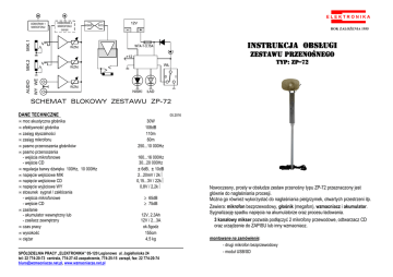 ELEKTRONIKA MIK.1 ODBIORNIK 1 MIKROFONU ODBIORNIK 2 MIKROFONU (opcja) NISKIE 12V WYS. - ROK ZAŁOśENIA 1955 + INSTRUKCJA OBSŁUGI WTA-T-3,15A WZM. ZESTAWU PRZENOŚNEGO TYP: ZP— ZP—72 WŁ WZM. WY WE AUDIO MIK.2 +12 0 I WZM. NISKI ŁAD SCHEMAT BLOKOWY ZESTAWU ZP-72 DANE TECHNICZNE • • • • • • • • • • • • • • • moc akustyczna głośnika efektywność głośnika zasięg słyszalności zasięg mikrofonu pasmo przenoszenia głośników pasmo przenoszenia - wejścia mikrofonowe - wejście CD regulacja barwy dźwięku 100Hz, 10 000Hz napięcie wejściowe MIK napięcie wejściowe CD napięcie wyjściowe WY stosunek sygnał / zakłócenia - wejścia mikrofonowe - wejście CD zasilanie - akumulator wewnętrzny lub - zasilacz zewnętrzny czas pracy wysokość cięŜar 05.2016 30W 108dB 110m 60m 250...10 000Hz 160...16 000Hz 30...20 000Hz ± 6dB, ± 10dB 2...20mV / 2kΩ 0,15...3V / 22kΩ 0,8V / 2,2kΩ ≥ 65dB ≥ 75dB 12V, 2,3Ah 12V / 2...3A ok.5godz 155cm 4,5 kg SPÓŁDZIELNIA PRACY „ELEKTRONIKA” 05-120 Legionowo ul. Jagiellońska 24 tel: 22 774-20-73 centrala, 774-27-43 zaopatrzenie, 774-25-15 zarząd, fax: 22 774-20-74 [email protected], www.wzmacniacze.net.pl Nowoczesny, prosty w obsłudze zestaw przenośny typu ZP-72 przeznaczony jest głównie do nagłaśniania procesji. MoŜna go równieŜ wykorzystać do nagłaśniania pielgrzymek, otwartych przestrzeni itp. Zawiera: mikrofon bezprzewodowy, głośnik (megafon), wzmacniacz i akumulator. Sygnalizację spadku napięcia na akumulatorze oraz procesu ładowania. 3 kanałowy mikser pozwala podłączyć 2 mikrofony przewodowe, odtwarzacz CD oraz urządzenie do ZAPISU lub inny wzmacniacz. montowane na zamówienie: - drugi mikrofon bezprzewodowy - moduł USB/SD UWAGI DLA UśYTKOWNIKA PRZYGOTOWANIE I PODŁĄCZENIE ZESTAWU UWAGA!: Przed włączeniem urządzenia prosimy o zapoznanie się z instrukcją obsługi. Urządzenie wymaga okresowego przeglądu stanu akumulatora. Przy dłuŜszej przerwie naleŜy raz na 3 miesiące przeprowadzić proces ładowanie akumulatora. - Dokonywanie jakichkolwiek przeróbek i napraw zestawu przez osoby nieupowaŜnione do świadczeń gwarancyjnych pozbawia uŜytkownika uprawnień gwarancyjnych oraz moŜe być przyczyną pogorszenia parametrów technicznych i bezpieczeństwa uŜytkowania! Producent zastrzega sobie prawo wprowadzenia zmian w ramach modernizacji i postępu technicznego bez konieczności wprowadzenia ich do instrukcji obsługi o ile nie zmieniają one podstawowych parametrów objętych niniejszą instrukcją. WyposaŜenie zestawu: - instrukcja obsługi, - karta gwarancyjna, - głośnik, - mikrofon bezprzewodowy, - drąŜek, - szelki, - antena, - ładowarka 1 2 - klucz płaski 10/13 - przykręcić i podłączyć głośnik - zamontować drąŜek - nakręcić antenkę - dopasować mocowanie szelek - jeśli zachodzi potrzeba podłączyć: mikrofon przewodowy sygnał AUDIO urządzenie do ZAPISU lub inny wzmacniacz. OBSŁUGA ZESTAWU - włącznikiem (9) (połoŜenie I) załączyć zestaw - świecenie diody (10) - włącznikiem (3) załączyć odbiorniki mikrofonów - świecenie diody (4) - pokrętłami (1, 6) ustawić Ŝądaną głośność w kanałach, a pokrętłem (8) odpowiednią barwę. 5 MIK 1 0 10 5 MIK 2 5 0 WY 10 5 WE 6 AUDIO Opis zestawu 1- Wejścia mikrofonów przewodowych (gniazda JACK) 2- Pokrętła głośności mikrofonów 3- Włącznik odbiornika mikrofonu bezprzewodowego 4- Sygnalizacja załączenia odbiornika 5- Wejście AUDIO (gniazdo CINCH) 6- Pokrętło głośności AUDIO 7- Wyjście (gniazdo CINCH) dla ZAPISU lub innego wzmacniacza 8- Pokrętło barwy dźwięku 9- Włącznik zestawu 10- Dioda PRACA - sygnalizująca pracę zestawu 11- Dioda NISKI - sygnalizująca rozładowany akumulator 12- Gniazdo do przyłączenia ładowarki lub zewnętrznego zasilania 13- Dioda ŁAD sygnalizująca ładowanie akumulatora 14- Wyjście (gniazdo JACK) do podłączenia tuby 7 0 10 ODB.MIK 1,2 3 Do kontroli poziomu napięcia na akumulatorze słuŜy dioda NISKI Świecenie diody NISKI (11) sygnalizuje spadek napięcia na akumulatorze poniŜej 10,5V, naleŜy wówczas przystąpić niezwłocznie do procesu ładowanie akumulatora. Dalsza eksploatacja i spadek napięcia poniŜej 9V automatycznie wyłączy urządzenie i uniemoŜliwi dalszą eksploatację. 0 4 8 NISKIE WYSOKIE 10 ŁADOWANIE AKUMULATORA PRACA I 9 12 0 ELEKTRONIKA www.wmacniacze.net.pl ZESTAW PRZENOŒNY ZP-7 13 £AD AKU NISKI 11 - włącznikiem (9) (połoŜenie 0) wyłączyć zestaw - podłączyć ładowarkę do sieci i do gniazda (12) - świecenie diody ŁAD (13) Świecenie diody ŁAD (13) sygnalizuje proces ładowanie oraz, Ŝe napięcia na akumulatorze jest poniŜej 13,6V W momencie zgaśnięcia diody ŁAD (13) naleŜy przerwać ładowanie akumulatora. ZASILANIE ZEWNĘTRZNE Gniazdo (12) przeznaczone do podłączenia ładowarki moŜna wykorzystać równieŜ do podłączenie zewnętrznego zasilania. MoŜna wykorzystać dostępne napięcie samochodowe 12V albo sieciowy zasilacz stabilizowany. Wybierając się w drogę weź ze sobą zapasowe baterie do mikrofonów. 14 ZP72/1 ZP72/2