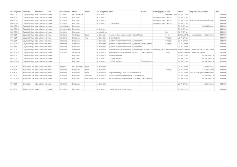 Nr. Artykułu Produkt Mocowanie Opcja 680 001 Czytnik linii pa stal szlachetna Inside Obudowa Typ boczne bez Blackbox Model Do integracji Opis w drzwiach Alarm Funkcja przy Kabel Zamek 680 801 Czytnik linii pa stal szlachetna Inside frontalne Blackbox w drzwiach funkcja przycis Y-kabel GU A-Offner 680 801-1 Czytnik linii pa stal szlachetna Inside frontalne Blackbox w drzwiach funkcja przycis Y-kabel GU A-Offner 680 801-2 Czytnik linii pa stal szlachetna Inside frontalne Blackbox w drzwiach funkcja przycis Y-kabel GU A-Offner 680 801-4 Czytnik linii pa stal szlachetna Inside podtynkowe Blackbox 680 801-5 Czytnik linii pa stal szlachetna Inside frontalne i boc Blackbox w drzwiach 680 801-9 Czytnik linii pa stal szlachetna Inside frontalne Blackbox w ościeżnicy 680 901 Czytnik linii pa stal szlachetna Inside frontalne Whitebox Basic w drzwiach 681 801 Czytnik linii pa stal szlachetna Inside frontalne Blackbox Plus 682 801 Czytnik linii pa stal szlachetna Inside frontalne 682 801-3 Czytnik linii pa stal szlachetna Inside 682 811 Wtyczka okrą Ramka brązowe kable GU A-Offner z zaciskiem GU A-Offner Cena 418,00€ 448,00€ wtyczka okrągła / drzwi drewni 448,00€ 448,00€ 80,5x80,5mm 498,00€ GU A-Offner 448,00€ 9m GU A-Offner 448,00€ 5A moc, Uniwersalny, duża Relais-Platine >=4m do GU A-Offner i elektrozacze 44x75x1,5mm 487,00€ w drzwiach 2 przekaźniki Y-kabel GU A-Offner 498,00€ Blackbox w drzwiach pilot IR do administrowania, 2 przekaźniki Y-kabel GU A-Offner 548,00€ frontalne Blackbox w drzwiach pilot IR do administrowania, 2 przekaź funkcja alarmu Y-kabel GU A-Offner 548,00€ Czytnik linii pa stal szlachetna Inside frontalne Blackbox w drzwiach pilot IR do administrowania, 1 przekaźnik GU A-Offner 498,00€ 682 901 Czytnik linii pa stal szlachetna Inside frontalne Whitebox w drzwiach pilot IR do administrowania, 2 przekaźniki, 5A moc, Uniwersalny, duża Relais-Platine do GU A-Offner i elektrozacze 44x75x1,5mm 682 901-3 Czytnik linii pa stal szlachetna Inside frontalne Whitebox w drzwiach pilot IR do administrowania, 5A moc, 688 801 Czytnik linii pa stal szlachetna Inside Blackbox w drzwiach 689 801 Czytnik linii pa stal szlachetna Inside Blackbox 689 801-3 Czytnik linii pa stal szlachetna Inside Blackbox 670 001 Klawiatura z k stal szlachetna Inside boczne bez Blackbox Basic w drzwiach 670 801 Klawiatura z k stal szlachetna Inside frontalne Blackbox Basic w drzwiach 670 801-1 Klawiatura z k stal szlachetna Inside frontalne Blackbox Basic w drzwiach wtyczka okragla max. 10,6mm srednicy GU A-Offner 671 801 Klawiatura z k stal szlachetna Inside frontalne Blackbox Premium w drzwiach do 150 kodów użytkowników, 2 przekaźniki GU A-Offner 44,6x75,4x1,5 368,00€ 672 801-3 Klawiatura z k stal szlachetna Inside frontalne Blackbox Premium Plus w drzwiach do 150 kodów użytkowników, 2 przeka funkcja alarmu GU A-Offner 44,6x75,4x1,5 388,00€ 677 801 Bluetooth frontalne Blackbox w drzwiach GU A-Offner 44x75x1,5mm 398,00€ 679 801 Bluetooth+Kla szklo frontalne Blackbox w drzwiach stal szlachetna Inside Inside 598,00€ do GU A-Offner i elektrozaczepów 587,00€ RS485 Network GU A-Offner 44,6x75,4x1,5 737,00€ w drzwiach TCP-IP Network GU A-Offner 44,6x75,4x1,5 902,00€ w drzwiach TCP-IP Network GU A-Offner 44,6x75,4x1,5 902,00€ GU A-Offner 44,6x75,4x1,5 318,00€ GU A-Offner 44x75x1,5mm 348,00€ funkcja alarmu >=4m Funkcja alarmu Y-kabel Touch Panel w szkle, design GU A-Offner wtyczka okrągła / drzwi drewni 348,00€ 418,00€