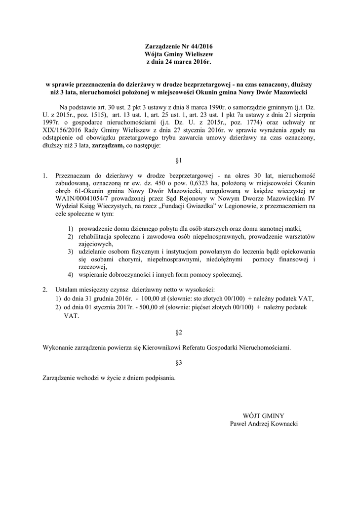 Zarządzenie Nr 44/2016 Wójta Gminy Wieliszew z dnia 24 marca 2016r. w sprawie przeznaczenia do dzierżawy w drodze bezprzetargowej - na czas oznaczony, dłuższy niż 3 lata, nieruchomości położonej w miejscowości Okunin gmina Nowy Dwór Mazowiecki Na podstawie art. 30 ust. 2 pkt 3 ustawy z dnia 8 marca 1990r. o samorządzie gminnym (j.t. Dz. U. z 2015r., poz. 1515), art. 13 ust. 1, art. 25 ust. 1, art. 23 ust. 1 pkt 7a ustawy z dnia 21 sierpnia 1997r. o gospodarce nieruchomościami (j.t. Dz. U. z 2015r., poz. 1774) oraz uchwały nr XIX/156/2016 Rady Gminy Wieliszew z dnia 27 stycznia 2016r. w sprawie wyrażenia zgody na odstąpienie od obowiązku przetargowego trybu zawarcia umowy dzierżawy na czas oznaczony, dłuższy niż 3 lata, zarządzam, co następuje: §1 1. Przeznaczam do dzierżawy w drodze bezprzetargowej - na okres 30 lat, nieruchomość zabudowaną, oznaczoną nr ew. dz. 450 o pow. 0,6323 ha, położoną w miejscowości Okunin obręb 61-Okunin gmina Nowy Dwór Mazowiecki, uregulowaną w księdze wieczystej nr WA1N/00041054/7 prowadzonej przez Sąd Rejonowy w Nowym Dworze Mazowieckim IV Wydział Ksiąg Wieczystych, na rzecz „Fundacji Gwiazdka” w Legionowie, z przeznaczeniem na cele społeczne w tym: 1) prowadzenie domu dziennego pobytu dla osób starszych oraz domu samotnej matki, 2) rehabilitacja społeczna i zawodowa osób niepełnosprawnych, prowadzenie warsztatów zajęciowych, 3) udzielanie osobom fizycznym i instytucjom powołanym do leczenia bądź opiekowania się osobami chorymi, niepełnosprawnymi, niedołężnymi pomocy finansowej i rzeczowej, 4) wspieranie dobroczynności i innych form pomocy społecznej. 2. Ustalam miesięczny czynsz dzierżawny netto w wysokości: 1) do dnia 31 grudnia 2016r. - 100,00 zł (słownie: sto złotych 00/100) + należny podatek VAT, 2) od dnia 01 stycznia 2017r. - 500,00 zł (słownie: pięćset złotych 00/100) + należny podatek VAT. §2 Wykonanie zarządzenia powierza się Kierownikowi Referatu Gospodarki Nieruchomościami. §3 Zarządzenie wchodzi w życie z dniem podpisania. WÓJT GMINY Paweł Andrzej Kownacki