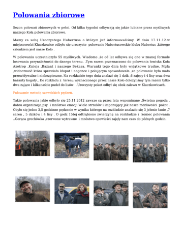 Polowania zbiorowe Sezon polowań zbiorowych w pełni. Od kilku tygodni odbywają się jakże lubiane przez myśliwych naszego Koła polowania zbiorowe. Mamy za sobą Uroczystego Hubertusa o którym już informowaliśmy .W dniu 17.11.12.w miejscowości Kluczkowice odbyło się uroczyste polowanie Hubertusowskie klubu Hubertus ,którego członkiem jest nasze Koło . W polowaniu uczestniczyło 55 myśliwych. Wiadomo ,że od lat odbywa się ono w znanej formule losowania przynależności do danego terenu. .Tym razem przeznaczono do polowania łowiska Koła Azotrop ,Knieja ,Bażant i naszego Bekasa. Warunki tego dnia były wyjątkowo trudne. Mgła ,widoczność która sprawiała kłopot i nagonce i polującym spowodowała ,ze polowanie było mało przewidywalne i niebezpieczne. Na rozkładzie tego dnia znalazł się 1 dzik ,6 zajęcy i 4 lisy oraz dwa bażanty koguty.. Do rozkładu z terenu wyznaczonego przez nasze Koło dołożyliśmy tym razem tylko dwa zające i kilkanaście pudeł do lisów. .Uroczysty pokot odbył się obok zalewu w Kluczkowicach. Polowanie metodą szewdzkich pędzeń. Takie polowania jakie odbyło się 25.11.2012 zawsze są przez lata wspominane .Świetna pogoda , dobra organizacja,psy i mnóstwo emocji.Wiele strzałów i imponujący jak nasze możliwości pokot . Obyło się jedno 3,5 godzinne pędzenie w wyniku którego na rozkładzie znalazło się 3 jelenie łanie ,7 saren , 5 dzików i 4 lisy . O godz 15tej odtrąbiono zwierzynę na rozkładzie i koniec polowania ..Gorąca grochówka ,czerwone wytrawne i mnóstwo opowieści zajęły nam czas do późnych godzin. Ocena odstrzału Rogaczy W dniu 8 listopada w siedzibie Okręgowej Rady Łowieckiej w Lublinie odbyła się wycena prawidłowości odstrzału sarny rogaczy .Ocenie zostały poddane parostki 48 rogaczy pozyskane w roku gospodarczym 2012 przez członków Bekasa 47 w obwodach dzierżawionych przez nasze Koło. .Pozyskaliśmy po 20 sztuk w obwodach 220 i 203 i 8 sztuk w obwodzie 221 .Obowiązywał nas odstrzał 24 sztuk w klasie drugiej i 24 sztuk w klasie pierwszej. 46 rogaczy otrzymało ocenę jeden punkt zielony x odstrzał prawidłowy ,2 rogacze otrzymały odstrzał nieprawidłowy jeden punkt czerwony x .Jeden z kolegów za złe spreparowanie trofeum otrzymał punkt żółty x Na uwagę zasługuje kilka faktów .Większość rogaczy pozyskujemy na początku sezonu ,najwięcej zaś na przełomie maja i czerwca.Rzadko strzelamy podczas okresu rui .Udaje nam się lepiej oceniać rogacze mimo zwiększania odstrzału .Kolejny rok żaden rogacz nie otrzymał oceny ,odstrzał naganny dwa punkty czerwone xx .Zwiększa się odstrzał rogaczy o masie parostków powyżej 400 gram.Kilka rogaczy to kapitalne myłkusy co do tej pory było w naszych obwodach rzadkością. Parostki 13 szt rogaczy ważyły w przedziale 420 -500 gram zaś 6 sztuk pozostawione zostały do oceny medalowej . O wynikach oceny medalowej poinformujemy w późniejszym terminie. Oczywiście każdy z nas ma prawo do własnej interpretacji zasad gospodarowania populacją sarny .(Odstrzał rogaczy tylko w drugiej klasie ,zmniejszenie udziału kóz w odstrzale ,czy inne bardziej radykalne pomysły). Musimy jednak dostosować gospodarkę łowiecką w swoich obwodach do wymogów aktualnie panujących rozporządzeń w tym zakresie. Korzystając z okazji zachęcamy wszystkich selekcjonerów zwierzyny płowej naszego Koła do udziału w inwentaryzacji zwierzyny, która odbywa się co roku na przełomie lutego i marca ,gdyż tam się decyduje ,odstrzał ilościowy i jakościowy naszych łowisk. Darz bór, Zarząd Koła Hubertus 2012 W dniu 3.11.2012 r z okazji Świętego Huberta patrona Myśliwych ,Leśników i Jeźdźców ,odbyło się uroczyste polowanie zwane Hubertowinami . W domu Myśliwego w miejscowości Jankowa o godz.8 , stawiło się 58 myśliwych i dwie Diany ,którzy polowali w trzech grupach, w dwóch obwodach łowieckich 203 i 220 ,na jelenie,dziki ,sarny ,zające ,lisy i bażanty koguty. Prowadzącymi w tym dniu polowanie byli Kol .Józef Przybycień ,Kol Tomasz Kołodziejczyk i vice Łowczy Mariusz Kuś. Nad sprawnym przebiegiem całej uroczystości czuwali Prezes koła Tadeusz Piłat i Łowczy Koła Jacek Jasik . Polowanie trwało do godz 14 tej.W późnych godzinach popołudniowych na pokocie ułożonym z jedliny i gałązek dębu ,w scenerii płonących ognisk ułożono jak tradycja nakazuje na prawym boku zachowując hierarchię -sarnę kozę ,sarnę koźle ,cztery lisy i dwa zające. Sygnaliści naszego Koła kol Marcin Markowski ,Krzysztof Kosik i stażysta uczeń tech.leśnego Hubert Giza odegrali uroczyste sygnały łowieckie, sarna na rozkładzie ,lis na rozkładzie i zając na rozkładzie. Przystąpiono do uroczystości zaślubin nowo wstępujących członków PZŁ,od nie dawana członków naszego Koła .Magdaleny Minickiej ,Grzegorza Noska ,Waldemara Markiewicza i Jarosława Makosia .W obecności swoich opiekunów złożyli ślubowanie .Rotę ślubowania odczytał Łowczy Koła . Łowczy Koła ogłosił wyniki polowania .Królem polowania został został Kol .Mariusz Walkiewicz który na rozkładzie miał sarnę kozę ,vice królem został Kol .Grzegorz Bochra z koźlęciem na rozkładzie . Wybrano też pudlarza którym został kol .Krzysztof Kosior który to tego dnia był łaskawy dla jeleni ,sarny i lisa.Wyróżnionych udekorowano i wręczono im skromne upominki. Pudlarza zaznaczono długim pomarańczowym szalikiem by zwierzyna go wcześniej zoczyła , kłopotu mu nie sprawiała a i koledzy mieli go na oku. Sygnaliści odegrali sygnał Koniec polowania .Prezes Koła zaprosił Wszystkich uczestników polowania na posiłek na którym królował bigos myśliwski i gulasz z dzika ,przygotowany przez naszego Kol .Tomka Strugałę .Wszystko zostało obficie zakropione przednim winem i czymś mocniejszym. Zarząd Koła Zdjęcia Piotr Skwarek