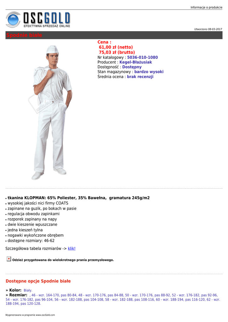 Informacje o produkcie Utworzono 08-03-2017 Spodnie białe Cena : 61,00 zł (netto) 75,03 zł (brutto) Nr katalogowy : 5036-010-1080 Producent : Kegel-Błażusiak Dostępność : Dostępny Stan magazynowy : bardzo wysoki Średnia ocena : brak recenzji ● ● ● ● ● ● ● ● ● tkanina KLOPMAN: 65% Poliester, 35% Bawełna, gramatura 245g/m2 wysokiej jakości nici firmy COATS zapinane na guzik, po bokach w pasie regulacja obwodu zapinkami rozporek zapinany na napy dwie kieszenie wpuszczane jedna kieszeń tylna nogawki wykończone obrębem dostępne rozmiary: 46-62 Szczegółowa tabela rozmiarów -> klik! Odzież przygotowana do wielokrotnego prania przemysłowego. Dostępne opcje Spodnie białe » Kolor: Biały. » Rozmiar: , 46 - wzr. 164-170, pas 80-84, 48 - wzr. 170-176, pas 84-88, 50 - wzr. 170-176, pas 88-92, 52 - wzr. 176-182, pas 92-96, 54 - wzr. 176-182, pas 96-104, 56 - wzr. 182-188, pas 104-108, 58 - wzr. 182-188, pas 108-116, 60 - wzr. 188-194, pas 116-120, 62 - wzr. 188-194, pas 120-128. Wygenerowano w programie www.oscGold.com