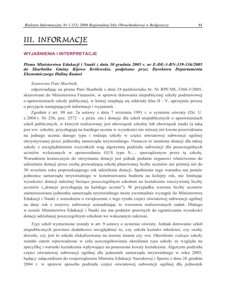 Biuletyn Informacyjny Nr 1 (51) 2006 Regionalnej Izby Obrachunkowej w Bydgoszczy 53 III. INFORMACJE WYJAŚNIENIA I INTERPRETACJE Pismo Ministerstwa Edukacji i Nauki z dnia 30 grudnia 2005 r. nr E-DE-3-BN-339-336/2005 do Skarbnika Gminy Kijewo Królewskie, podpisane przez Dyrektora Departamentu Ekonomicznego Halinę Kumoś Szanowna Pani Skarbnik, odpowiadając na pismo Pani Skarbnik z dnia 24 października br. Nr RPF/ML.3360-3/2005, skierowane do Ministerstwa Finansów, w sprawie dotowania niepublicznej szkoły podstawowej o uprawnieniach szkoły publicznej, w której znajdują się oddziały klas II - V, uprzejmie proszę o przyjęcie następujących informacji i wyjaśnień. Zgodnie z art. 90 ust. 2a ustawy z dnia 7 września 1991 r. o systemie oświaty (Dz. U. z 2004 r. Nr 256, poz. 2572 - z późn. zm.) dotacje dla szkół niepublicznych o uprawnieniach szkół publicznych, w których realizowany jest obowiązek szkolny lub obowiązek nauki (a taką jest ww. szkoła), przysługują na każdego ucznia w wysokości nie niższej niż kwota przewidziana na jednego ucznia danego typu i rodzaju szkoły w części oświatowej subwencji ogólnej otrzymywanej przez jednostkę samorządu terytorialnego. Oznacza to ustalenie dotacji dla takiej szkoły z uwzględnieniem wszystkich wag algorytmu podziału subwencji dla poszczególnych uczniów wykazanych w sprawozdaniu GUS typu S-.... sporządzonym przez tę szkołę. Warunkiem koniecznym do otrzymania dotacji jest jednak podanie organowi właściwemu do udzielania dotacji przez osobę prowadzącą szkołę planowanej liczby uczniów nie później niż do 30 września roku poprzedzającego rok udzielenia dotacji. Spełnienie tego warunku ma pomóc jednostce samorządu terytorialnego w konstruowaniu budżetu na kolejny rok, nie limitując wysokości dotacji należnej bieżąco poszczególnym szkołom na kształcenie rzeczywistej liczby uczniów („dotacje przysługują na każdego ucznia”). W przypadku wzrostu liczby uczniów zainteresowana jednostka samorządu terytorialnego może ewentualnie wystąpić do Ministerstwa Edukacji i Nauki z wnioskiem o zwiększenie z tego tytułu części oświatowej subwencji ogólnej na dany rok z rezerwy subwencji uzasadniając to wzrostem realizowanych zadań. Dlatego w ocenie Ministerstwa Edukacji i Nauki nie ma podstaw prawnych do ograniczania wysokości dotacji udzielanej poszczególnym szkołom we wskazanym zakresie. Typy szkół wymienione zostały w art. 9 ustawy o systemie oświaty. Jednak dotowanie szkół niepublicznych powinno dodatkowo uwzględniać to, czy szkoła kształci młodzież, czy osoby dorosłe, czy jest to szkoła zlokalizowana na terenie miasta czy wsi. Określenie rodzaju szkoły zostało zatem wprowadzone w celu uszczegółowienia określenia typu szkoły ze względu na specyfikę i warunki kształcenia wpływające na ponoszone koszty kształcenia. Algorytm podziału części oświatowej subwencji ogólnej dla jednostek samorządu terytorialnego w roku 2005, będący załącznikiem do rozporządzenia Ministra Edukacji Narodowej i Sportu z dnia 28 grudnia 2004 r. w sprawie sposobu podziału części oświatowej subwencji ogólnej dla jednostek 54 Biuletyn Informacyjny Nr 1 (51) 2006 Regionalnej Izby Obrachunkowej w Bydgoszczy samorządu terytorialnego w roku 2005 (Dz. U. Nr 286, poz. 2878 - z późn. zm.), uwzględnia tę specyfikę szkół niepublicznych o uprawnieniach szkół publicznych. Do algorytmu nie wprowadzono parametrów odnoszących się do stopnia organizacyjnego szkół oraz ramowych planów nauczania uwzględniających tygodniowy wymiar godzin obowiązkowych zajęć edukacyjnych. Na wszystkich uczniów szkół podstawowych i gimnazjów (publicznych i niepublicznych o uprawnieniach szkół publicznych), w których jest realizowany obowiązek szkolny lub obowiązek nauki naliczona została taka sama kwota subwencji z doliczeniem kwoty wynikającej z wagi P1 = 0,38 przysługującej uczniom szkół podstawowych i gimnazjów na wsi i w miastach do 5,0 tys. mieszkańców. W tej sytuacji przysługująca dotacja na każdego ucznia wymienionej na wstępie niepublicznej szkoły podstawowej o uprawnieniach szkoły publicznej winna być naliczona z uwzględnieniem finansowego standardu A, wagi P1 i wskaźnika korygującego Di, a dla uczniów niepełnosprawnych - dodatkowo odpowiedniej wagi w tym zakresie. Natomiast zastosowanie ramowych planów nauczania z uwzględnieniem tygodniowego wymiaru godzin obowiązkowych zajęć edukacyjnych winno mieć miejsce przy ustalaniu planów finansowych szkół prowadzonych przez Gminę Kijewo Królewskie. Wówczas miałoby wpływ na wysokość dotacji dla szkoły publicznej prowadzonej przez osobę prawną lub fizyczną, gdyby taka szkoła funkcjonowała na terenie Gminy Kijewo Królewskie. Pismo Departamentu Finansów Samorządu Terytorialnego Ministerstwa Finansów z dnia 15 lutego 2006 r. nr ST1-4800-70/2006/123 do Urzędu Miejskiego w Tychach, podpisane przez Zastępcę Dyrektora Departamentu Mariannę Borowską W związku z pismem z dnia 12 stycznia 2006 r. Nr DKBI-301/5/06 w sprawie zasad stosowania czwartej cyfry klasyfikacji budżetowej dochodów i wydatków, w związku z realizacją zadań finansowanych lub współfinansowanych ze środków Unii Europejskiej - Ministerstwo Finansów uprzejmie informuje: Wydatki poniesione przez jednostkę samorządu terytorialnego w związku z realizacją programów wspótfinansowanych ze środków pochodzących z budżetu Unii Europejskiej należy ujmować w budżecie jednostki w odpowiednich podziałkach klasyfikacji budżetowej, w zależności od rodzaju wydatków, z odpowiednią czwartą cyfrą dodaną do paragrafu stosownie do zapisów zawartych w załączniku nr 4 rozporządzenia Ministra Finansów z dnia 20 września 2004 r. w sprawie szczegółowej klasyfikacji dochodów, wydatków, przychodów i rozchodów oraz środków pochodzących ze źródeł zagranicznych (Dz. U. Nr 209, poz. 2132 z póź