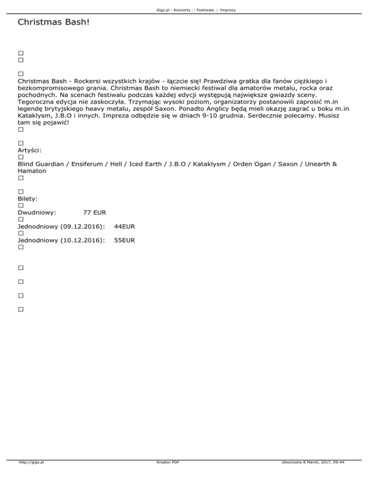 Gigs.pl - Koncerty :: Festiwale :: Imprezy Christmas Bash! Christmas Bash - Rockersi wszystkich krajów - łączcie się! Prawdziwa gratka dla fanów ciężkiego i bezkompromisowego grania. Christmas Bash to niemiecki festiwal dla amatorów metalu, rocka oraz pochodnych. Na scenach festiwalu podczas każdej edycji występują największe gwiazdy sceny. Tegoroczna edycja nie zaskoczyła. Trzymając wysoki poziom, organizatorzy postanowili zaprosić m.in legendę brytyjskiego heavy metalu, zespół Saxon. Ponadto Anglicy będą mieli okazję zagrać u boku m.in Kataklysm, J.B.O i innych. Impreza odbędzie się w dniach 9-10 grudnia. Serdecznie polecamy. Musisz tam się pojawić! Artyści: Blind Guardian / Ensiferum / Hell / Iced Earth / J.B.O / Kataklysm / Orden Ogan / Saxon / Unearth & Hamaton Bilety: Dwudniowy: 77 EUR Jednodniowy (09.12.2016): Jednodniowy (10.12.2016): 44EUR 55EUR http://gigs.pl Kreator PDF Utworzono 8 March, 2017, 09:44