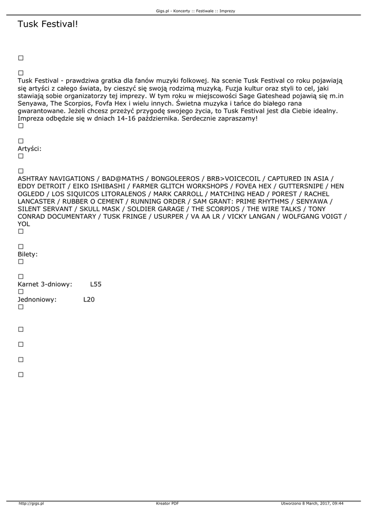 Gigs.pl - Koncerty :: Festiwale :: Imprezy Tusk Festival! Tusk Festival - prawdziwa gratka dla fanów muzyki folkowej. Na scenie Tusk Festival co roku pojawiają się artyści z całego świata, by cieszyć się swoją rodzimą muzyką. Fuzja kultur oraz styli to cel, jaki stawiają sobie organizatorzy tej imprezy. W tym roku w miejscowości Sage Gateshead pojawią się m.in Senyawa, The Scorpios, Fovfa Hex i wielu innych. Świetna muzyka i tańce do białego rana gwarantowane. Jeżeli chcesz przeżyć przygodę swojego życia, to Tusk Festival jest dla Ciebie idealny. Impreza odbędzie się w dniach 14-16 października. Serdecznie zapraszamy! Artyści: ASHTRAY NAVIGATIONS / BAD@MATHS / BONGOLEEROS / BRB>VOICECOIL / CAPTURED IN ASIA / EDDY DETROIT / EIKO ISHIBASHI / FARMER GLITCH WORKSHOPS / FOVEA HEX / GUTTERSNIPE / HEN OGLEDD / LOS SIQUICOS LITORALENOS / MARK CARROLL / MATCHING HEAD / POREST / RACHEL LANCASTER / RUBBER O CEMENT / RUNNING ORDER / SAM GRANT: PRIME RHYTHMS / SENYAWA / SILENT SERVANT / SKULL MASK / SOLDIER GARAGE / THE SCORPIOS / THE WIRE TALKS / TONY CONRAD DOCUMENTARY / TUSK FRINGE / USURPER / VA AA LR / VICKY LANGAN / WOLFGANG VOIGT / YOL Bilety: Karnet 3-dniowy: Jednoniowy: L55 L20 http://gigs.pl Kreator PDF Utworzono 8 March, 2017, 09:44
