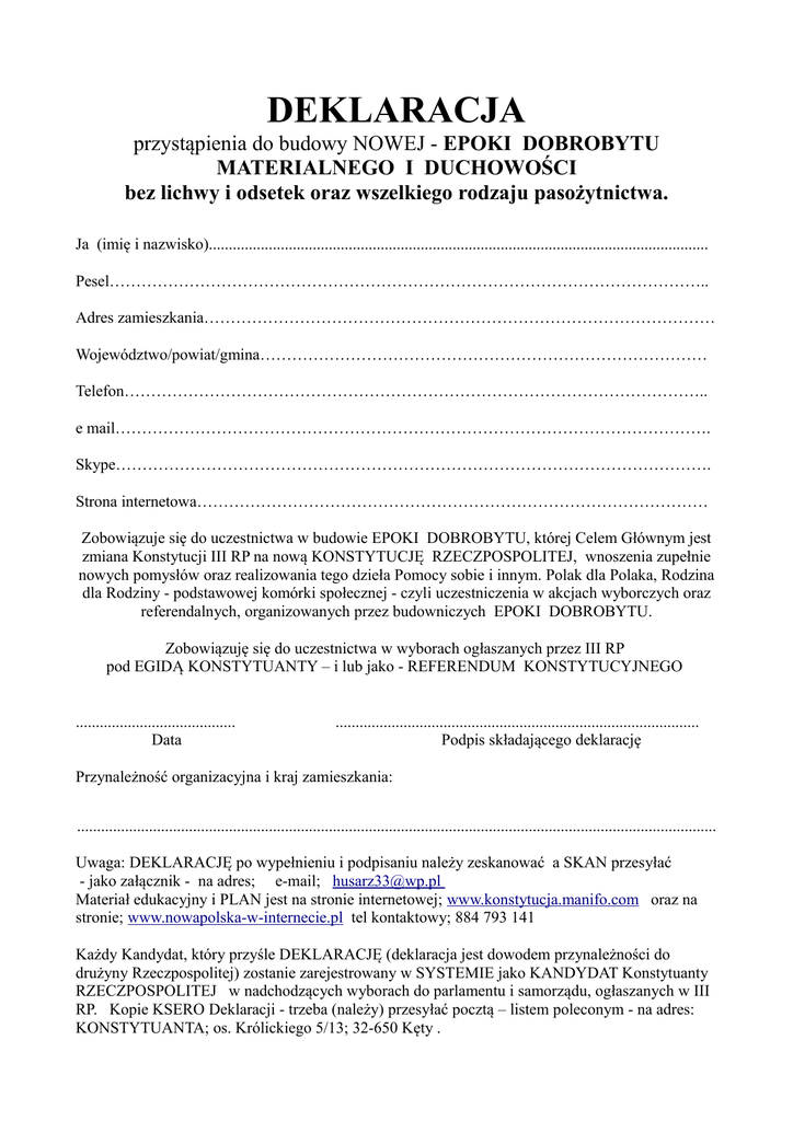 DEKLARACJA przystąpienia do budowy NOWEJ - EPOKI DOBROBYTU MATERIALNEGO I DUCHOWOŚCI bez lichwy i odsetek oraz wszelkiego rodzaju pasożytnictwa. Ja (imię i nazwisko)............................................................................................................................. Pesel………………………………………………………………………………………………….. Adres zamieszkania…………………………………………………………………………………… Województwo/powiat/gmina………………………………………………………………………… Telefon……………………………………………………………………………………………….. e mail…………………………………………………………………………………………………. Skype…………………………………………………………………………………………………. Strona internetowa…………………………………………………………………………………… Zobowiązuje się do uczestnictwa w budowie EPOKI DOBROBYTU, której Celem Głównym jest zmiana Konstytucji III RP na nową KONSTYTUCJĘ RZECZPOSPOLITEJ, wnoszenia zupełnie nowych pomysłów oraz realizowania tego dzieła Pomocy sobie i innym. Polak dla Polaka, Rodzina dla Rodziny - podstawowej komórki społecznej - czyli uczestniczenia w akcjach wyborczych oraz referendalnych, organizowanych przez budowniczych EPOKI DOBROBYTU. Zobowiązuję się do uczestnictwa w wyborach ogłaszanych przez III RP pod EGIDĄ KONSTYTUANTY – i lub jako - REFERENDUM KONSTYTUCYJNEGO ........................................ Data ........................................................................................... Podpis składającego deklarację Przynależność organizacyjna i kraj zamieszkania: ................................................................................................................................................................ Uwaga: DEKLARACJĘ po wypełnieniu i podpisaniu należy zeskanować a SKAN przesyłać - jako załącznik - na adres; e-mail; [email protected] Materiał edukacyjny i PLAN jest na stronie internetowej; www.konstytucja.manifo.com oraz na stronie; www.nowapolska-w-internecie.pl tel kontaktowy; 884 793 141 Każdy Kandydat, który przyśle DEKLARACJĘ (deklaracja jest dowodem przynależności do drużyny Rzeczpospolitej) zostanie zarejestrowany w SYSTEMIE jako KANDYDAT Konstytuanty RZECZPOSPOLITEJ w nadchodzących wyborach do parlamentu i samorządu, ogłaszanych w III RP. Kopie KSERO Deklaracji - trzeba (należy) przesyłać pocztą – listem poleconym - na adres: KONSTYTUANTA; os. Królickiego 5/13; 32-650 Kęty .