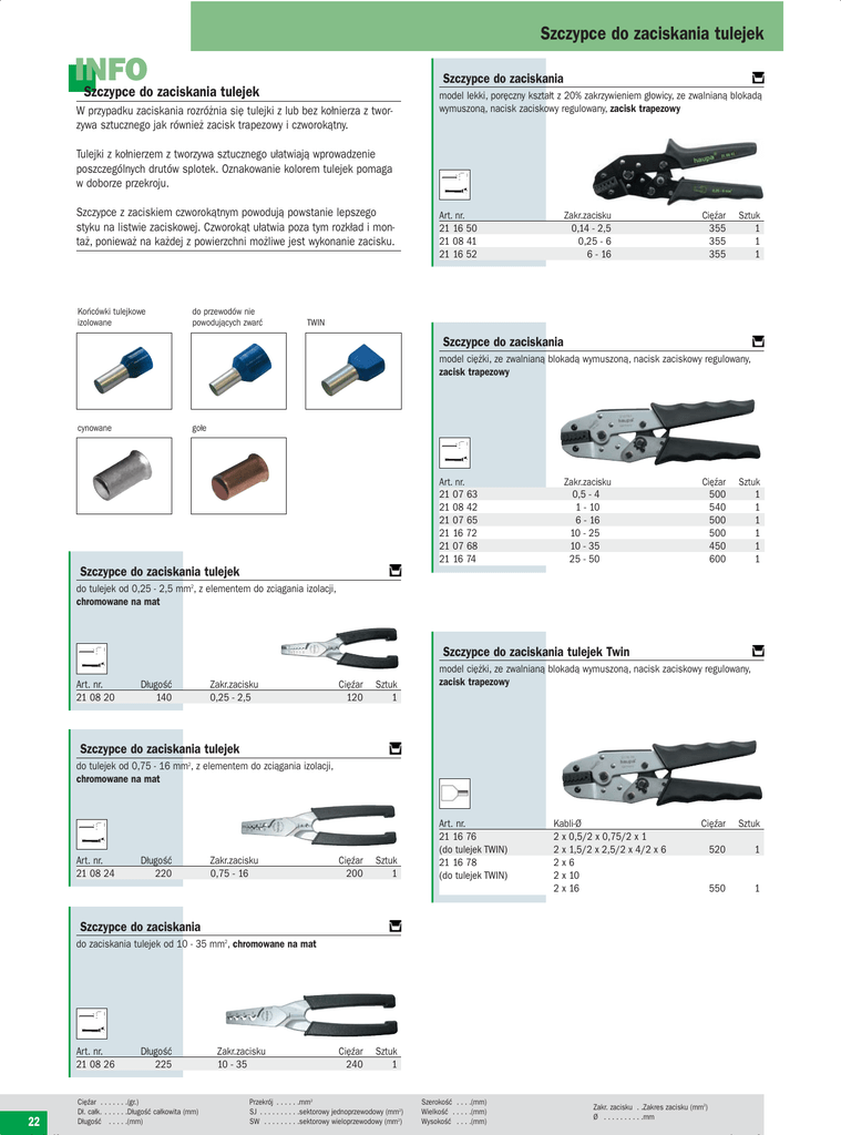 Szczypce do zaciskania tulejek INFO Szczypce do zaciskania Szczypce do zaciskania tulejek W przypadku zaciskania rozróżnia się tulejki z lub bez kołnierza z tworzywa sztucznego jak również zacisk trapezowy i czworokątny. model lekki, poręczny kształt z 20% zakrzywieniem głowicy, ze zwalnianą blokadą wymuszoną, nacisk zaciskowy regulowany, zacisk trapezowy Tulejki z kołnierzem z tworzywa sztucznego ułatwiają wprowadzenie poszczególnych drutów splotek. Oznakowanie kolorem tulejek pomaga w doborze przekroju. Szczypce z zaciskiem czworokątnym powodują powstanie lepszego styku na listwie zaciskowej. Czworokąt ułatwia poza tym rozkład i montaż, ponieważ na każdej z powierzchni możliwe jest wykonanie zacisku. Końcówki tulejkowe izolowane do przewodów nie powodujących zwarć Art. nr. 21 16 50 21 08 41 21 16 52 Zakr.zacisku 0,14 - 2,5 0,25 - 6 6 - 16 Cięźar 355 355 355 Sztuk 1 1 1 TWIN Szczypce do zaciskania model ciężki, ze zwalnianą blokadą wymuszoną, nacisk zaciskowy regulowany, zacisk trapezowy cynowane gołe Art. nr. 21 07 63 21 08 42 21 07 65 21 16 72 21 07 68 21 16 74 Zakr.zacisku 0,5 - 4 1 - 10 6 - 16 10 - 25 10 - 35 25 - 50 Cięźar 500 540 500 500 450 600 Sztuk 1 1 1 1 1 1 Szczypce do zaciskania tulejek do tulejek od 0,25 - 2,5 mm2, z elementem do zciągania izolacji, chromowane na mat Szczypce do zaciskania tulejek Twin Art. nr. 21 08 20 Długość 140 Zakr.zacisku 0,25 - 2,5 Cięźar 120 Sztuk 1 model ciężki, ze zwalnianą blokadą wymuszoną, nacisk zaciskowy regulowany, zacisk trapezowy Szczypce do zaciskania tulejek do tulejek od 0,75 - 16 mm2, z elementem do zciągania izolacji, chromowane na mat Art. nr. 21 08 24 Długość 220 Zakr.zacisku 0,75 - 16 Cięźar 200 Sztuk 1 Art. nr. 21 16 76 (do tulejek TWIN) 21 16 78 (do tulejek TWIN) Kabli-Ø 2 x 0,5/2 x 0,75/2 x 1 2 x 1,5/2 x 2,5/2 x 4/2 x 6 2x6 2 x 10 2 x 16 Cięźar Sztuk 520 1 550 1 Szczypce do zaciskania do zaciskania tulejek od 10 - 35 mm2, chromowane na mat Art. nr. 21 08 26 22 Długość 225 Cięźar . . . . . . .(gr.) Dł. całk. . . . . . .Długość całkowita (mm) Długość . . . . .(mm) Zakr.zacisku 10 - 35 Cięźar 240 Sztuk 1 Przekrój . . . . . .mm2 SJ . . . . . . . . . .sektorowy jednoprzewodowy (mm2) SW . . . . . . . . .sektorowy wieloprzewodowy (mm2) Szerokość . . . .(mm) Wielkość . . . . .(mm) Wysokość . . . .(mm) Zakr. zacisku . .Zakres zacisku (mm2) Ø . . . . . . . . . .mm Szczypce do zaciskania 1 Szczypce do zaciskania do tulejek, do czystego, równego zacisku, duźa wydajność, połączenie zaciskowe zgodne z DIN, profil zacisku ustawiany automatycznie to tulejek od 10 - 50 mm2, tulejek podwójnych 2 x 4 do 2 x 16 mm2, zacisk trapezowy, z blokadą 2 3 4 Art. nr. 21 08 04 Zakr.zacisku 0,08 - 10,0 Cięźar 980 Sztuk 1 Art. nr. 21 07 88 do tulejek TWIN Kabli-Ø 10 - 50 2 x 4 - 2 x 16 Cięźar 800 Sztuk 1 5 6 7 8 Szczypce do zaciskania to Addo tulejek od 50 -- 95 mm2, z blokadą, zacisk trapezowy 9 Szczypce do zaciskania czołowego 2 zakres zacisku od 0,08 do 10 mm , precyzyjna technika zaciskania czworokątnego, automatycznie ustawianie przekroju przewodu, czołowe wprowadzanie przewodu ułatwia zastosowanie w ciasnych miejscach, możliwość wprowadzania bocznego dla tulejek do 2,5 mm2, zwalniana blokada wymuszona, wysokie przełożenie i ergonomiczny kształt rękojeści z tworzywa sztucznego zapewniają łatwą pracę, regulacja nacisku zaciskania, zacisk czworokątny 10 11 Art. nr. 21 07 89 Kabli-Ø 50 - 95 Cięźar 800 Sztuk 1 12 13 14 Pneumatyczne urządzenie zaciskowe HAUPA Art. nr. 21 08 19 Zakr.zacisku 0,08 - 10 Cięźar 500 Sztuk 1 Za pomocą pneumatycznych urządzeń zaciskowych można szybko i bez trudu zaciskać końcówki tulejkowe. Są one lekkie i poręczne i dzięki temu nadają się doskonale do montażu szaf rozdzielczych. W przypadku modeli stołowych operacje dokonywane są za pomocą włącznika nożnego. Tym samym obie ręce są wolne do montowania końcówek tulejkowych w przewodach. Urządzenia nie wymagają konserwacji, ciśnienie wynoszące 4 – 6 barów gwarantuje bezpieczne połączenie. Dzięki stabilnej obudowie poliamidowej nadają się do każdych zastosowań przemysłowych. 15 16 17 18 19 Szczypce do zaciskania czołowego szczypce do zaciskania czołowego z automatycznym ustawieniem przekroju przewodu, pojedynczy profil zacisku o dużym zakresie przekroju, ze zwalnianą blokadą wymuszoną, regulacja nacisku zaciskania, zacisk trapezowy Nowość 20 21 Art. nr. 21 70 30 21 70 40 Art. nr. 21 09 79 21 09 79/A 21 09 79/B Zakr.zacisku 0,14 - 6 2,5 - 10 10 - 16 Cięźar 500 500 500 Sztuk 1 1 1 Zakres zaciskowy Ø mm 0.25-2.5 mm2/24-14 AWG 44 x 200 4-10 mm2/12-8 AWG 44 x 200 Cięźar 400 400 Sztuk 1 1 22 Dołączony spiralny wąż przyłączeniowy 2 m 23 Pneumatyczne urządzenia zaciskowe HAUPA Modele stołowe 24 25 Nowość 26 27 28 Art. nr. 21 70 10 21 70 20 Zakres zaciskowy Ø mm 0.25-2.5 mm2/24-14 AWG 140 x 200 x 70 4-10 mm2/12-8 AWG 140 x 200 x 70 Cięźar Sztuk 1000 1 1000 1 Dołączony spiralny wąż przyłączeniowy, włącznik nożny i zacisk stołowy Szeroki asortyment końcówek tulejkowych znajdziecie Państwo od str. 52 30 31 ...rozwiązania, które przekonują 23 29 HAUPA, Königstr. 165-169, 42853 Remscheid, Tel.: +49 (0)2191 8418-0, Fax: +49 (0)2191 8418-840, [email protected]; HAUPA POLSKA Sp.z.o.o., ul. Norwida 11, PL 55-100 Trzebnica, Tel.: +48 713874813, Fax: +48 713874814, [email protected] 32