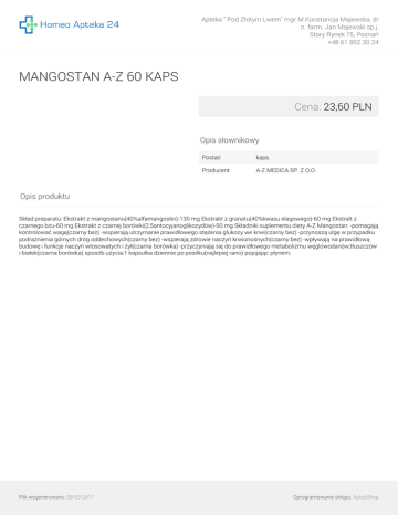 Apteka " Pod Złotym Lwem" mgr M.Konstancja Majewska, dr n. farm. Jan Majewski sp.j. Stary Rynek 75, Poznań +48 61 852 30 24 MANGOSTAN A-Z 60 KAPS Cena: 23,60 PLN Opis słownikowy Postać kaps. Producent A-Z MEDICA SP. Z O.O. Opis produktu Skład preparatu: Ekstrakt z mangostanu(40%alfamangostin)-130 mg Ekstrakt z granatu(40%kwasu elagowego)-60 mg Ekstralt z czarnego bzu-60 mg Ekstrakt z czarnej borówki(2,5antocyjanoglikozydów)-50 mg Składniki suplementu diety A-Z Mangostan: -pomagają kontrolować wagę(czarny bez) -wspierają utrzymanie prawidłowego stężenia glukozy we krwi(czarny bez) -przynoszą ulgę w przypadku podrażnienia górnych dróg oddechowych(czarny bez) -wspierają zdrowie naczyń krwionośnych(czarny bez) -wpływają na prawidłową budowę i funkcje naczyń włosowatych i żył(czarna borówka) -przyczyniają się do prawidłowego metabolizmu węglowodanów,tłuszczów i białek(czarna borówka) sposób użycia;1 kapsułka dziennie po posiłku(najlepiej rano) popijając płynem. Plik wygenerowano: 08-03-2017 Powered by TCPDF (www.tcpdf.org) Oprogramowanie sklepu: AptusShop