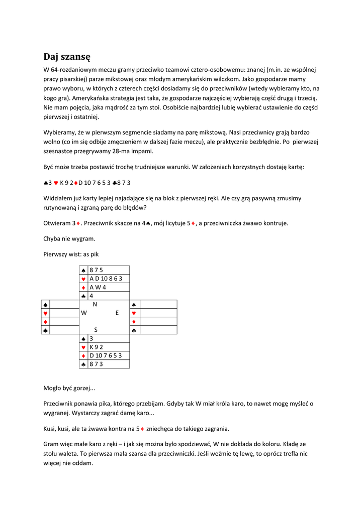 Daj szansę W 64-rozdaniowym meczu gramy przeciwko teamowi cztero-osobowemu: znanej (m.in. ze wspólnej pracy pisarskiej) parze mikstowej oraz młodym amerykańskim wilczkom. Jako gospodarze mamy prawo wyboru, w których z czterech części dosiadamy się do przeciwników (wtedy wybieramy kto, na kogo gra). Amerykańska strategia jest taka, że gospodarze najczęściej wybierają część drugą i trzecią. Nie mam pojęcia, jaka mądrość za tym stoi. Osobiście najbardziej lubię wybierać ustawienie do części pierwszej i ostatniej. Wybieramy, że w pierwszym segmencie siadamy na parę mikstową. Nasi przeciwnicy grają bardzo wolno (co im się odbije zmęczeniem w dalszej fazie meczu), ale praktycznie bezbłędnie. Po pierwszej szesnastce przegrywamy 28-ma impami. Być może trzeba postawić trochę trudniejsze warunki. W założeniach korzystnych dostaję kartę: 3 K 9 2D 10 7 6 5 3 8 7 3 Widziałem już karty lepiej najadające się na blok z pierwszej ręki. Ale czy grą pasywną zmusimy rutynowaną i zgraną parę do błędów? Otwieram 3. Przeciwnik skacze na 4, mój licytuje 5, a przeciwniczka żwawo kontruje. Chyba nie wygram. Pierwszy wist: as pik 875 A D 10 8 6 3 AW4 4 N W E S 3 K92 D 10 7 6 5 3 873 Mogło być gorzej... Przeciwnik ponawia pika, którego przebijam. Gdyby tak W miał króla karo, to nawet mogę myśleć o wygranej. Wystarczy zagrać damę karo... Kusi, kusi, ale ta żwawa kontra na 5 zniechęca do takiego zagrania. Gram więc małe karo z ręki – i jak się można było spodziewać, W nie dokłada do koloru. Kładę ze stołu waleta. To pierwsza mała szansa dla przeciwniczki. Jeśli weźmie tę lewę, to oprócz trefla nic więcej nie oddam. Niestety, na tym poziomie nie ma co liczyć na łatwe błędy. Dziesiątka karo bierze lewę. Ponawiam pokusę – gram małe karo spod asa. Znowu – wskoczenie królem to wpadka tylko bez jednej. Nic z tego. Biorę lewę na damę i chyba muszę się poddać na bez dwóch. Ale widzę jeszcze jedną szansę na zmuszenie przeciwniczki do błędu. Trzeba tylko pohamować odruch bezpiecznego rozegrania kierów (kier do asa i z powrotem do króla). Gram z ręki króla kier i kiera do asa (oboje przeciwnicy dokładają). W ten sposób sugeruję, że mam tylko dwa kiery w ręku. 87 D 10 8 6 A 4 N W E S K9 3 2 10 7 6 5 873 Gdy ze stołu gram damę kier, przeciwniczka ma pewien problem: Jeśli to ja mam dubla kier, to przebicie dziewiątką karo wypuszcza kontrakt! (Nadbiję i dojdę asem karo do dobrych kierów.) Nie tym razem. Przeciwniczka przebija dziewiątką i gra dwa razy w trefla, zmuszając mnie do przebicia asem karo. Bez dwóch. Na drugim stole nasi partnerzy licytowali do 5, a na kontrakt 6 nie pozostawili żadnych złudzeń. (Po wiście pikowym zagrano dwa razy w trefla i musiało być bez trzech.) Post Scriptum 1) Nie można zakładać, że przeciwnicy będę robili proste błędy 2) Ale to nie zwalnia nas z obowiązku dawania im szansy.
