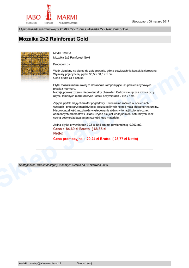 Utworzono : 08 marzec 2017 Płytki mozaiki marmurowej > kostka 2x2x1 cm > Mozaika 2x2 Rainforest Gold Mozaika 2x2 Rainforest Gold Model : 38 SA Mozaika 2x2 Rainforest Gold Producent : Wzór układany na siatce do zafugowania, górna powierzchnia kostek lakierowana. Wymiary pojedynczej płytki: 30,5 x 30,5 x 1 cm Cena brutto za 1 sztuke. r a Płytki mozaiki marmurowej to doskonale komponujące uzupełnienie typowych płytek z marmuru. Nadają pomieszczeniu niepowtarzalny charakter. Całkowicie ręczna robota przy użyciu łamanych marmurowych kostek o wymiarach 2 x 2 x 1cm. M o Zdjęcia płytek mają charakter poglądowy. Ewentualne różnice w odcieniach, wzorach i przebarwieniach poszczególnych kostek mają charakter naturalny. Niepowtarzalność, możliwość występowania różnic w tonacji kolorystycznej, odmiennych przerostów i układu użyleń nie jest wadą kamieni naturalnych, lecz cechą potwierdzającą autentyczność tego materiału. b a J Jedna płytka o wymiarach 30,5 x 30,5 cm ma powierzchnię 0,093 m2. Cena : 84,69 zł Brutto ( 68,85 zł Netto) Cena promocyjna : 29,24 zł Brutto ( 23,77 zł Netto) p e l k S Dostępność: Produkt dostępny w naszym sklepie od 02 czerwiec 2009 kontakt : - [email protected] Strona 1/{nb} i m