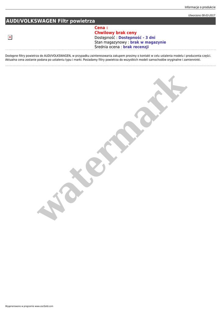 Informacje o produkcie Utworzono 08-03-2017 AUDI/VOLKSWAGEN Filtr powietrza Cena : Chwilowy brak ceny Dostępność : Dostępność - 3 dni Stan magazynowy : brak w magazynie Średnia ocena : brak recenzji w at er m ar k Dostępne filtry powietrza do AUDI/VOLKSWAGEN, w przypadku zainteresowania zakupem prosimy o kontakt w celu ustalenia modelu i producenta części. Aktualna cena zostanie podana po ustaleniu typu i marki. Posiadamy filtry powietrza do wszystkich modeli samochodów oryginalne i zamienninki. Wygenerowano w programie www.oscGold.com