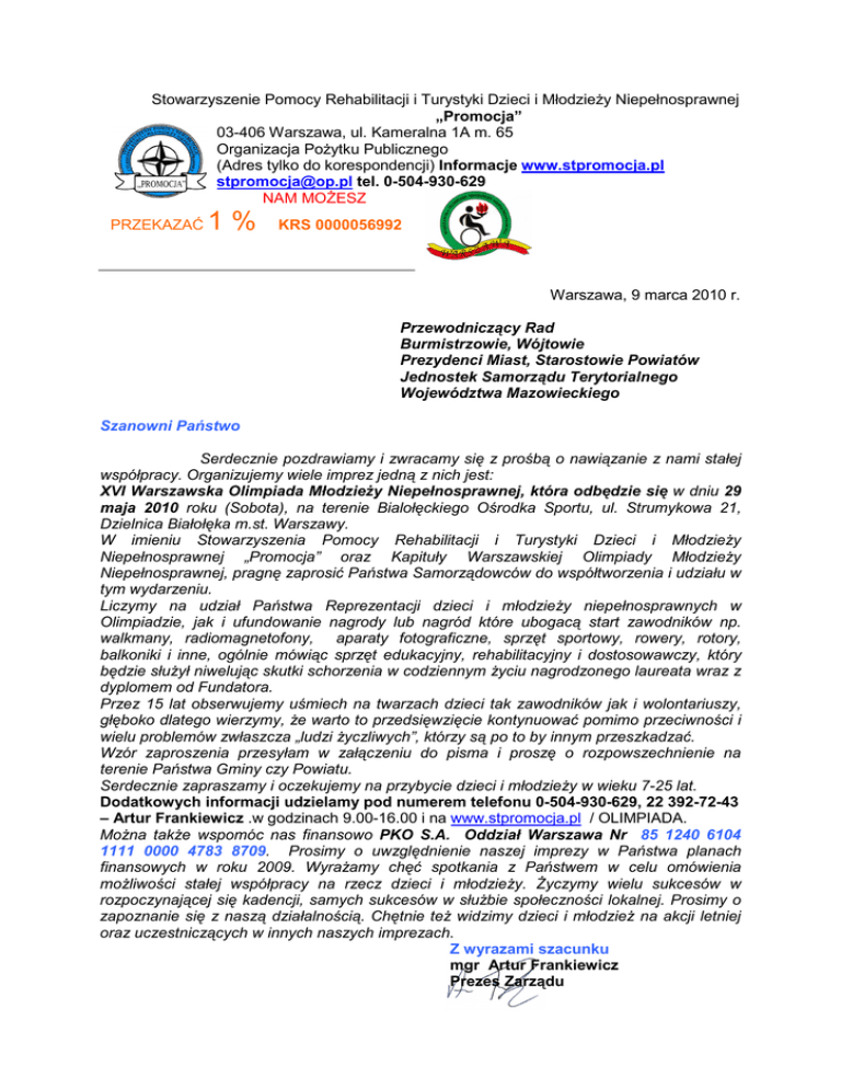 Stowarzyszenie Pomocy Rehabilitacji i Turystyki Dzieci i MłodzieŜy Niepełnosprawnej „Promocja” 03-406 Warszawa, ul. Kameralna 1A m. 65 Organizacja PoŜytku Publicznego (Adres tylko do korespondencji) Informacje www.stpromocja.pl [email protected] tel. 0-504-930-629 NAM MOśESZ PRZEKAZAĆ 1% KRS 0000056992 Warszawa, 9 marca 2010 r. Przewodniczący Rad Burmistrzowie, Wójtowie Prezydenci Miast, Starostowie Powiatów Jednostek Samorządu Terytorialnego Województwa Mazowieckiego Szanowni Państwo Serdecznie pozdrawiamy i zwracamy się z prośbą o nawiązanie z nami stałej współpracy. Organizujemy wiele imprez jedną z nich jest: XVI Warszawska Olimpiada MłodzieŜy Niepełnosprawnej, która odbędzie się w dniu 29 maja 2010 roku (Sobota), na terenie Bialołęckiego Ośrodka Sportu, ul. Strumykowa 21, Dzielnica Białołęka m.st. Warszawy. W imieniu Stowarzyszenia Pomocy Rehabilitacji i Turystyki Dzieci i MłodzieŜy Niepełnosprawnej „Promocja” oraz Kapituły Warszawskiej Olimpiady MłodzieŜy Niepełnosprawnej, pragnę zaprosić Państwa Samorządowców do współtworzenia i udziału w tym wydarzeniu. Liczymy na udział Państwa Reprezentacji dzieci i młodzieŜy niepełnosprawnych w Olimpiadzie, jak i ufundowanie nagrody lub nagród które ubogacą start zawodników np. walkmany, radiomagnetofony, aparaty fotograficzne, sprzęt sportowy, rowery, rotory, balkoniki i inne, ogólnie mówiąc sprzęt edukacyjny, rehabilitacyjny i dostosowawczy, który będzie słuŜył niwelując skutki schorzenia w codziennym Ŝyciu nagrodzonego laureata wraz z dyplomem od Fundatora. Przez 15 lat obserwujemy uśmiech na twarzach dzieci tak zawodników jak i wolontariuszy, głęboko dlatego wierzymy, Ŝe warto to przedsięwzięcie kontynuować pomimo przeciwności i wielu problemów zwłaszcza „ludzi Ŝyczliwych”, którzy są po to by innym przeszkadzać. Wzór zaproszenia przesyłam w załączeniu do pisma i proszę o rozpowszechnienie na terenie Państwa Gminy czy Powiatu. Serdecznie zapraszamy i oczekujemy na przybycie dzieci i młodzieŜy w wieku 7-25 lat. Dodatkowych informacji udzielamy pod numerem telefonu 0-504-930-629, 22 392-72-43 – Artur Frankiewicz .w godzinach 9.00-16.00 i na www.stpromocja.pl / OLIMPIADA. MoŜna takŜe wspomóc nas finansowo PKO S.A. Oddział Warszawa Nr 85 1240 6104 1111 0000 4783 8709. Prosimy o uwzględnienie naszej imprezy w Państwa planach finansowych w roku 2009. WyraŜamy chęć spotkania z Państwem w celu omówienia moŜliwości stałej współpracy na rzecz dzieci i młodzieŜy. śyczymy wielu sukcesów w rozpoczynającej się kadencji, samych sukcesów w słuŜbie społeczności lokalnej. Prosimy o zapoznanie się z naszą działalnością. Chętnie teŜ widzimy dzieci i młodzieŜ na akcji letniej oraz uczestniczących w innych naszych imprezach. Z wyrazami szacunku mgr Artur Frankiewicz Prezes Zarządu