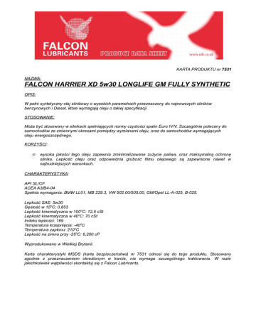 KARTA PRODUKTU nr 7531 NAZWA: FALCON HARRIER XD 5w30 LONGLIFE GM FULLY SYNTHETIC OPIS: W pełni syntetyczny olej silnikowy o wysokich parametrach przeznaczony do najnowszych silników benzynowych i Diesel, które wymagają oleju o takiej specyfikacji. STOSOWANIE: Może być stosowany w silnikach spełniających normy czystości spalin Euro IV/V. Szczególnie polecany do samochodów ze zmiennymi okresami pomiędzy wymianami oleju, oraz do samochodów wymagających oleju energoszczędnego. KORZYŚCI: • wysoka jakości tego oleju zapewnia zminimalizowane zużycie paliwa, oraz maksymalną ochronę silnika. Lepkość oleju oraz odpowiednia grubość filmu olejowego są zapewnione nawet w najtrudniejszych warunkach. CHARAKTERYSTYKA: API SL/CF ACEA A3/B4-04 Spełnia wymagania: BMW LL01, MB 229.3, VW 502.00/505.00, GM/Opel LL-A-025, B-025. Lepkość SAE: 5w30 Gęstość w 150C: 0,853 Lepkość kinematyczna w 1000C: 12,5 cSt Lepkość kinematyczna w 400C: 70 cSt Indeks lepkości: 169 Temperatura krzepnięcia: -400C Temperatura zapłonu: 2100C Lepkość na zimno przy -250C: 6,200 cP Wyprodukowano w Wielkiej Brytanii. Karta charakterystyki MSDS (karta bezpieczeństwa) nr 7531 odnosi się do tego produktu. Stosowany zgodnie z przeznaczeniem określonym w karcie, nie wymaga szczególnego traktowania. W razie jakichkolwiek wątpliwości skontaktuj się z Falcon Lubricants.