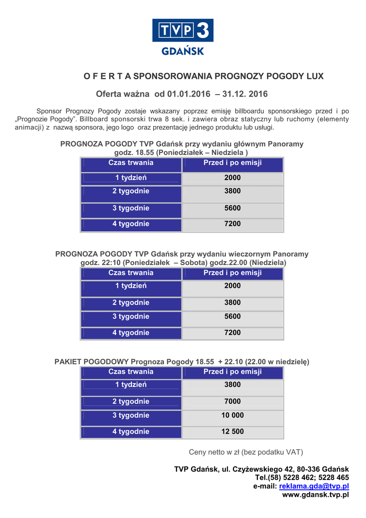 O F E R T A SPONSOROWANIA PROGNOZY POGODY LUX Oferta ważna od 01.01.2016 – 31.12. 2016 Sponsor Prognozy Pogody zostaje wskazany poprzez emisję billboardu sponsorskiego przed i po „Prognozie Pogody”. Billboard sponsorski trwa 8 sek. i zawiera obraz statyczny lub ruchomy (elementy animacji) z nazwą sponsora, jego logo oraz prezentację jednego produktu lub usługi. PROGNOZA POGODY TVP Gdańsk przy wydaniu głównym Panoramy godz. 18.55 (Poniedziałek – Niedziela ) Czas trwania Przed i po emisji 1 tydzień 2000 2 tygodnie 3800 3 tygodnie 5600 4 tygodnie 7200 PROGNOZA POGODY TVP Gdańsk przy wydaniu wieczornym Panoramy godz. 22:10 (Poniedziałek – Sobota) godz.22.00 (Niedziela) Czas trwania Przed i po emisji 1 tydzień 2000 2 tygodnie 3800 3 tygodnie 5600 4 tygodnie 7200 PAKIET POGODOWY Prognoza Pogody 18.55 + 22.10 (22.00 w niedzielę) Czas trwania Przed i po emisji 1 tydzień 3800 2 tygodnie 7000 3 tygodnie 10 000 4 tygodnie 12 500 Ceny netto w zł (bez podatku VAT) TVP Gdańsk, ul. Czyżewskiego 42, 80-336 Gdańsk Tel.(58) 5228 462; 5228 465 e-mail: [email protected] www.gdansk.tvp.pl