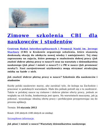 Zimowe szkolenia CBI naukowców i studentów dla Centrum Badań Interdyscyplinarnych i Promocji Nauki im. Jerzego Stachury (CBI) w Krakowie organizuje szkolenia, które stanowią doskonałą okazję do zdobycia nowej wiedzy i umiejętności. Tej zimy zapraszamy na zajęcia, które pomogą w znalezieniu dobrej pracy (Jak znaleźć dobrze płatną pracę w nauce?) oraz na warsztaty z dziennikarstwa naukowego (Jak pisać i mówić o nauce?) i z PR w nauce (Jak promować naukę?). Nasi zarejestrowani użytkownicy mogą otrzymać atrakcyjną zniżkę na każde z nich. Jak znaleźć dobrze płatną pracę w nauce? Szkolenie dla naukowców i studentów Każdy polski naukowiec marzy, aby zarabiać tyle, ile kolega na Zachodzie i pracować w podobnych warunkach. Mało kto jednak potrafi się o to zazdrościć. Także w polskiej nauce są ciekawe i dobrze płatne oferty pracy, jednak ze względu na ich liczbę, konkurencja jest spora. Na warsztatach nauczymy, jak ją pokonać, wyszukując idealną ofertę pracy i perfekcyjnie przygotowując się do procesu aplikacji. Termin: 14 stycznia 2012 Koszt: 230 złotych (180 złotych ze zniżką) Szczegółowe informacje. Jak pisać i mówić o nauce? Warsztaty dziennikarstwa naukowego Czemu informacje naukowe tak rzadko trafiają na pierwsze strony gazet? Czy nauka jest mniej ciekawa niż polityka, ekonomia czy sport? Wcale nie! Problem jest zupełnie inny: naukowcy rzadko potrafią opowiadać o swoich osiągnięciach w sposób prosty, przystępny i praktyczny. „Tłumaczem” pomiędzy światem nauki, posługującym się specyficznym językiem i poruszającym się w kręgu zaawansowanej wiedzy, a masowym odbiorcą mediów powinien być dziennikarz naukowy. Na warsztatach nauczymy najważniejszych umiejętności, które pozwolą osiągnąć sukces w tym zawodzie. Termin: 21-22 stycznia 2012 Koszt: 450 złotych (375 złotych ze zniżką) Szczegółowe informacje. Jak promować naukę? Warsztaty Public Relations dla naukowców i pracowników instytucji naukowych Jeżeli potraktujemy naukę jak „towar”, szybko dojdziemy do wniosku, że bardzo trudno go sprzedać. Niewiele osób rozumie, czym zajmują się naukowcy, dlaczego jest to takie ważne i jaki wpływ może mieć na ich życie. Aby to zmienić, potrzebny jest dobry PR. W czasie warsztatów zaprezentujemy, jak zdobyć zainteresowanie otoczenia — a szczególnie mediów — pracami naukowymi i jak przekonać opinię publiczną i potencjalnych sponsorów, że warto inwestować w naukę. Termin: 3-4 marca 2012 Koszt: 450 złotych (375 złotych ze zniżką) Szczegółowe informacje. Wszystkie szkolenia odbędą się w Krakowie, w siedzibie Centrum Innowacji, Transferu Technologii i Rozwoju Uniwersytetu Jagiellońskiego (CITTRU) przy ulicy Czapskich 4. Szczegółowe zasady zgłaszania się na szkolenia i płatności: ZASADY UCZESTNICTWA W SZKOLENIACH CBI Zniżki przysługują pod warunkiem podania przy zgłoszeniu pseudonimu (loginu), jakim posługują się w społeczności portalu dolinabiotechnologiczna.pl. Ilość miejsc dostępnych w ramach zniżki jest ograniczona, a decyduje kolejność zgłoszeń, więc nie warto zwlekać. Pierwsze szkolenie odbędzie się już 14 stycznia, a zgłoszenia na adres [email protected] można przesyłać do końca bieżącego miesiąca. Pod zamieszczonymi powyżej odnośnikami można znaleźć wszystkie informacje dotyczące najbliższych trzech szkoleń organizowanych przez CBI oraz zasady uczestnictwa w nich. W zimie odbędą się pierwsze trzy szkolenia organizowane przez CBI Data publikacji: 17.12.2011r.