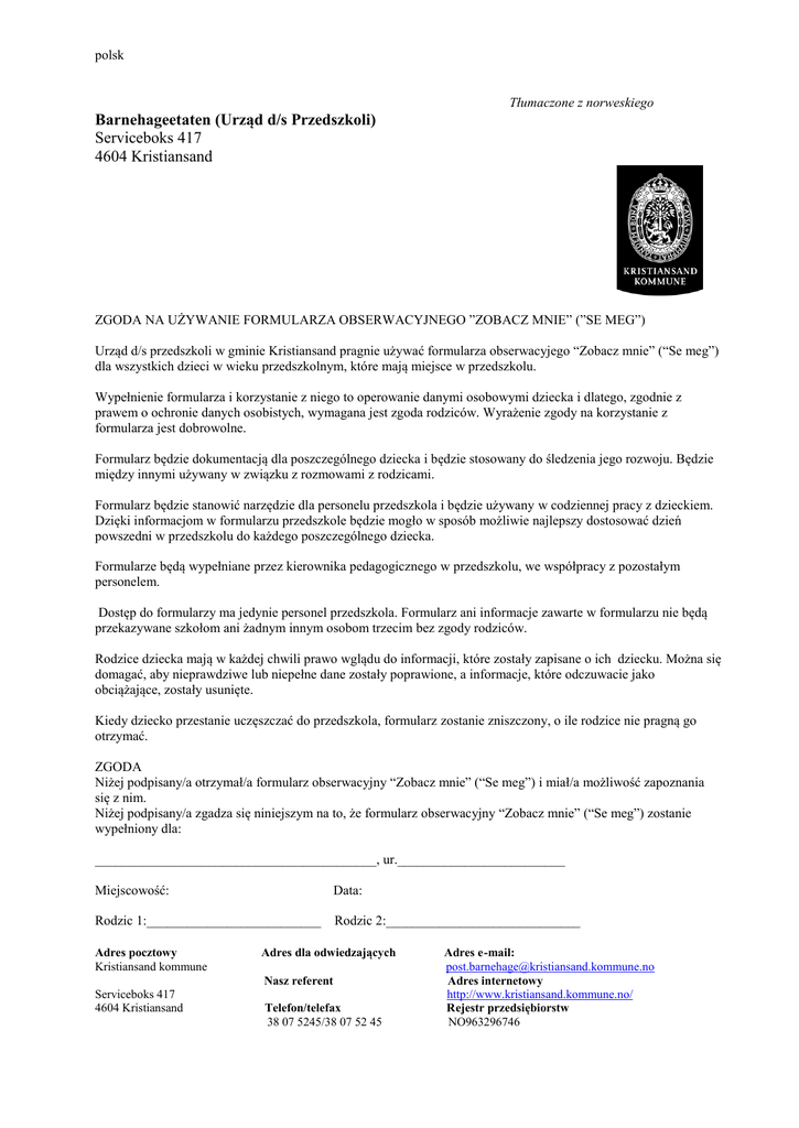 polsk Tłumaczone z norweskiego Barnehageetaten (Urząd d/s Przedszkoli) Serviceboks 417 4604 Kristiansand ZGODA NA UŻYWANIE FORMULARZA OBSERWACYJNEGO ”ZOBACZ MNIE” (”SE MEG”) Urząd d/s przedszkoli w gminie Kristiansand pragnie używać formularza obserwacyjego “Zobacz mnie” (“Se meg”) dla wszystkich dzieci w wieku przedszkolnym, które mają miejsce w przedszkolu. Wypełnienie formularza i korzystanie z niego to operowanie danymi osobowymi dziecka i dlatego, zgodnie z prawem o ochronie danych osobistych, wymagana jest zgoda rodziców. Wyrażenie zgody na korzystanie z formularza jest dobrowolne. Formularz będzie dokumentacją dla poszczególnego dziecka i będzie stosowany do śledzenia jego rozwoju. Będzie między innymi używany w związku z rozmowami z rodzicami. Formularz będzie stanowić narzędzie dla personelu przedszkola i będzie używany w codziennej pracy z dzieckiem. Dzięki informacjom w formularzu przedszkole będzie mogło w sposób możliwie najlepszy dostosować dzień powszedni w przedszkolu do każdego poszczególnego dziecka. Formularze będą wypełniane przez kierownika pedagogicznego w przedszkolu, we współpracy z pozostałym personelem. Dostęp do formularzy ma jedynie personel przedszkola. Formularz ani informacje zawarte w formularzu nie będą przekazywane szkołom ani żadnym innym osobom trzecim bez zgody rodziców. Rodzice dziecka mają w każdej chwili prawo wglądu do informacji, które zostały zapisane o ich dziecku. Można się domagać, aby nieprawdziwe lub niepełne dane zostały poprawione, a informacje, które odczuwacie jako obciążające, zostały usunięte. Kiedy dziecko przestanie uczęszczać do przedszkola, formularz zostanie zniszczony, o ile rodzice nie pragną go otrzymać. ZGODA Niżej podpisany/a otrzymał/a formularz obserwacyjny “Zobacz mnie” (“Se meg”) i miał/a możliwość zapoznania się z nim. Niżej podpisany/a zgadza się niniejszym na to, że formularz obserwacyjny “Zobacz mnie” (“Se meg”) zostanie wypełniony dla: __________________________________________, ur._________________________ Miejscowość: Data: Rodzic 1:__________________________ Rodzic 2:_____________________________ Adres pocztowy Kristiansand kommune Adres dla odwiedzających Nasz referent Serviceboks 417 4604 Kristiansand Telefon/telefax 38 07 5245/38 07 52 45 Adres e-mail: [email protected] Adres internetowy http://www.kristiansand.kommune.no/ Rejestr przedsiębiorstw NO963296746