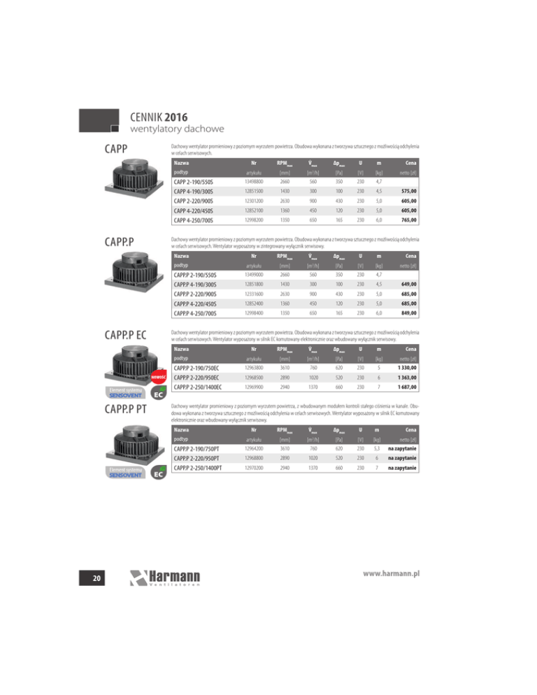 CENNIK 2016 wentylatory dachowe Dachowy wentylator promieniowy z poziomym wyrzutem powietrza. Obudowa wykonana z tworzywa sztucznego z możliwością odchylenia w celach serwisowych. CAPP Nazwa Nr RPMmax V̇max Δpmax U m Cena podtyp artykułu [mm] [m3/h] [Pa] [V] [kg] netto [zł] CAPP 2-190/550S CAPP 4-190/300S CAPP 2-220/900S CAPP 4-220/450S CAPP 4-250/700S 13498800 2660 560 350 230 4,7 12851500 1430 300 100 230 4,5 575,00 12301200 2630 900 430 230 5,0 605,00 12852100 1360 450 120 230 5,0 605,00 12998200 1350 650 165 230 6,0 765,00 Dachowy wentylator promieniowy z poziomym wyrzutem powietrza. Obudowa wykonana z tworzywa sztucznego z możliwością odchylenia w celach serwisowych. Wentylator wyposażony w zintegrowany wyłącznik serwisowy. CAPP.P Nazwa Nr RPMmax V̇max Δpmax U m Cena podtyp artykułu [mm] [m3/h] [Pa] [V] [kg] netto [zł] CAPP.P 2-190/550S CAPP.P 4-190/300S CAPP.P 2-220/900S CAPP.P 4-220/450S CAPP.P 4-250/700S 13499000 2660 560 350 230 4,7 12851800 1430 300 100 230 4,5 649,00 12331600 2630 900 430 230 5,0 685,00 12852400 1360 450 120 230 5,0 685,00 12998400 1350 650 165 230 6,0 849,00 Dachowy wentylator promieniowy z poziomym wyrzutem powietrza. Obudowa wykonana z tworzywa sztucznego z możliwością odchylenia w celach serwisowych. Wentylator wyposażony w silnik EC komutowany elektronicznie oraz wbudowany wyłącznik serwisowy. CAPP.P EC NOWOŒÆ Nazwa Nr RPMmax V̇max Δpmax U m Cena podtyp artykułu [mm] [m3/h] [Pa] [V] [kg] netto [zł] CAPP.P 2-190/750EC CAPP.P 2-220/950EC CAPP.P 2-250/1400EC 12963800 3610 760 620 230 5 1 330,00 12968500 2890 1020 520 230 6 1 363,00 12969900 2940 1370 660 230 7 1 687,00 EC Dachowy wentylator promieniowy z poziomym wyrzutem powietrza, z wbudowanym modułem kontroli stałego ciśnienia w kanale. Obudowa wykonana z tworzywa sztucznego z możliwością odchylenia w celach serwisowych. Wentylator wyposażony w silnik EC komutowany elektronicznie oraz wbudowany wyłącznik serwisowy. CAPP.P PT EC 20 Nazwa Nr RPMmax V̇max Δpmax U m Cena podtyp artykułu [mm] [m3/h] [Pa] [V] [kg] netto [zł] CAPP.P 2-190/750PT CAPP.P 2-220/950PT CAPP.P 2-250/1400PT 12964200 3610 760 620 230 5,3 na zapytanie 12968800 2890 1020 520 230 6 na zapytanie 12970200 2940 1370 660 230 7 na zapytanie CENNIK 2016 wentylatory dachowe Dachowy wentylator promieniowy z poziomym wyrzutem powietrza. Obudowa wykonana z aluminium. Nazwa Nr RPMmax V̇max Δpmax podtyp artykułu [mm] [m3/h] VIVO 2-190/500S VIVO 4-190/250S VIVO 2-220/900S VIVO 4-220/450S VIVO 4-250/750S VIVO 4-280/1300S VIVO 4-315/1900S VIVO 4-355/3000S VIVO 4-400/4300S VIVO 4-450/5800T VIVO 4-500/9200T VIVO 4-560/11900T 13045300 2670 500 13045500 1440 270 VIVO U m Cena [Pa] [V] [kg] netto [zł] 350 230 4,5 675,00 100 230 4,5 659,00 13182600 2760 890 490 230 4,9 762,00 13178900 1400 450 130 230 5,0 762,00 13045000 1390 740 160 230 5,4 860,00 13010100 1390 1270 200 230 7,9 1 139,00 13185200 1400 1885 260 230 7,8 1 379,00 13108900 1455 3020 380 230 18,5 2 131,00 13109200 1450 4335 480 230 22,6 2 560,00 13109500 1400 5870 570 230 34,8 3 054,00 13110100 1455 9240 900 400 40,0 3 803,00 13110400 1450 11950 780 400 57,0 5 211,00 Dachowy wentylator promieniowy z poziomym wyrzutem powietrza. Obudowa wykonana z aluminium. Wentylator wyposażony w zintegrowany wyłącznik serwisowy. Nazwa Nr RPMmax V̇max Δpmax U m Cena podtyp artykułu [mm] [m3/h] VIVO.P 2-190/500S VIVO.P 4-190/250S VIVO.P 2-220/900S VIVO.P 4-220/450S VIVO.P 4-250/750S VIVO.P 4-280/1300S VIVO.P 4-315/1900S VIVO.P 4-355/3000S VIVO.P 4-400/4300S VIVO.P 4-450/5800T VIVO.P 4-500/9200T VIVO.P 4-560/11900T 13053200 2670 500 [Pa] [V] [kg] netto [zł] 350 230 4,6 13046900 2760 890 913,00 490 230 5,0 889,00 13182900 1400 450 130 230 5,0 1 045,00 13179200 1440 270 100 230 4,6 1 045,00 13044700 1390 740 160 230 5,6 1 201,00 13010700 1390 200 200 230 7,9 1 482,00 13185500 1400 1885 260 230 7,8 1 747,00 13110700 1450 2980 370 230 18,5 2 308,00 13111000 1460 4300 490 230 20,0 2 776,00 13111300 1400 5800 590 400 27,0 3 837,00 13111600 1440 9200 790 400 40,0 4 617,00 13111900 1460 11900 950 400 57,0 5 958,00 VIVO.P Dachowy wentylator promieniowy z poziomym wyrzutem powietrza. Obudowa wykonana z aluminium. Wentylator wyposażony w silnik EC komutowany elektronicznie. Nazwa Nr RPMmax V̇max Δpmax U Cena podtyp artykułu [mm] [m3/h] [Pa] [V] netto [zł] VIVO 2-190/650EC VIVO 2-220/1000EC VIVO 2-250/1300EC VIVO 2-280/2000EC 13122500 3650 670 650 230 1 185,00 13122800 2900 1000 530 230 1 217,00 13123100 2760 1380 600 230 1 560,00 13123400 2900 2015 790 230 1 747,00 Cennik obowiązuje od dnia 4.07.2016 VIVO EC NOWOŒÆ EC 21 CENNIK 2016 wentylatory dachowe Ciąg dalszy VIVO EC. Nazwa Nr RPMmax V̇max Δpmax U Cena podtyp artykułu [mm] [m3/h] [Pa] [V] netto [zł] VIVO 4-355/3100EC VIVO 4-400/5400EC VIVO 4-450/6200EC VIVO 4-500/9600TEC VIVO 4-560/13100TEC VIVO 4-630/16200TEC 1540 3100 430 230 2 558,00 1960 5430 850 230 4 024,00 13124300 1530 6230 630 230 4 804,00 13124600 1590 9650 1070 400 7 237,00 13124900 1540 13100 880 400 7 580,00 13125200 1330 16280 845 400 8 391,00 Dachowy wentylator promieniowy z poziomym wyrzutem powietrza. Obudowa wykonana z aluminium. Wentylator wyposażony w silnik EC komutowany elektronicznie oraz wbudowany wyłącznik serwisowy. VIVO.P EC NOWOŒÆ EC VIVER 13123700 13124000 Nazwa Nr RPMmax V̇max Δpmax U Cena podtyp artykułu [mm] [m3/h] [Pa] [V] netto [zł] VIVO.P 2-190/650EC VIVO.P 2-220/1000EC VIVO.P 2-250/1300EC VIVO.P 2-280/2000EC VIVO.P 4-355/3100EC VIVO.P 4-400/5400EC VIVO.P 4-450/6200EC VIVO.P 4-500/9600TEC VIVO.P 4-560/13100TEC VIVO.P 4-630/16200TEC 13125500 3650 670 650 230 1 435,00 13125800 2900 1000 530 230 1 466,00 13126100 2760 1380 600 230 1 840,00 13126400 2900 2015 790 230 1 996,00 13126700 1540 3100 430 230 2 963,00 13127000 1960 5430 850 230 4 492,00 13127300 1530 6230 630 230 5 209,00 13127600 1590 9650 1070 400 7 767,00 13127900 1540 13100 880 400 8 079,00 13128200 1330 16280 845 400 9 015,00 Dachowy wentylator promienio