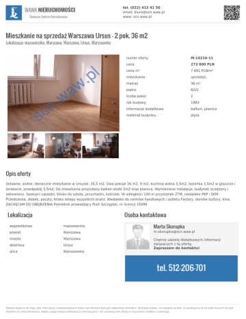 Mieszkanie na sprzedaż Warszawa Ursus 36m2 - oferta M-14216-11
