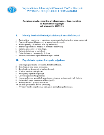 Wyższa Szkoła Informatyki i Ekonomii TWP w Olsztynie WYDZIAŁ SOCJOLOGII I PEDAGOGIKI ___________________________________________ Zagadnienia do egzaminu dyplomowego - licencjackiego na kierunku Socjologia rok akademicki 2015/2016 I. 1. 2. 3. 4. 5. 6. 7. 8. II. Metody i techniki badań jakościowych oraz ilościowych Racjonalizm i empiryzm - odmienne sposoby dochodzenia do wiedzy naukowej. Odrębność sytuacji badawczej w naukach społecznych. Różne sposoby rozumienia metody badawczej. Interdyscyplinarność podejść w metodzie badawczej. Badania jakościowe w socjologii. Badania ilościowe w socjologii. Próba badawcza i sposoby jej doboru Elementy składowe raportu końcowego z badań. Zagadnienia ogólne; kategorie pojęciowe 1. Socjologia jako nauka społeczna. Przedmiot badań. 2. Socjologia a inne nauki społeczne. 3. Socjologiczne koncepcje więzi społecznej. 4. Wielkie teorie socjologiczne. 5. Praktyczny wymiar socjologii. 6. Człowiek jako istota społeczna. 7. Grupa społeczna; przykłady podstawowych grup społecznych i ich funkcje. 8. Jednostka i grupa społeczna (różne ujęcia). 9. Rola społeczna i pozycja społeczna. 10. Zmiana społeczna a proces społeczny. 11. Wymiary kontroli społecznej (relacja do porządku społecznego). Wyższa Szkoła Informatyki i Ekonomii TWP w Olsztynie WYDZIAŁ SOCJOLOGII I PEDAGOGIKI ___________________________________________ III. Zagadnienia specjalnościowe spec. Socjologia bezpieczeństwa publicznego 1. Zagrożenia dla bezpieczeństwa publicznego na tle całokształtu zagrożeń dla państwa i społeczeństwa. 2. Obszary bezpieczeństwa publicznego według różnych kryteriów klasyfikacji. 3. Podstawowe rodzaje zagrożeń dla bezpieczeństwa publicznego powodowane przez procesy migracyjne poszczególnych rodzajów. 4. Struktura odpowiedzialności za bezpieczeństwo publiczne w podziale na administrację rządową, samorządową i sektor pozarządowy. 5. Zarządzanie kryzysowe: cele i sposoby realizacji. 6. Zarządzanie jakością funkcjonowania instytucji bezpieczeństwa publicznego. 7. Charakterystyka ponadnarodowych struktur zarządzających bezpieczeństwem publicznym. 8. Podstawowe rodzaje przestępczości: charakterystyka, stopień nasilenia, dynamika i metody zapobiegania. 9. Rola mediów w bezpieczeństwie publicznym: optymalna i realna. 10. Bezpieczeństwo a prawa i wolności obywatelskie: charakterystyka dylematu i podejścia do jego rozwiązania. 11. Migracja a zmiany kulturowe (i społeczne) obserwowane w państwach UE i w Polsce. 12. Cechy komunikowania się w instytucjach totalnych (np. armia, straż graniczna). Wykaz literatury zalecanej do opracowania zagadnień na egzamin licencjacki na kierunku Socjologia I stopnia Aronson Elliot (1999): Człowiek istota społeczna. Warszawa Babbie Earl (2007): Badania społeczne w praktyce. Warszawa Bauman Zygmunt (2000): Globalizacja i co z tego dla ludzi wynika. Warszawa Dylus Aniela (2005): Globalizacja. Wrocław Nowak Stefan (2002): Metodologia badań socjologicznych: zagadnienia ogólne. Warszawa Nowak Stefan (1985): Metodologia badań społecznych. Warszawa Sosnowski Adam, Ziemianin Bronisław (1991): Samorząd terytorialny w nowych warunkach ustrojowych. Warszawa Sosnowski Adam, Różnorodność życia społecznego, (2000) Wyd. naukowe ZSB, Szczecin Sosnowski Adam (2002): Wyznaczniki zmiany społecznej: młodzież - lokalność transformacja. Szczecin Szacka Barbara (2008): Wprowadzenie do socjologii. Warszawa Szacki Jerzy (2002): Historia myśli socjologicznej. Wydanie nowe. Warszawa Sztompka Piotr (2002): Socjologia. Analiza społeczeństwa. Kraków Sztompka Piotr: red. (1999): Imponderabilia wielkiej zmiany. Warszawa Witkowska Marta: red. (2005): Społeczeństwo obywatelskie. Warszawa