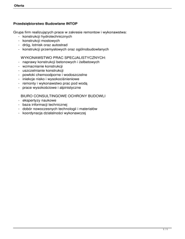 Oferta Przedsiębiorstwo Budowlane INTOP Grupa firm realizujących prace w zakresie remontow i wykonawstwa: - konstrukcji hydrotechnicznych - konstrukcji mostowych - dróg, lotnisk oraz autostrad - konstrukcji przemysłowych oraz ogólnobudowlanych - WYKONAWSTWO PRAC SPECJALISTYCZNYCH: naprawy konstrukcji betonowych i żelbetowych wzmacnianie konstrukcji uszczelnianie konstrukcji powłoki chemoodporne i wodoszczelne iniekcje nisko i wysokociśnieniowe remonty i wykonawstwo prac pod wodą prace wysokościowe i alpinistyczne - BIURO CONSULTINGOWE OCHRONY BUDOWLI ekspertyzy naukowe baza informacji technicznej dobór nowoczesnych technologii i materiałów koordynacja działalności wykonawczej 1/1